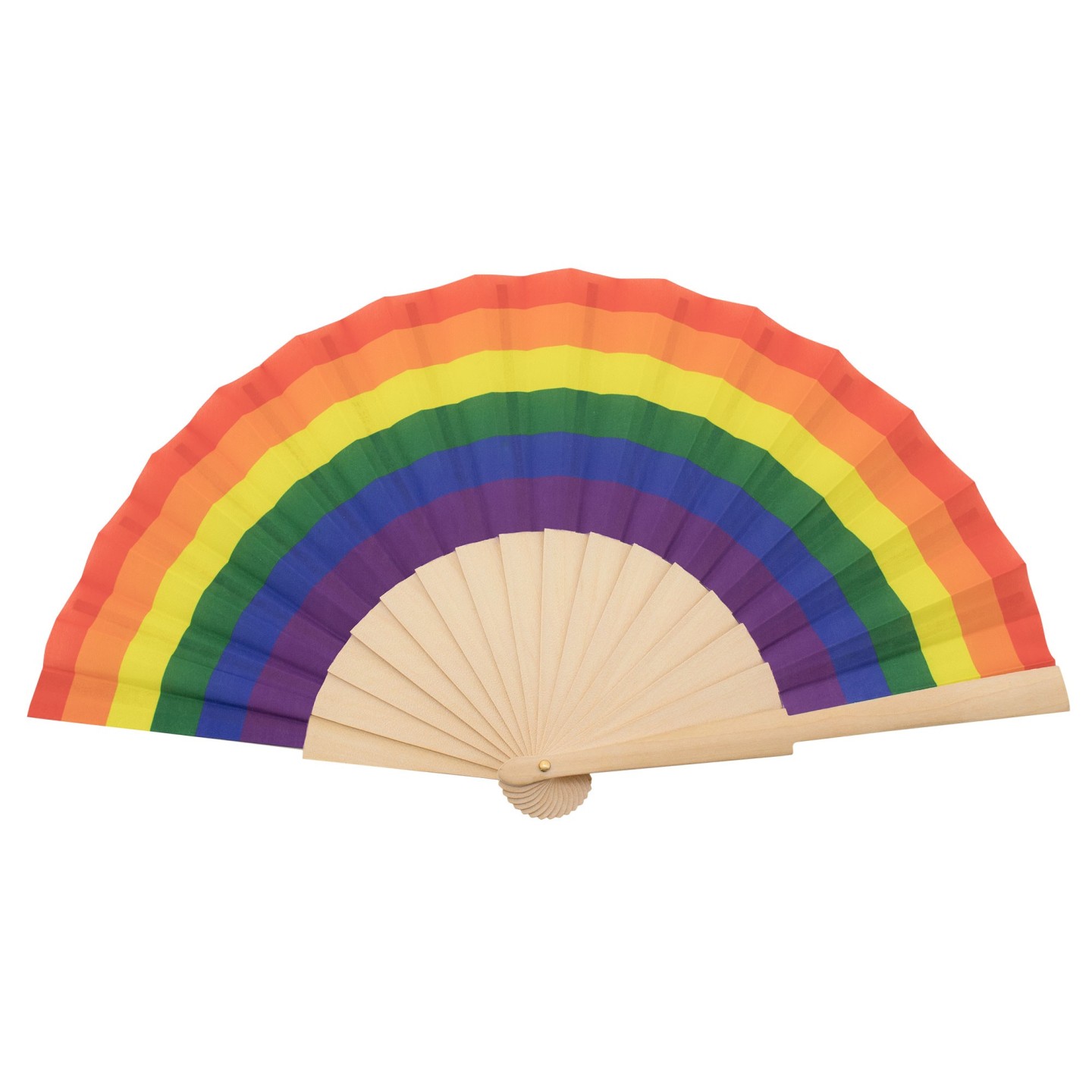 Abanico con 16 varillas de madera y país de poliéster. Presentado en caja plateada. Ideal para eventos LGBTi y promociones