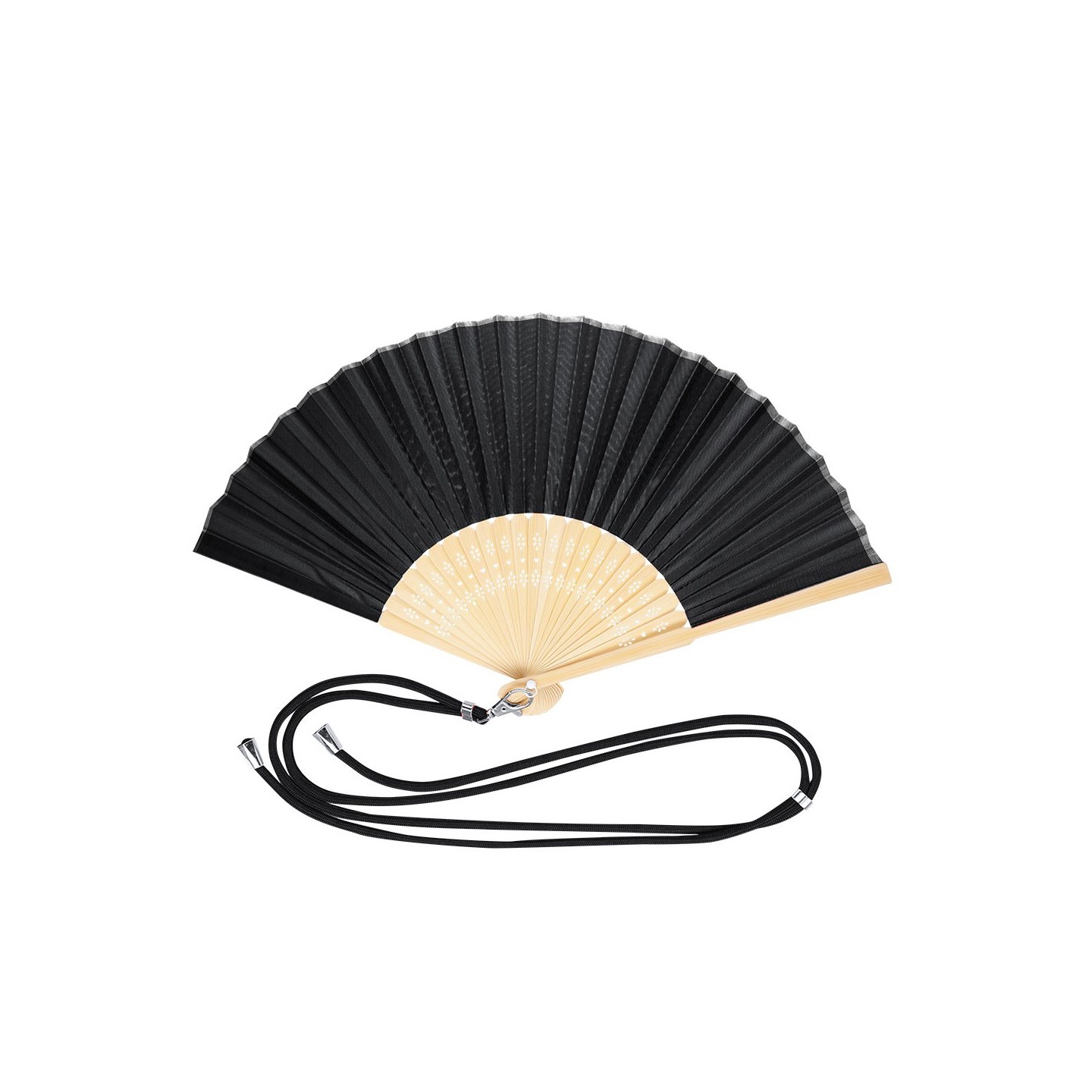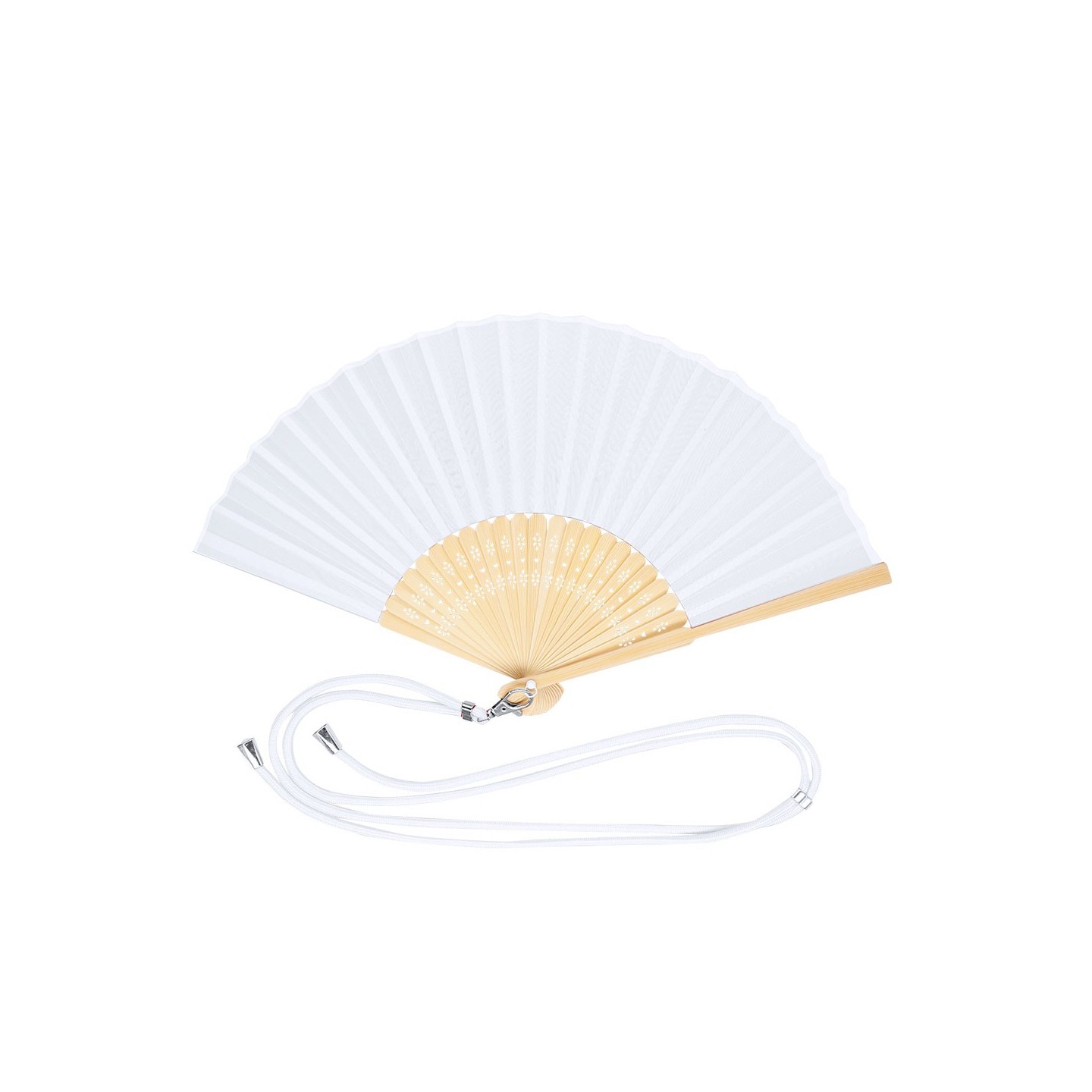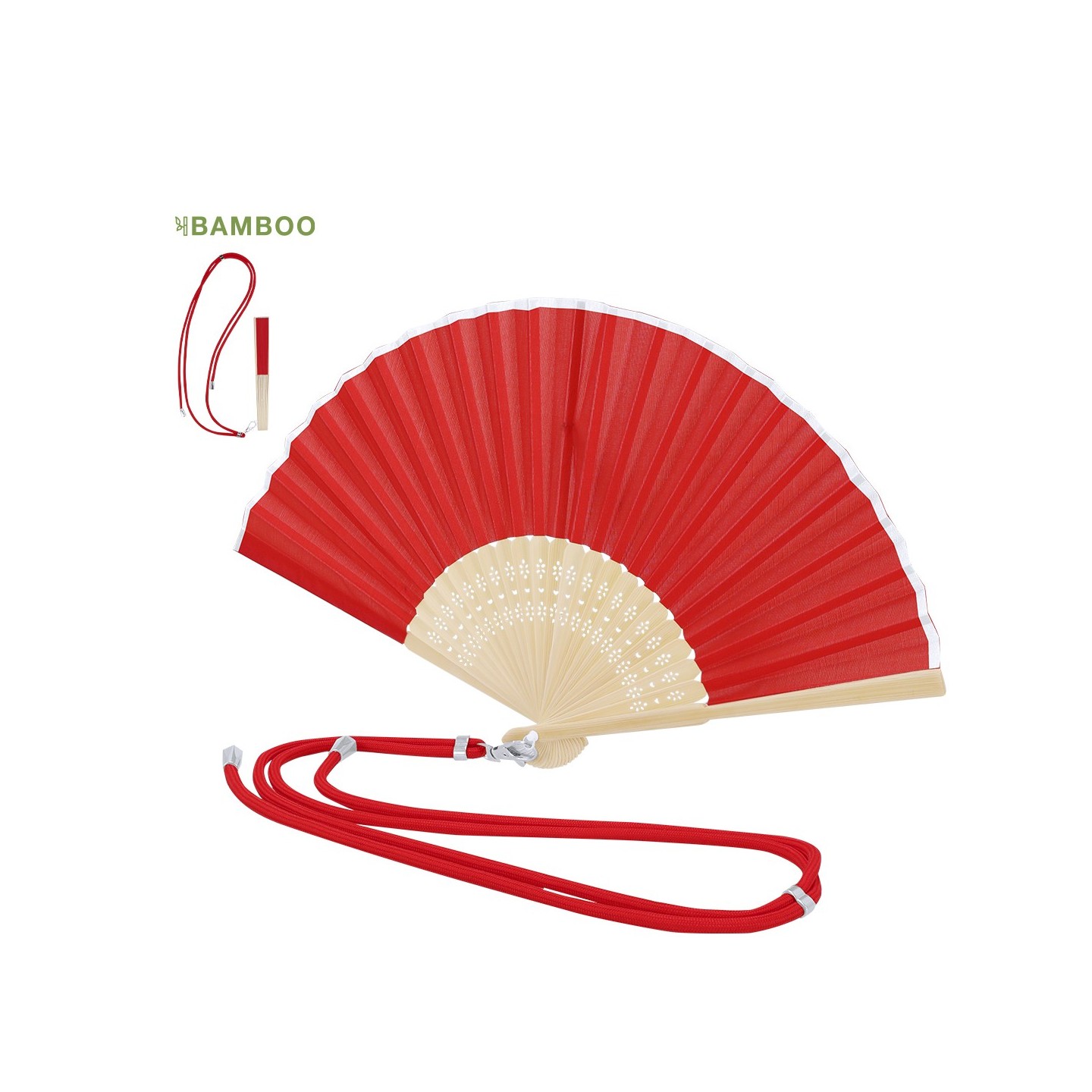 Abanico YANEX, hecho de poliéster 190T y bambú flexible, con cordón ajustable y mosquetón para fácil transporte. Ecológico, ligero (40 gr) y personalizable con tu logotipo.