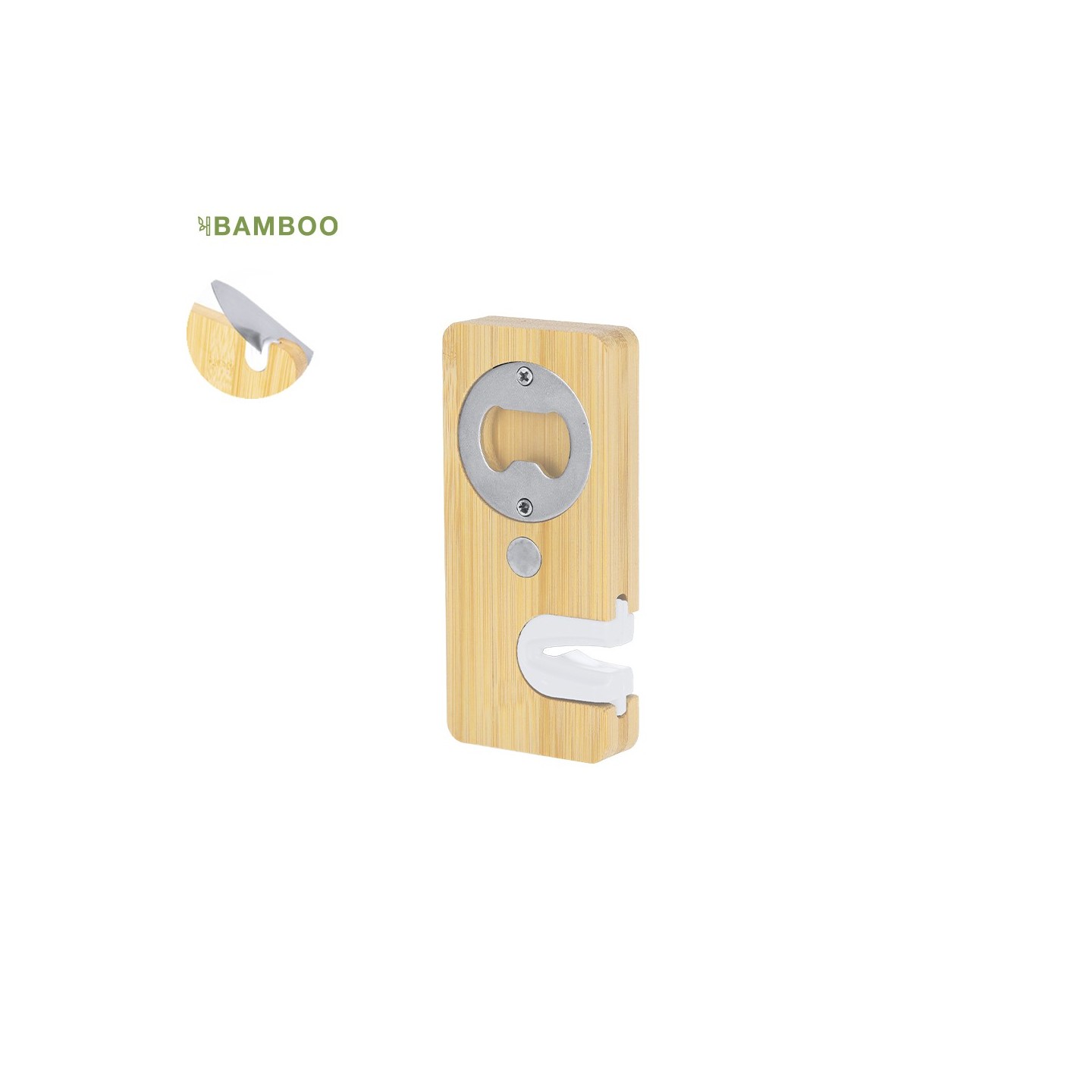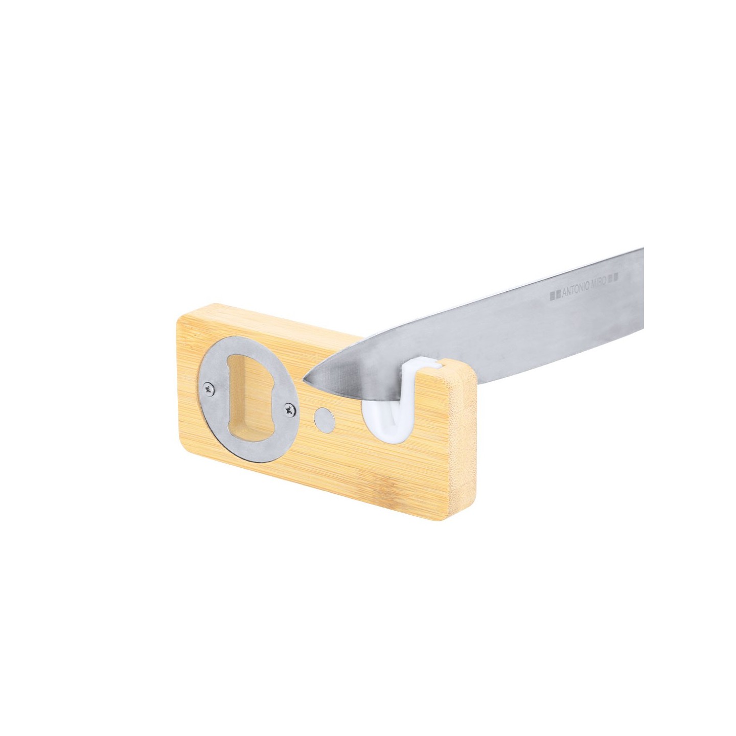 Abridor Afilador STOWEL 2 en 1, hecho de bambú ecológico. Incluye afilador de cuchillos, abridor de botellas e imán para fácil almacenamiento. Ligero (50 gr) y personalizable con tu logotipo.