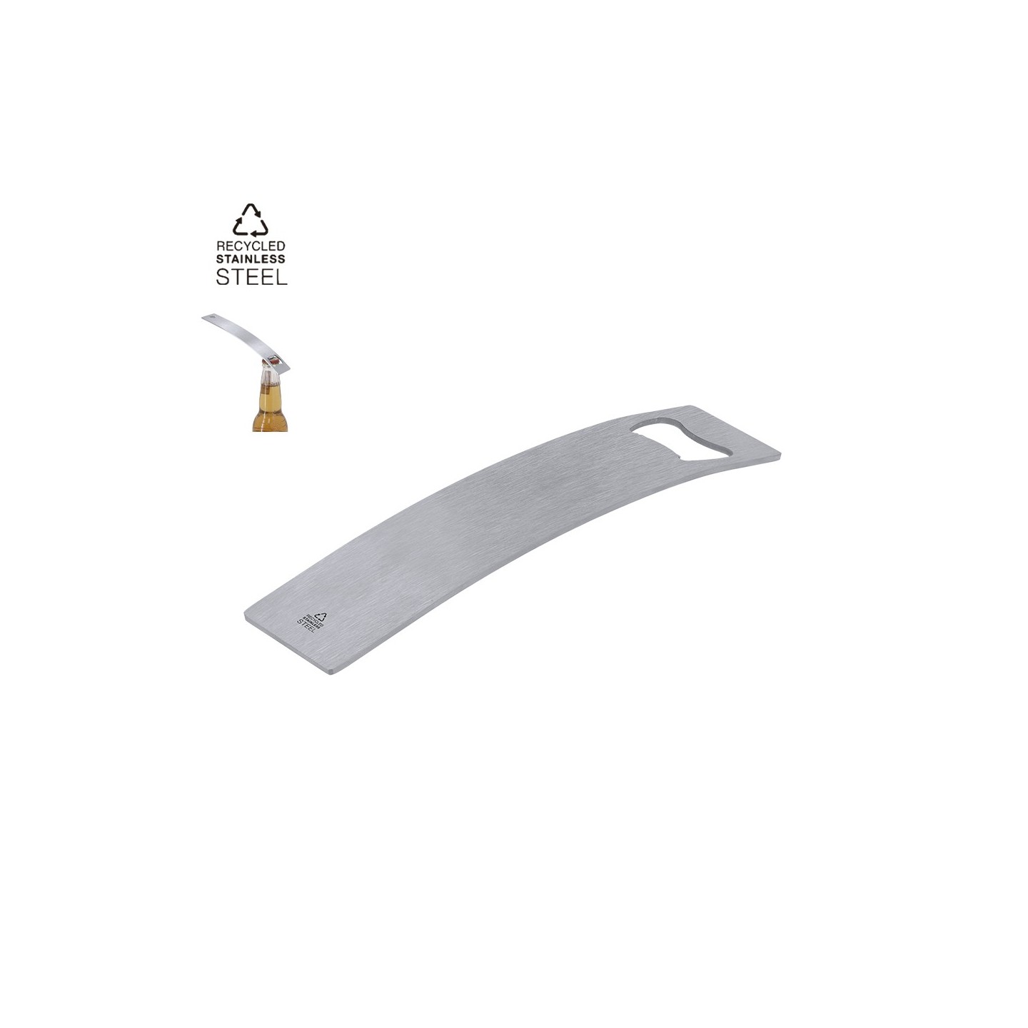 Abridor AZARIA de acero inoxidable reciclado, moderno y ecológico. Ligero (65 gr), práctico y personalizable con tu logotipo. Perfecto para promociones sostenibles.