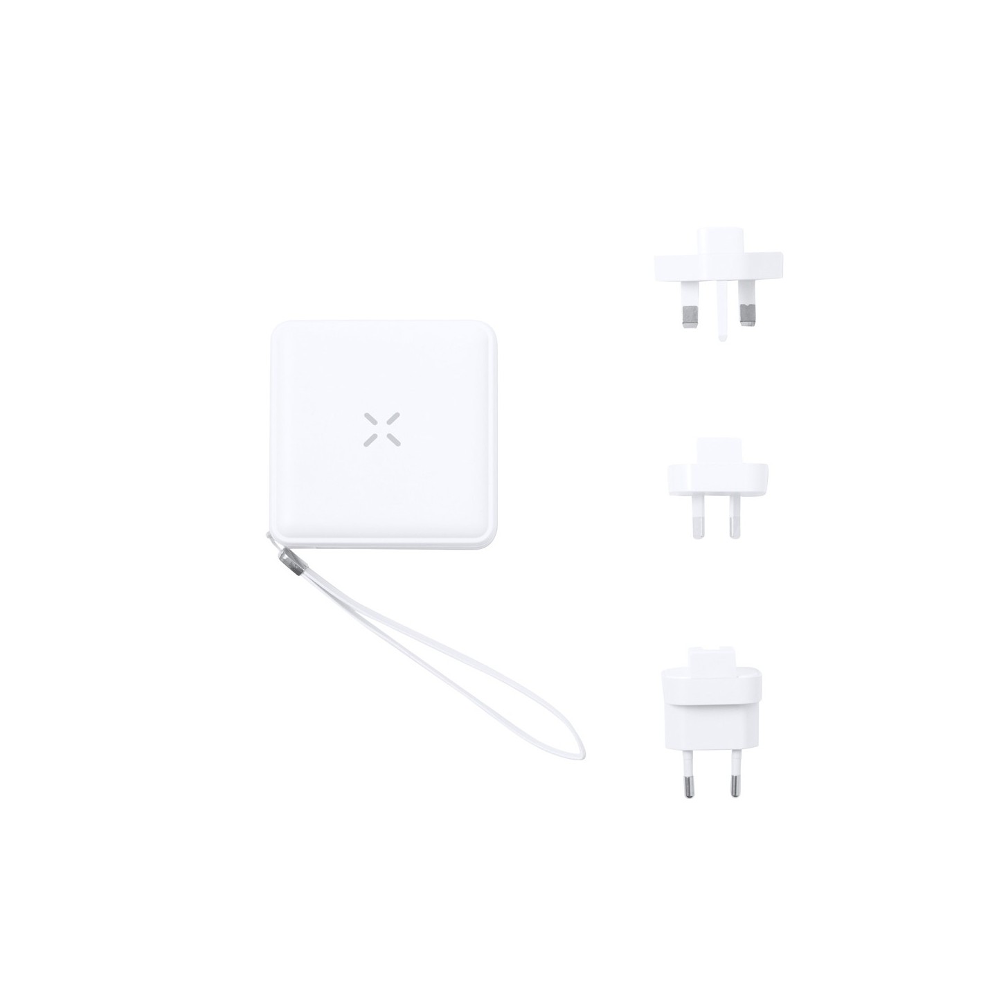 El Adaptador Viaje Multifunción Joks es la solución definitiva para tus necesidades de carga mientras estás en movimiento. Este innovador dispositivo combina la funcionalidad de un adaptador de viaje con las características de un powerbank integrado de 10.000 mAh, todo en un elegante diseño en color blanco con una amplia superficie de marcaje para personalizar con tu logotipo.