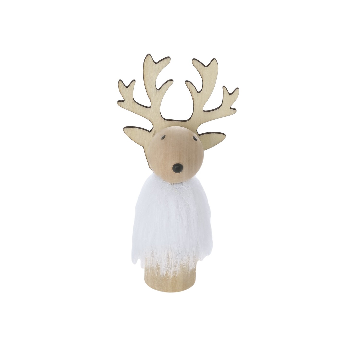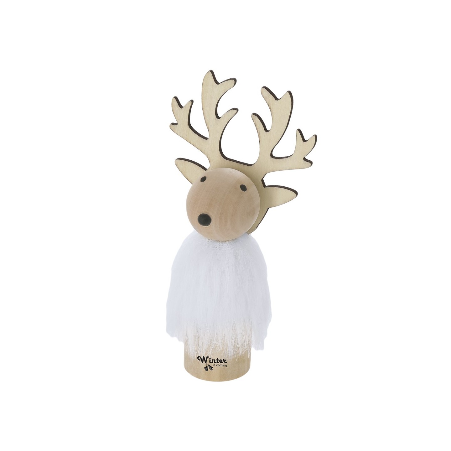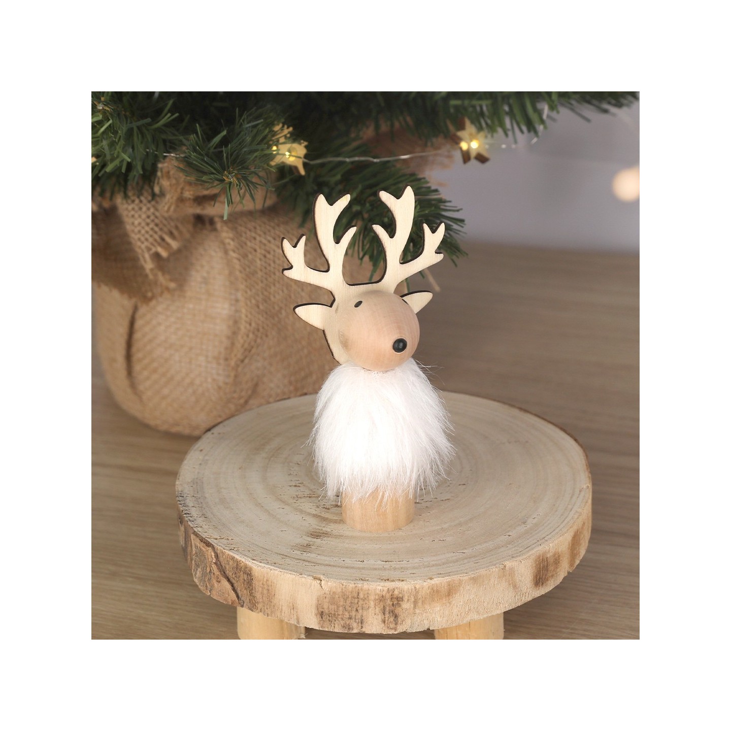 Adorno navideño en madera y pelaje blanco. Base especial para marcaje personalizado con logotipo. Fabricado con materiales vegetales, ideal para regalos corporativos sostenibles.