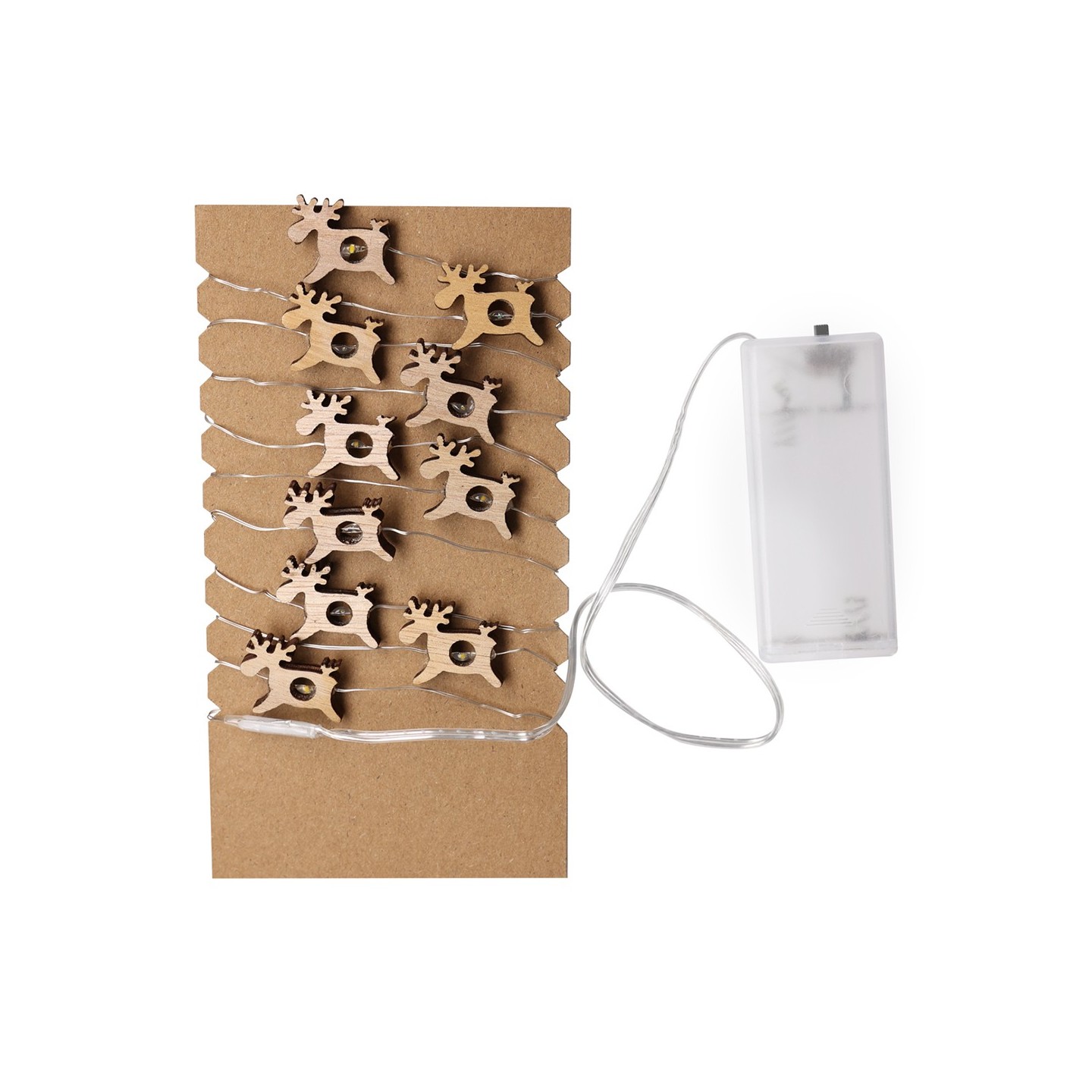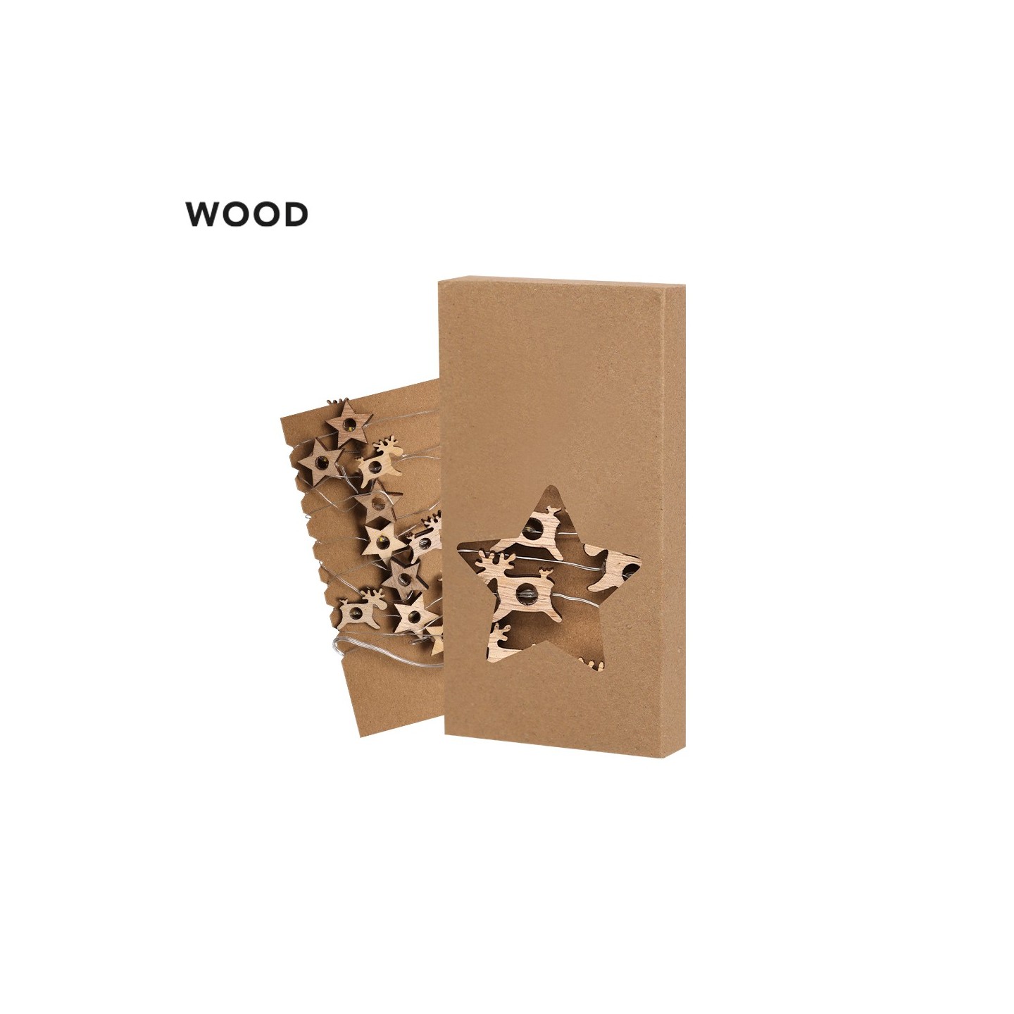 El Adorno Plentox es una guirnalda iluminada de madera natural con formas de estrella y reno. Personalizable y con 20 LEDs, ideal para decorar y regalar.