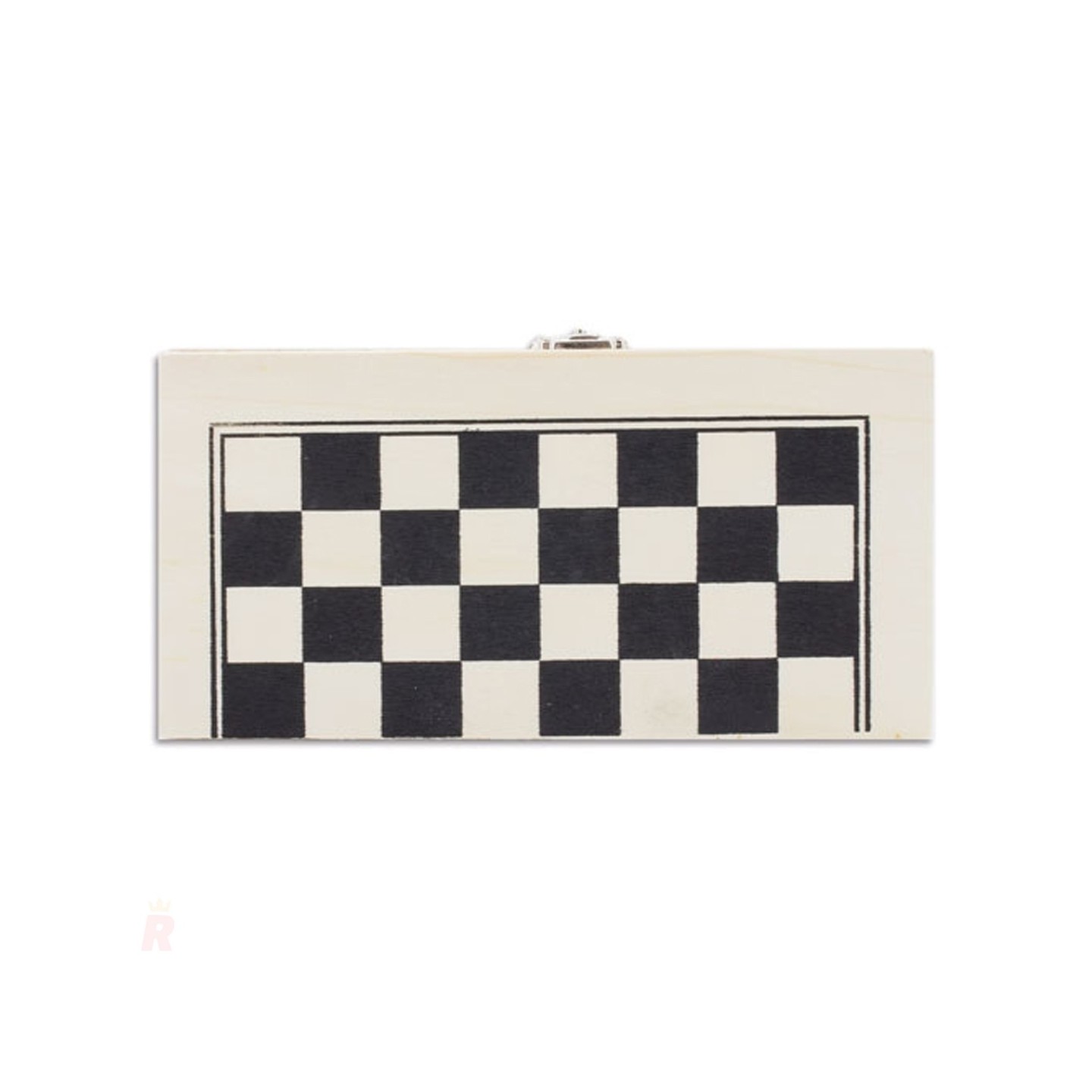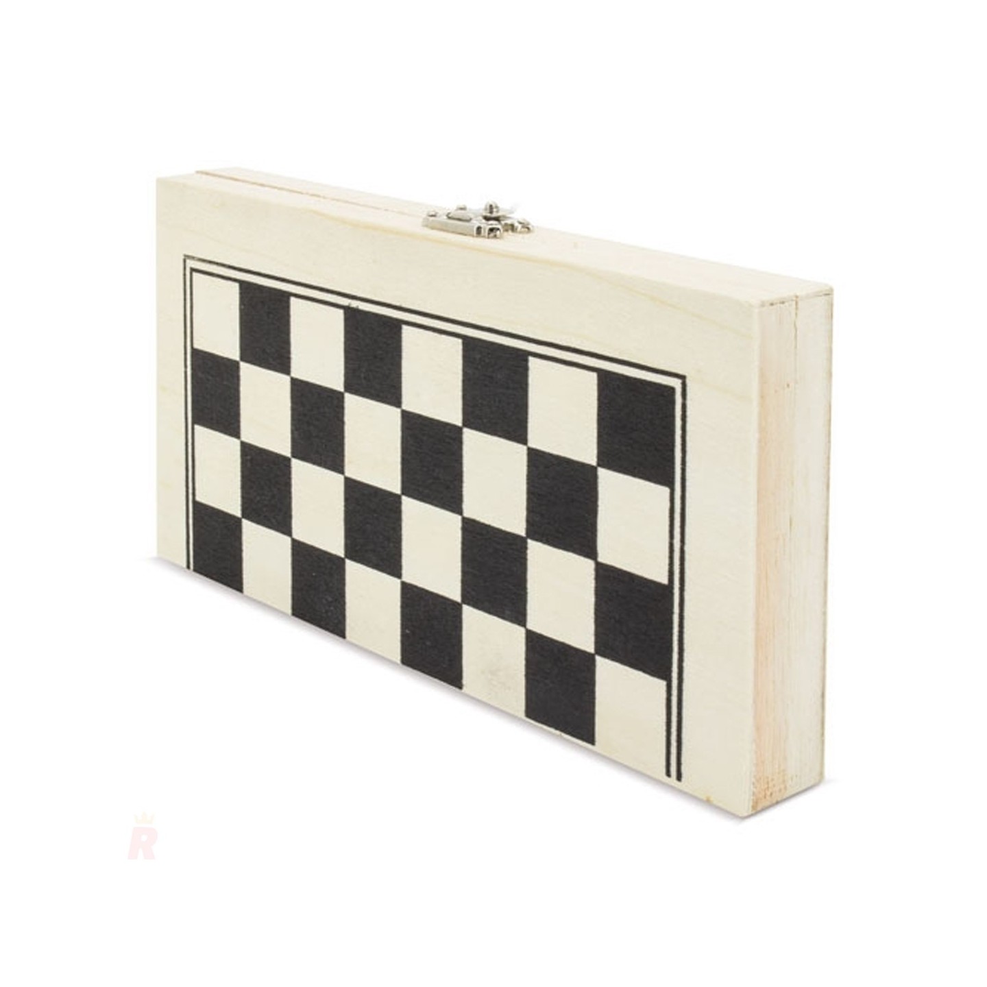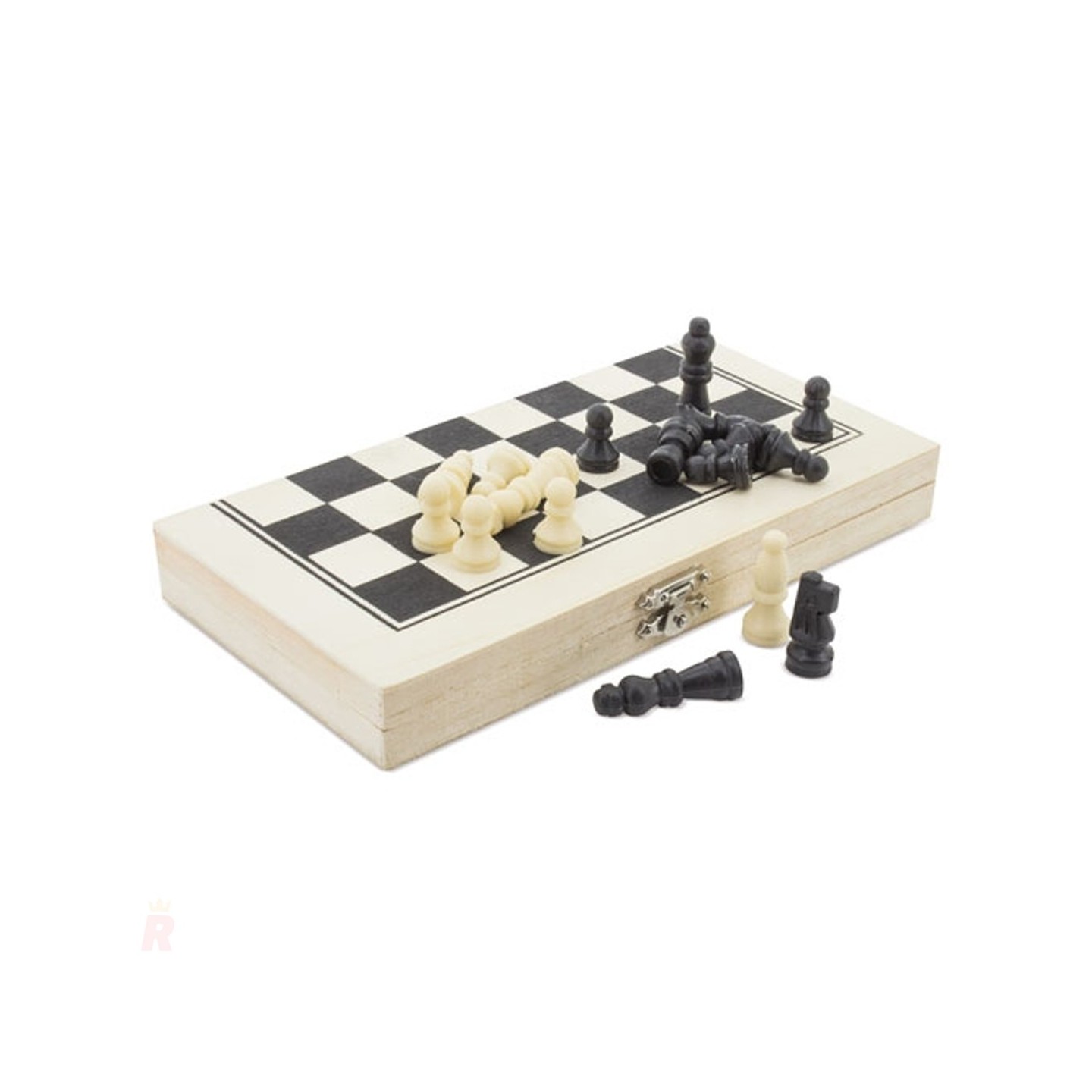 Elegante ajedrez de madera con estuche plegable y piezas de plástico resistente. Ideal para transportar y almacenar. Personalizable para promociones y regalos corporativos