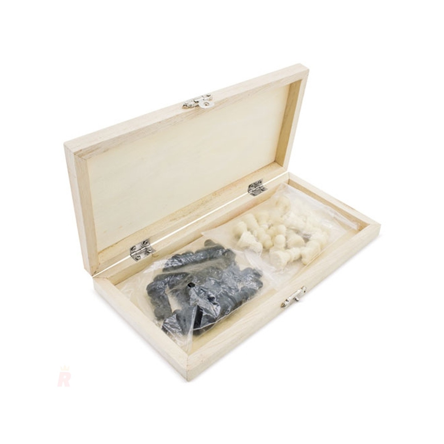 Con un estilo clásico, el tablero de ajedrez presenta un diseño de cuadros en blanco y negro, con un acabado elegante que le da un toque sofisticado. El estuche de madera también está diseñado con compartimentos internos que permiten guardar las piezas de manera ordenada y segura, evitando que se pierdan o se dañen.