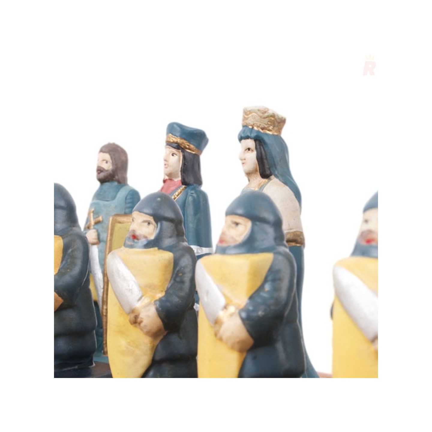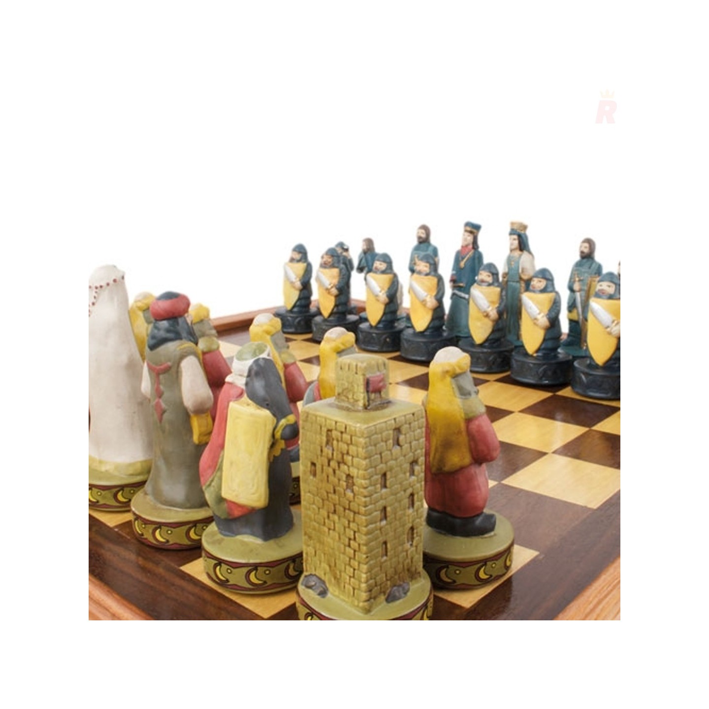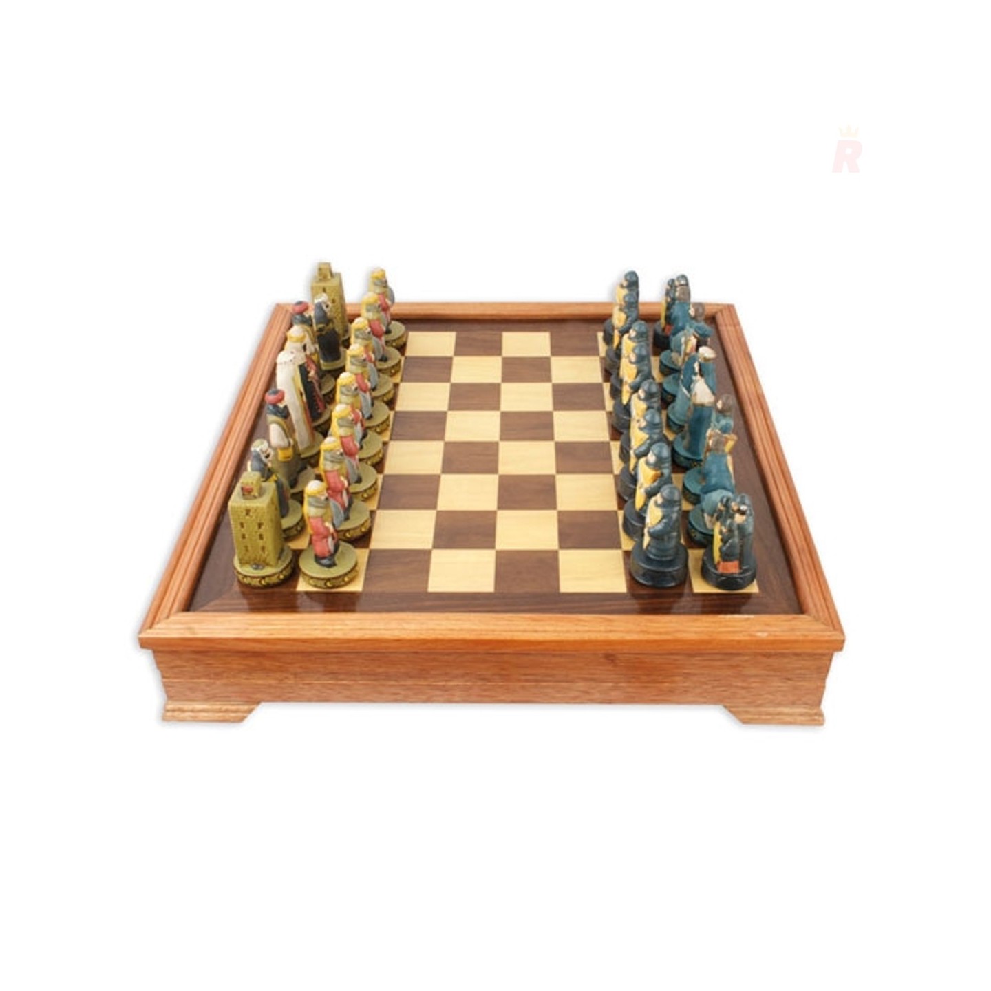Ajedrez temático inspirado en los Reyes Católicos de España, con piezas esculpidas y pintadas a mano. Ideal para coleccionistas y personalizable para empresas