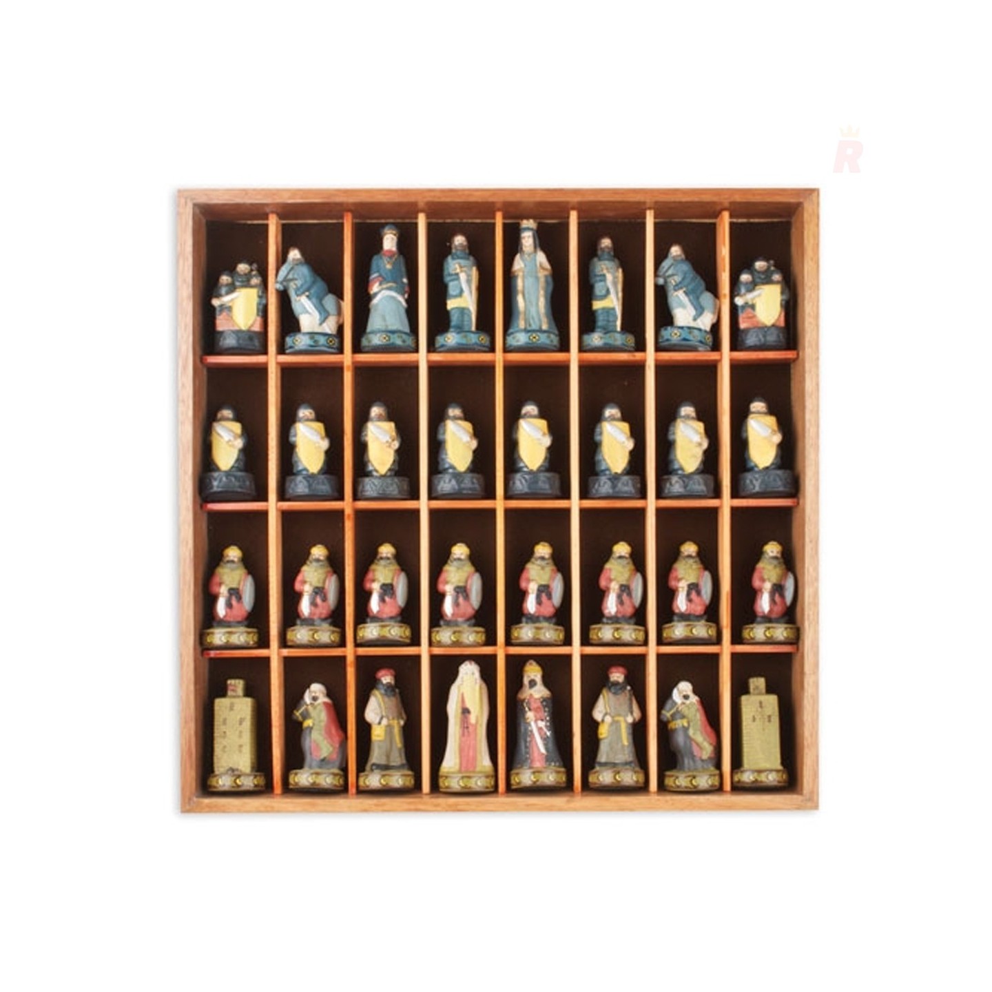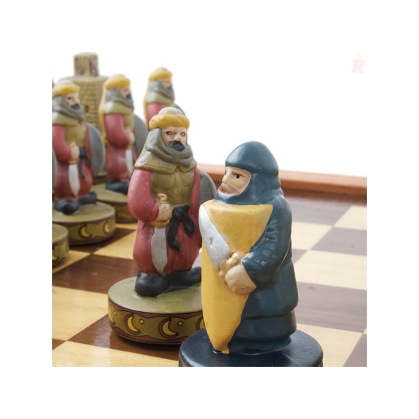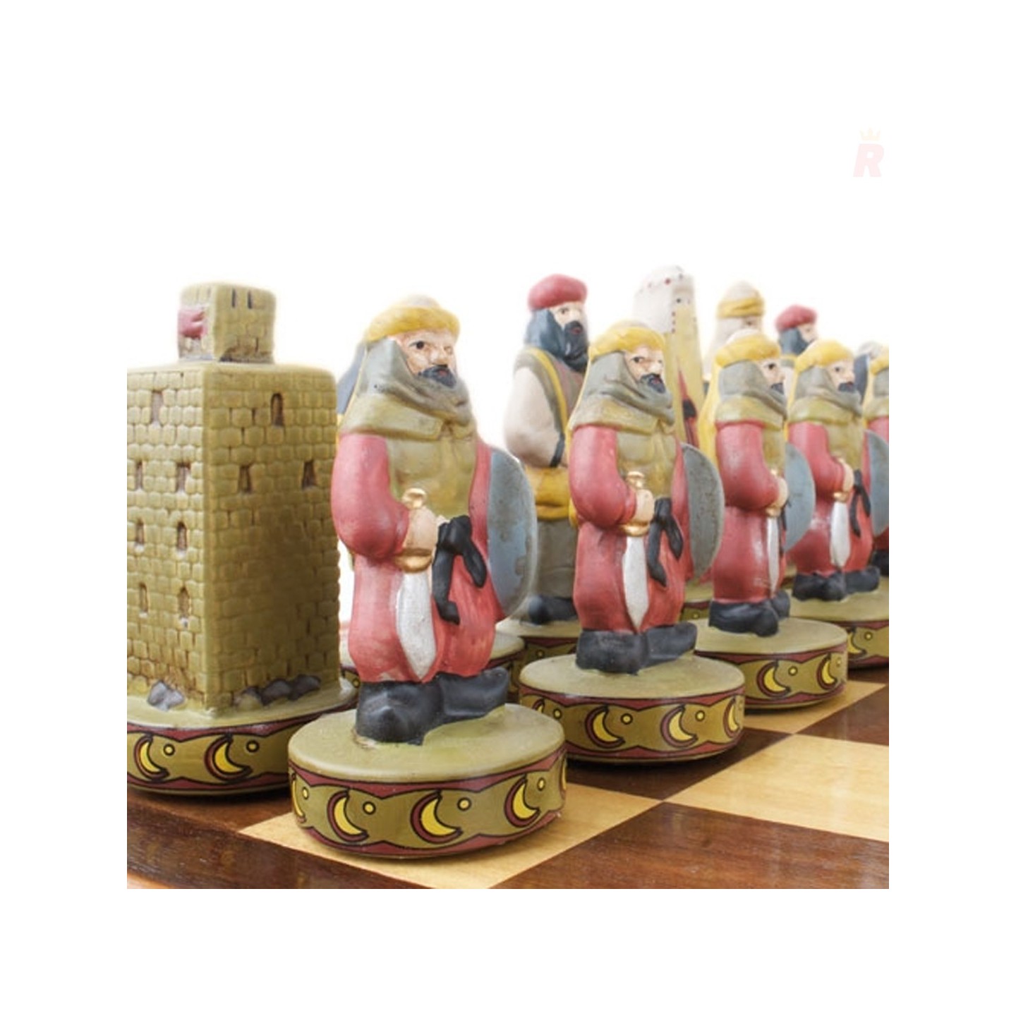 Ajedrez temático inspirado en los Reyes Católicos de España, con piezas esculpidas y pintadas a mano. Ideal para coleccionistas y personalizable para empresas