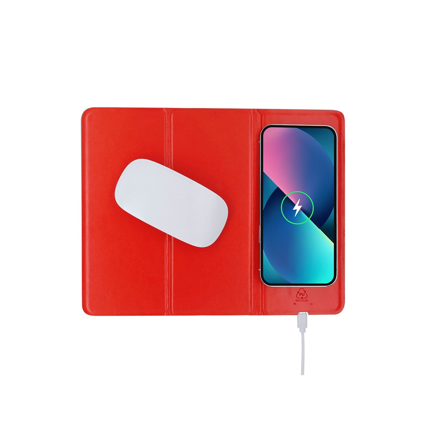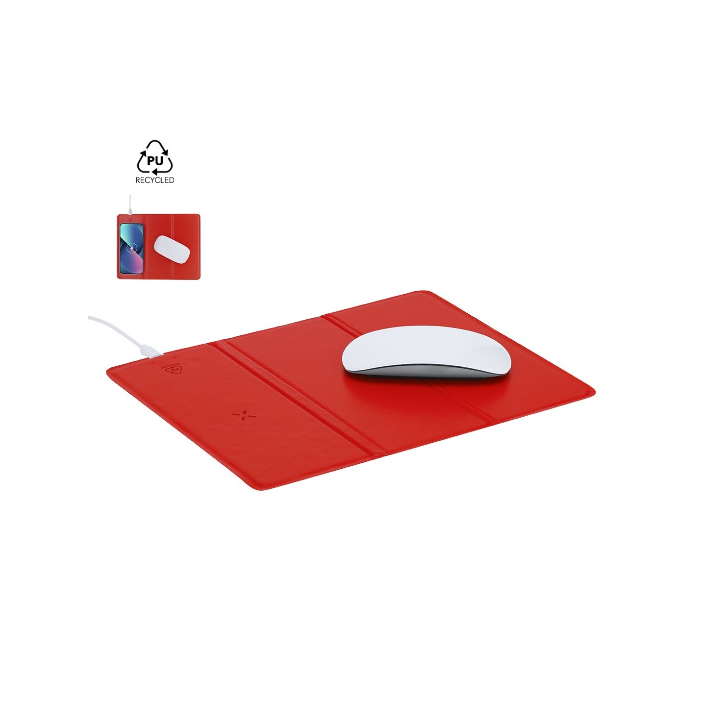 La Alfombrilla Cargador Dangox, fabricada en PU Reciclada, incluye cargador inalámbrico de 10W, soporte para smartphone y es personalizable. ¡Sostenible y elegante!
