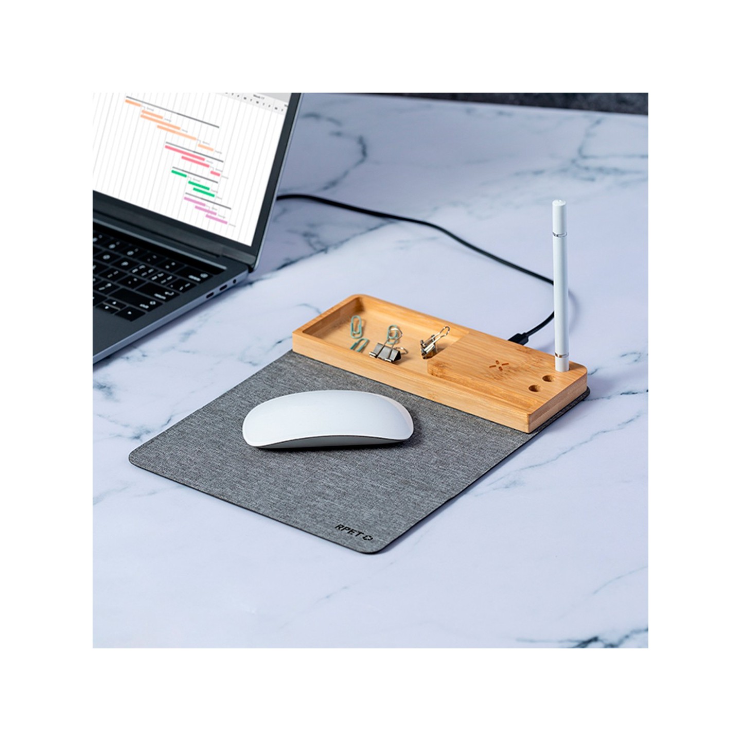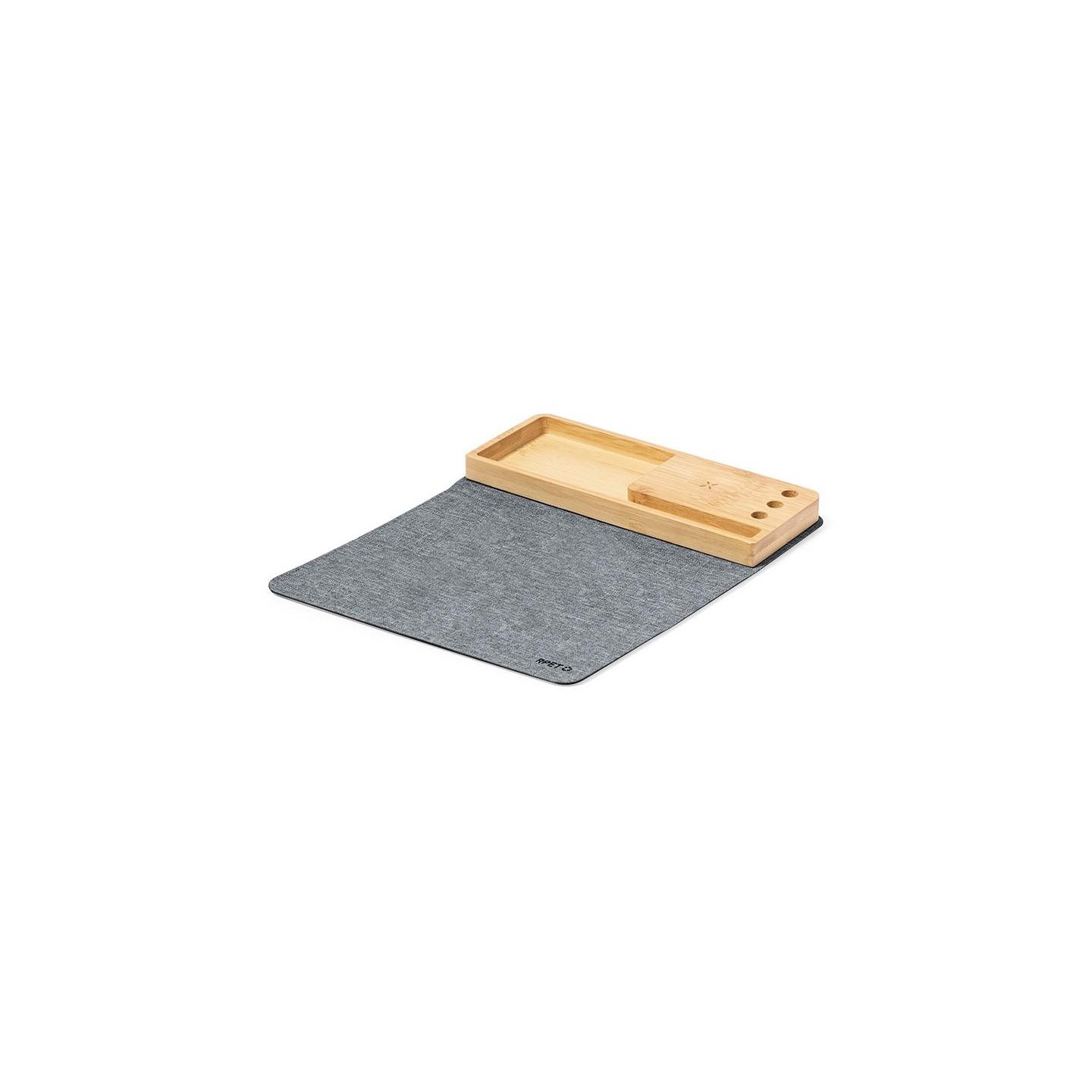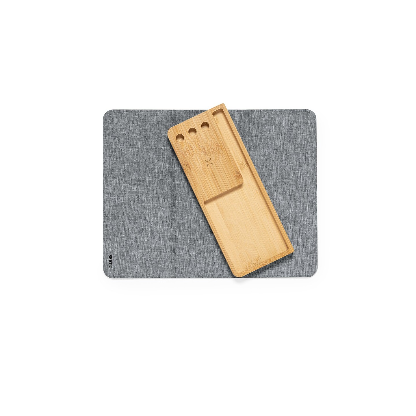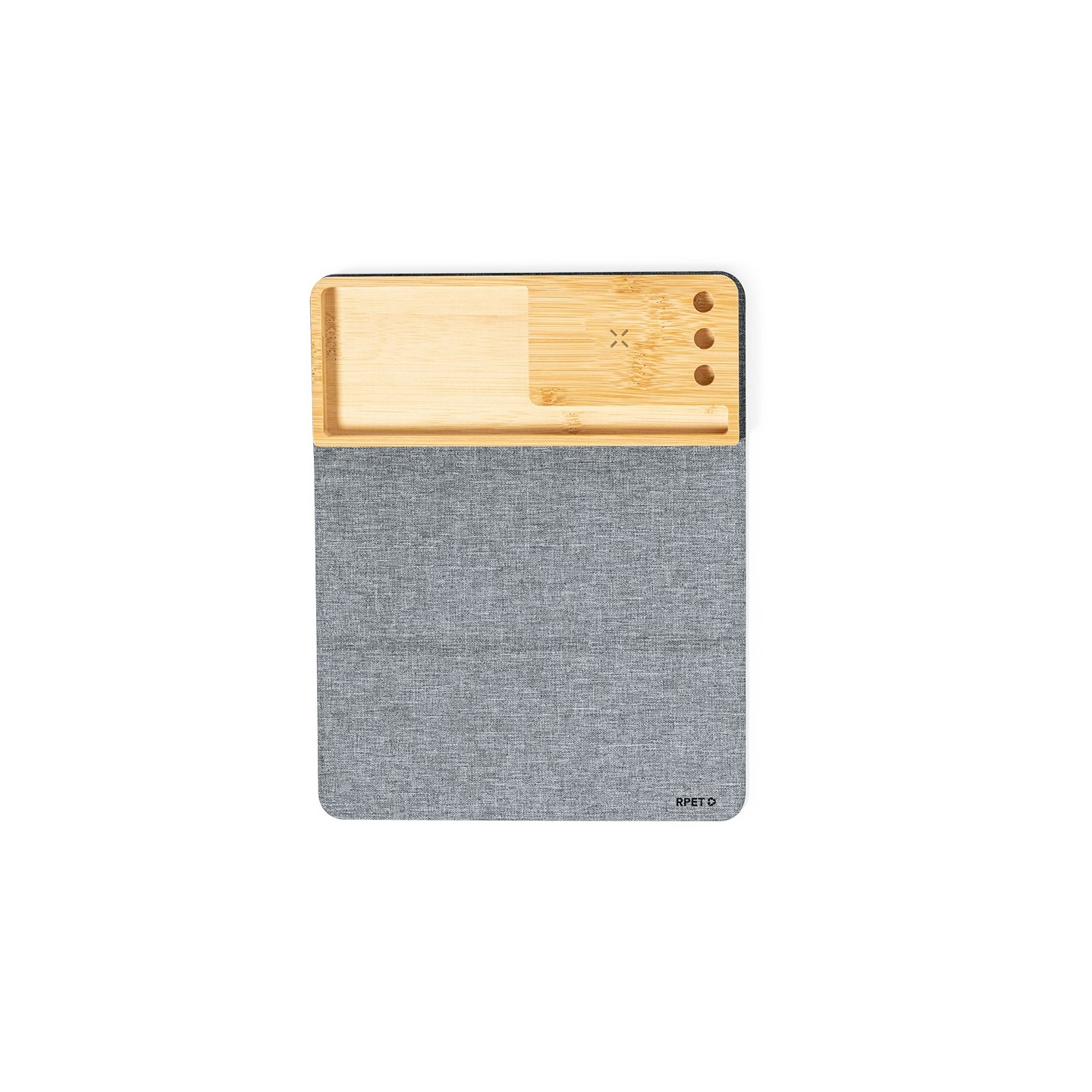 La Alfombrilla Multifunción Hossian es plegable, de poliéster RPET y bambú, cargador inalámbrico 15W, soporte smartphone, base antideslizante. Funcionalidad y sostenibilidad en tu espacio de trabajo.