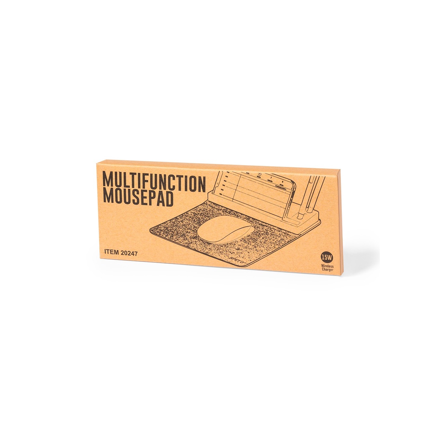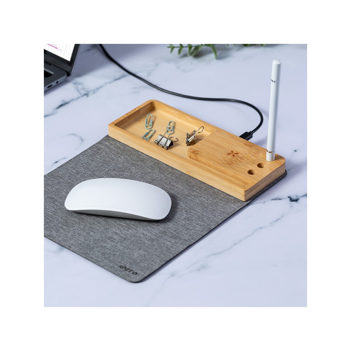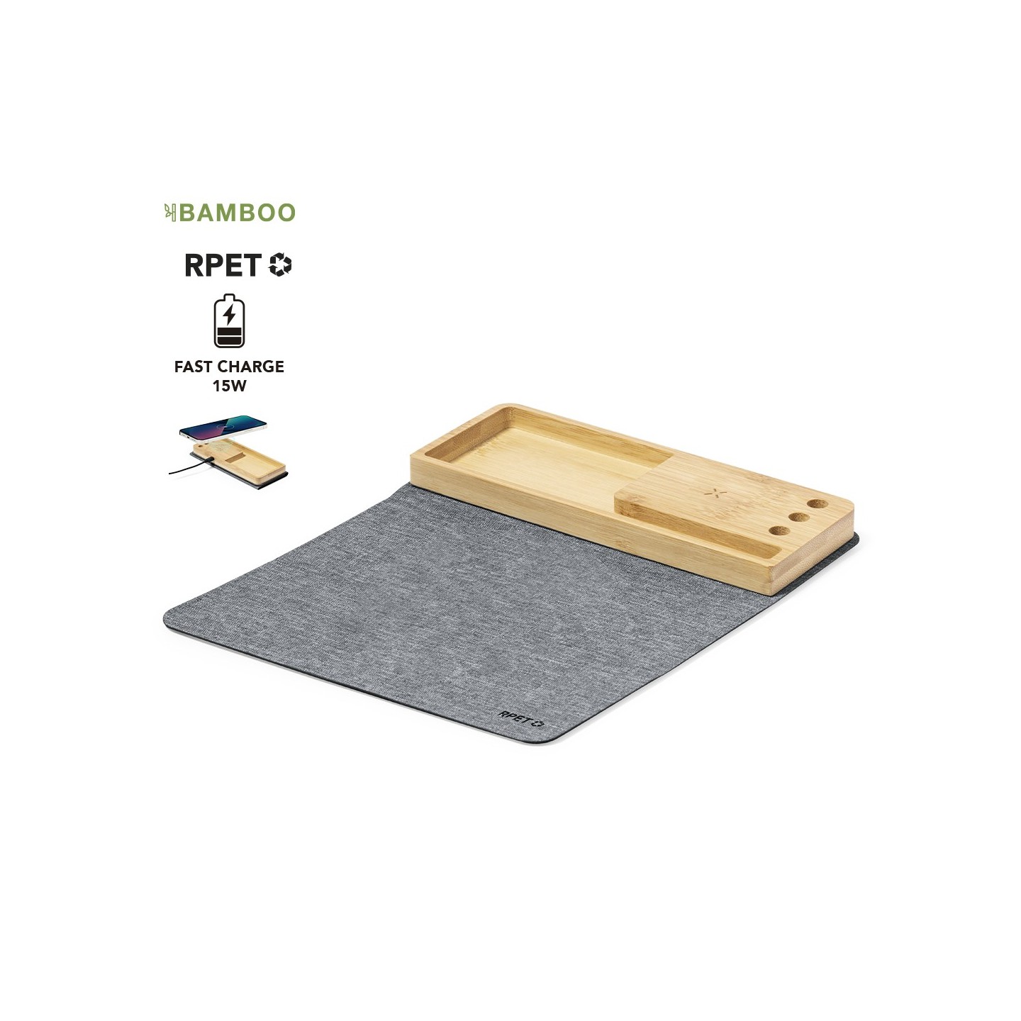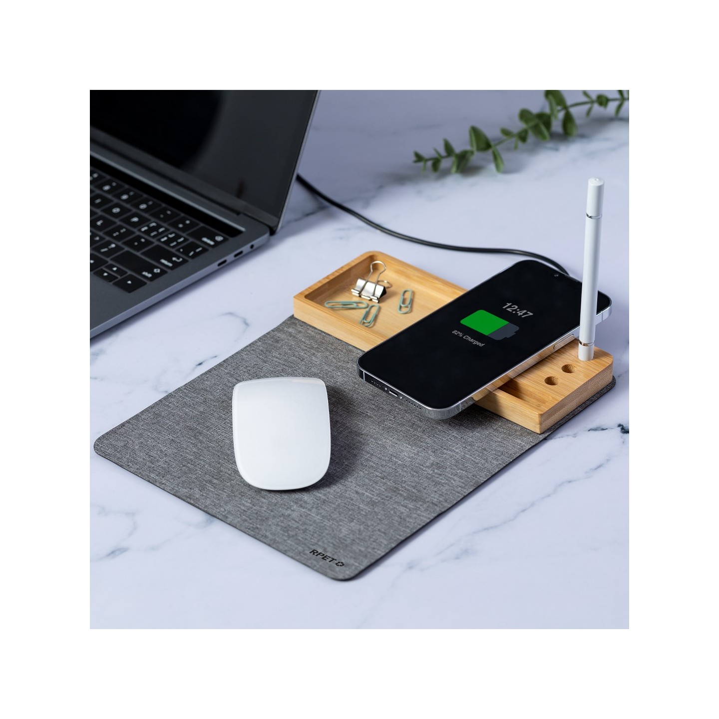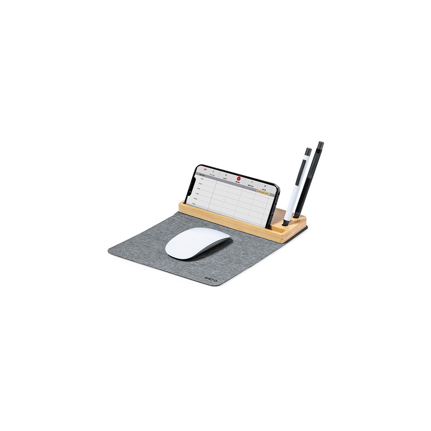 La Alfombrilla Multifunción Hossian es plegable, de poliéster RPET y bambú, cargador inalámbrico 15W, soporte smartphone, base antideslizante. Funcionalidad y sostenibilidad en tu espacio de trabajo.