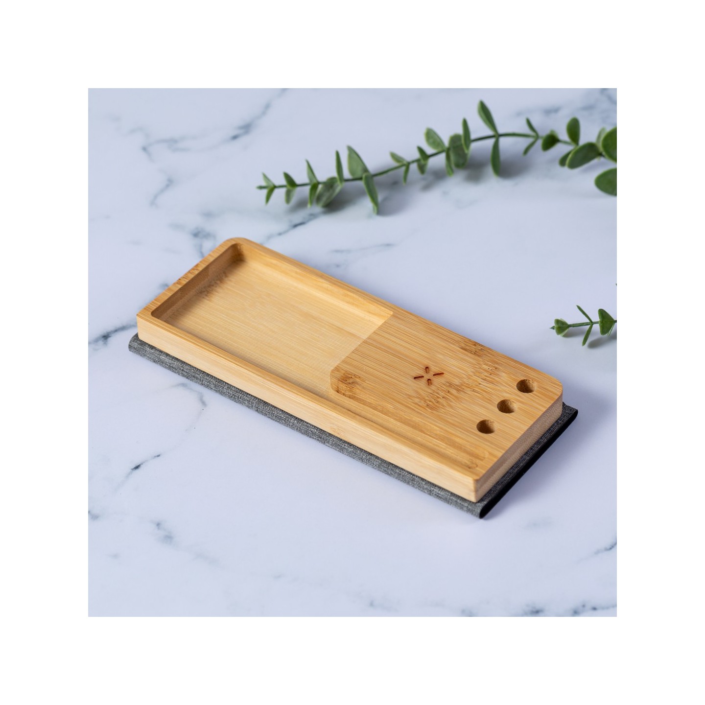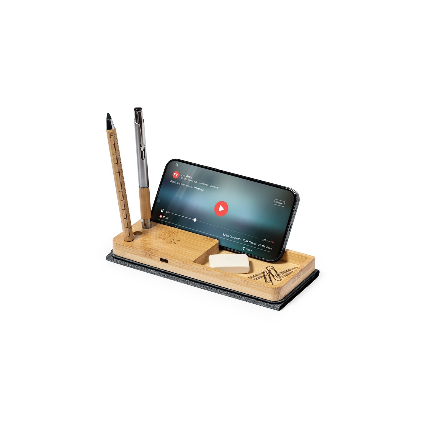 Este versátil accesorio incluye un soporte para smartphone, un soporte para bolígrafos y un compartimento de almacenaje en bambú, proporcionando un espacio organizado y conveniente para tus herramientas de trabajo. La base antideslizante garantiza estabilidad y comodidad durante su uso, ofreciendo un ambiente de trabajo más eficaz.