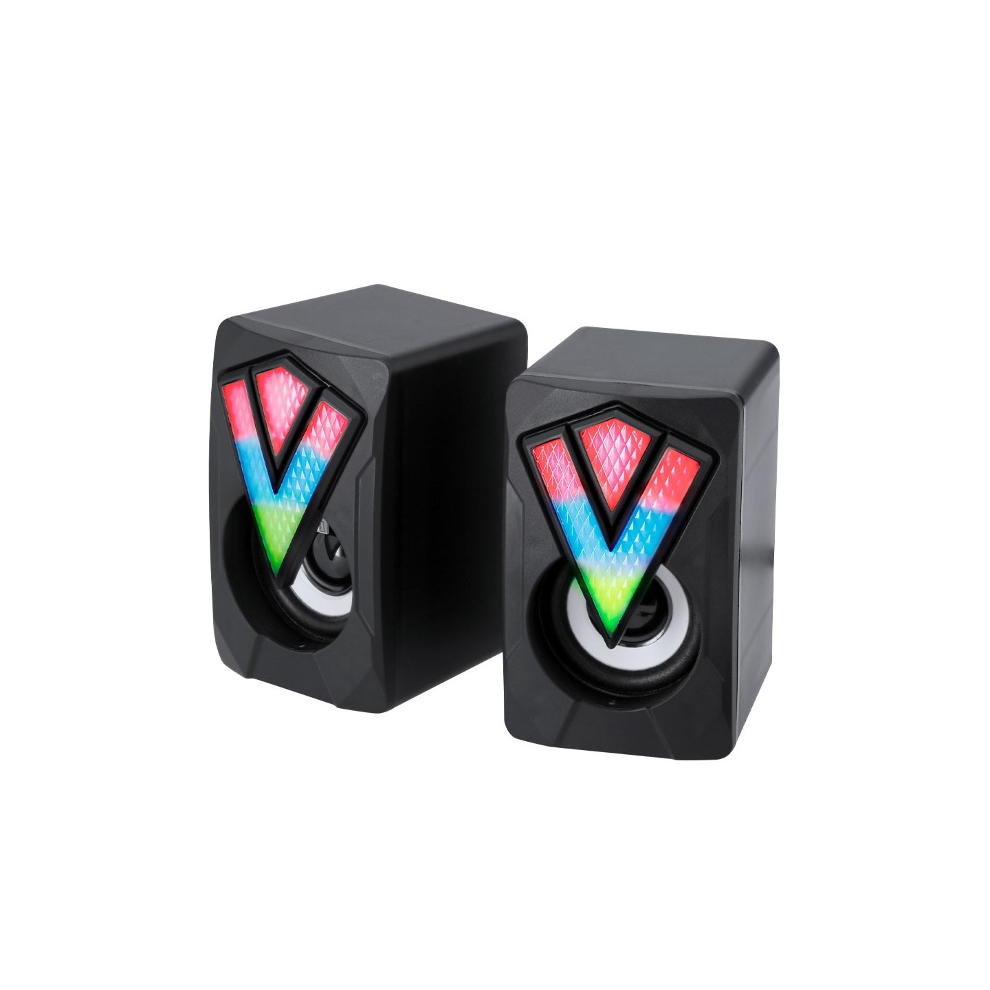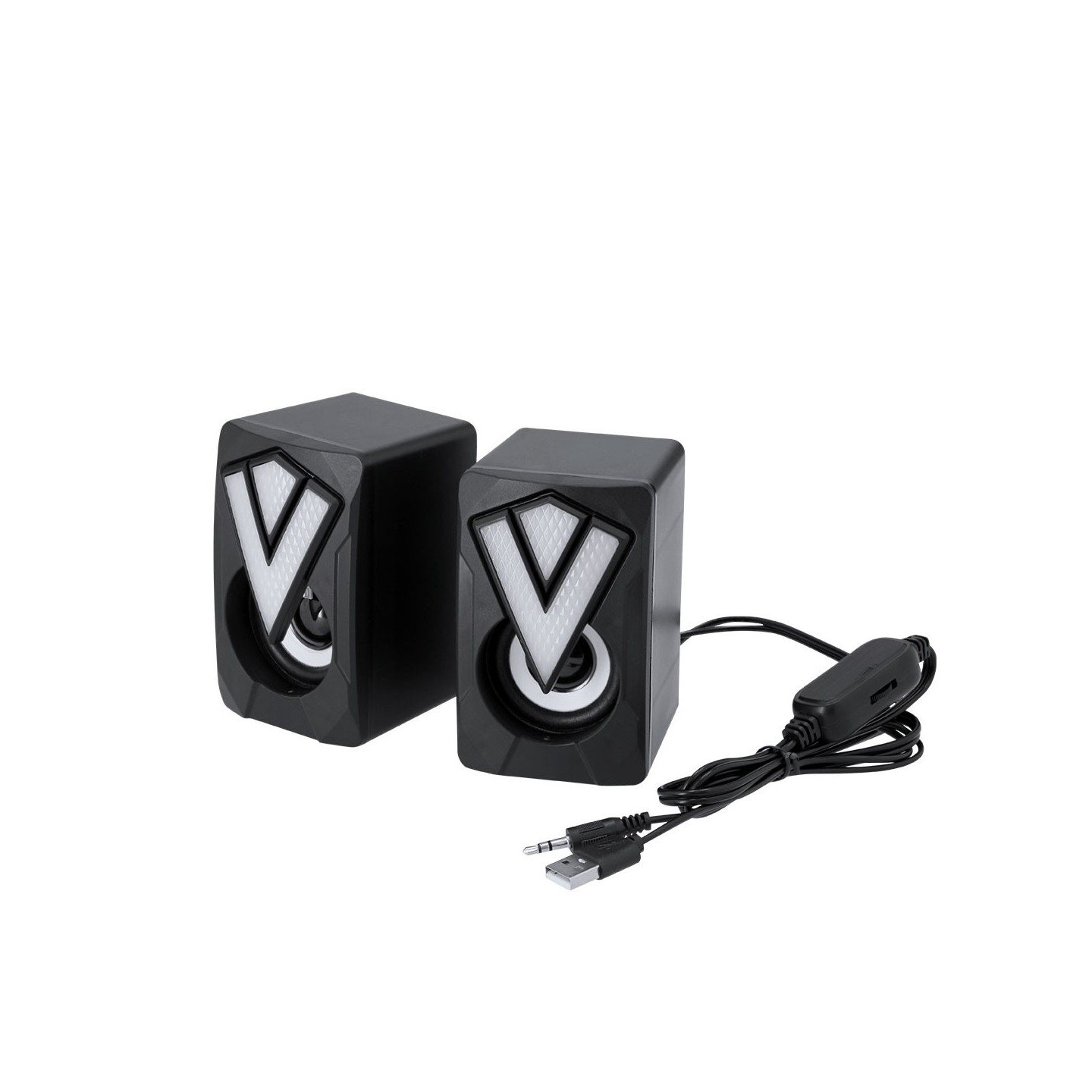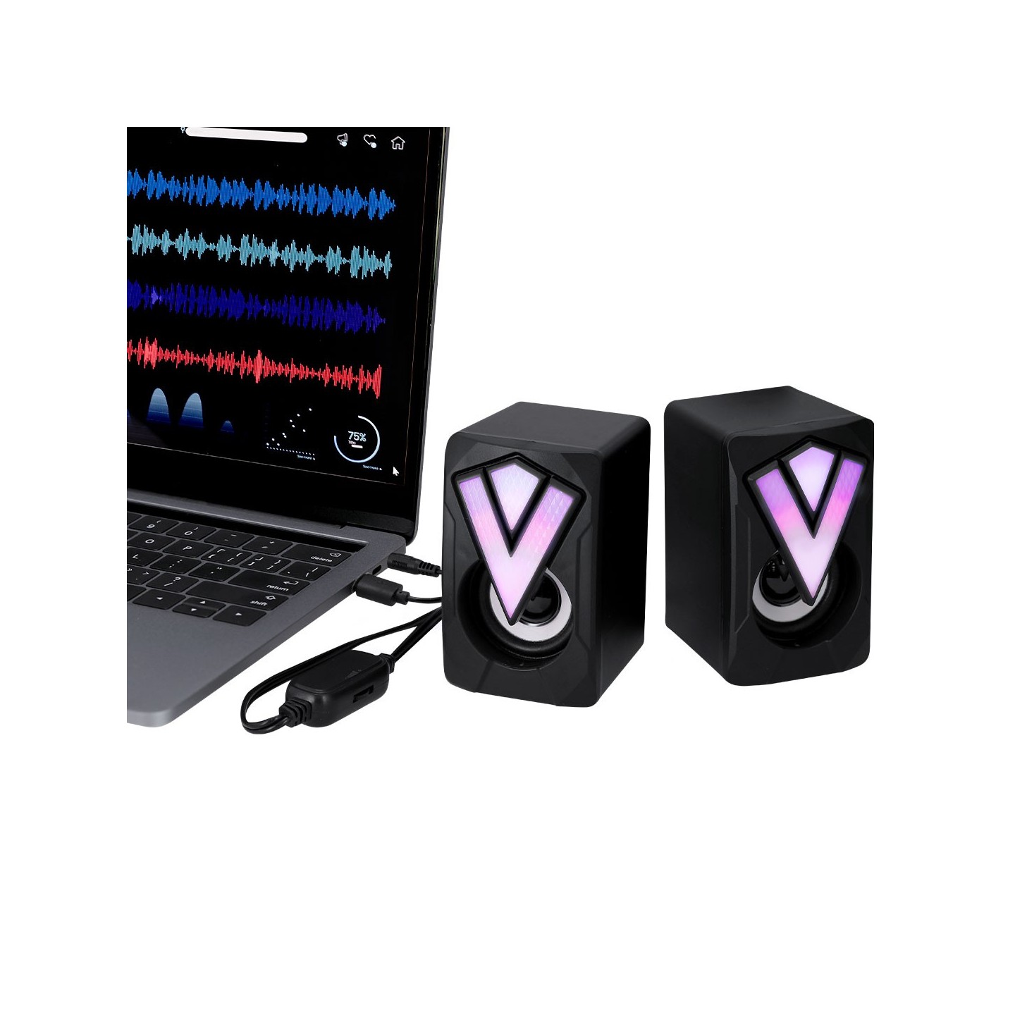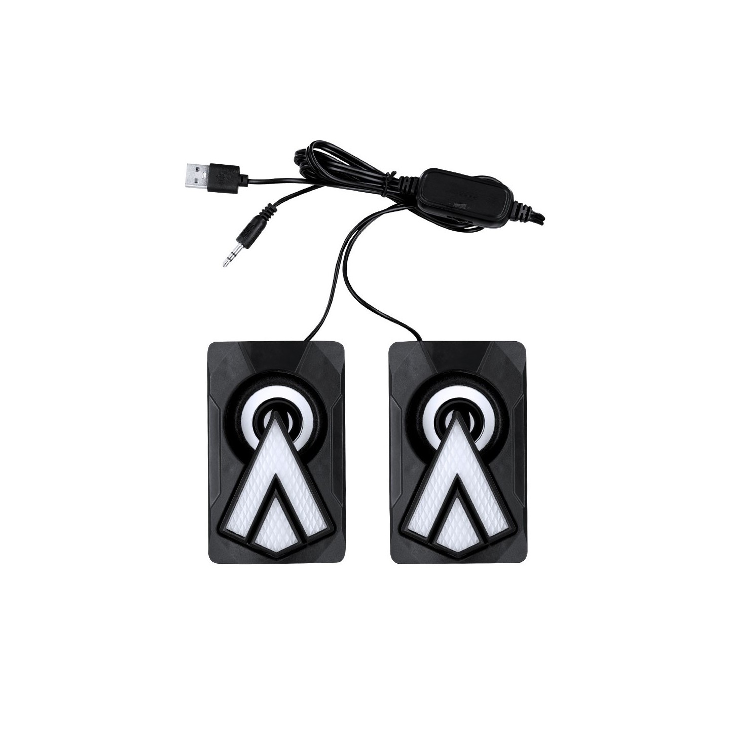 Altavoces gamer ALAN con luces LED multicolor y efectos automáticos. Sonido 3W, conexión jack y USB. Personalizables con tu logotipo, ideales para gaming.