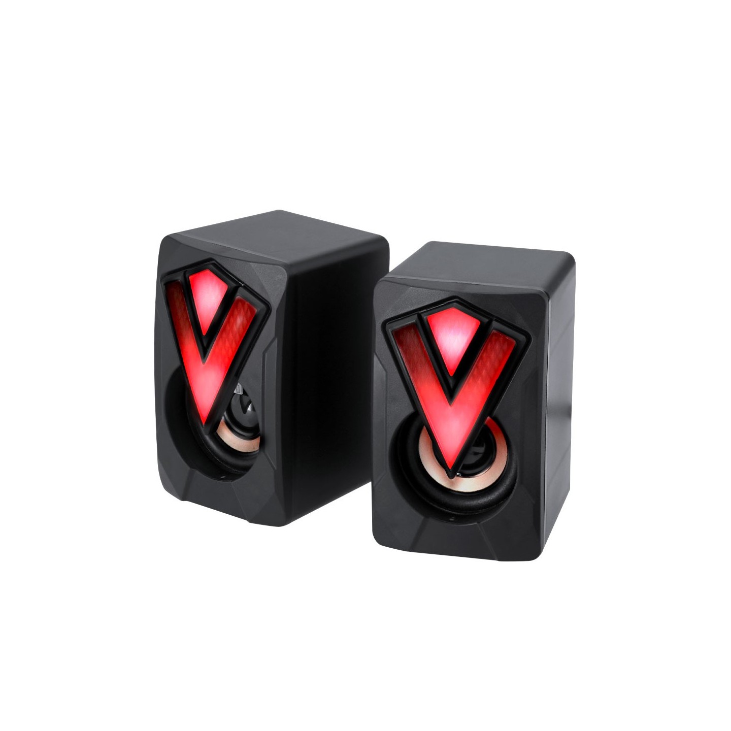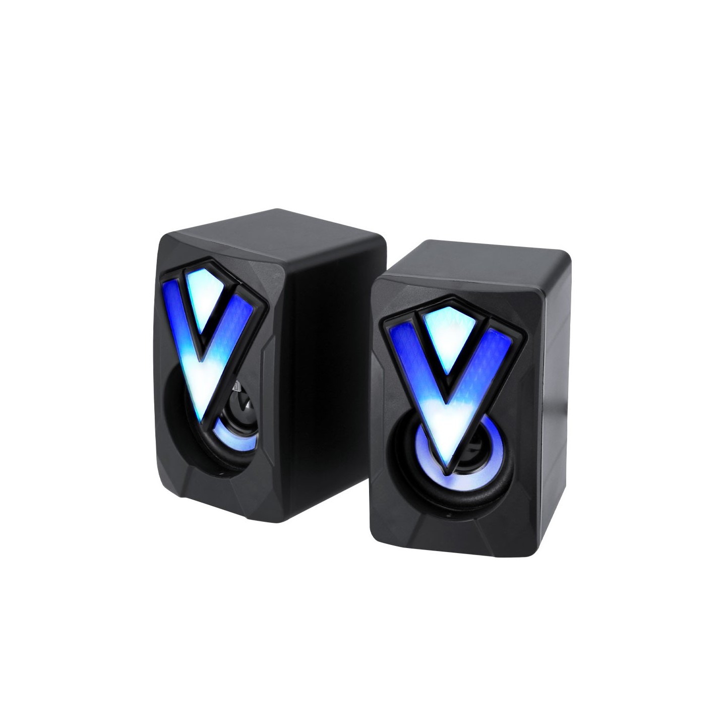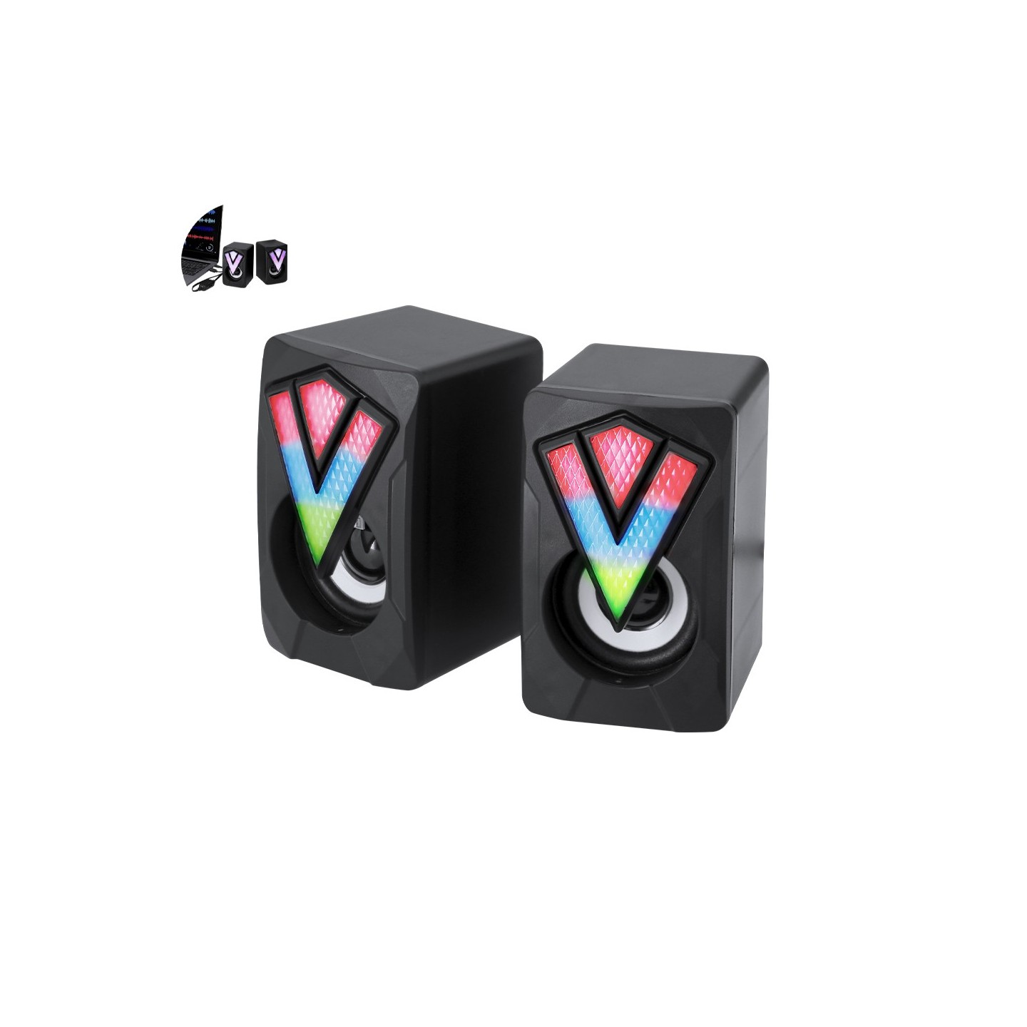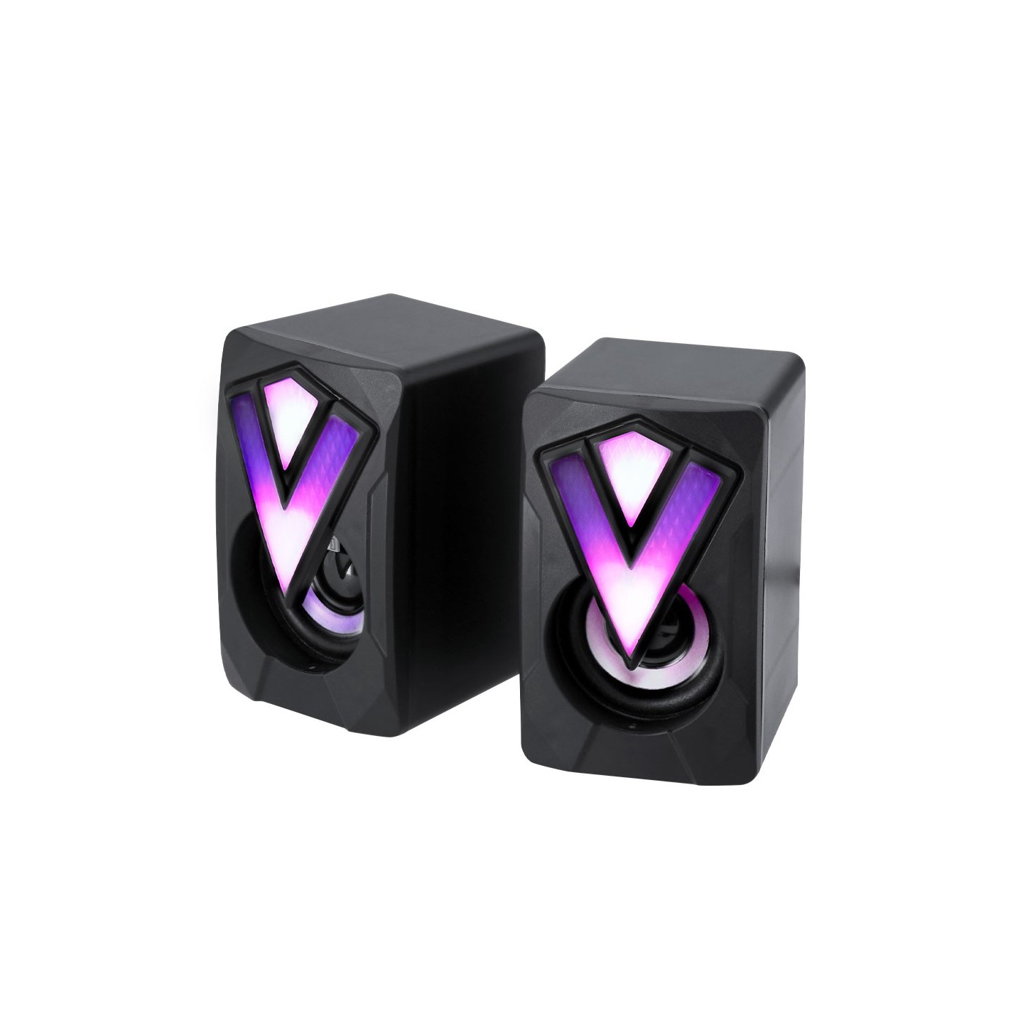 Altavoces gamer ALAN con luces LED multicolor y efectos automáticos. Sonido 3W, conexión jack y USB. Personalizables con tu logotipo, ideales para gaming.