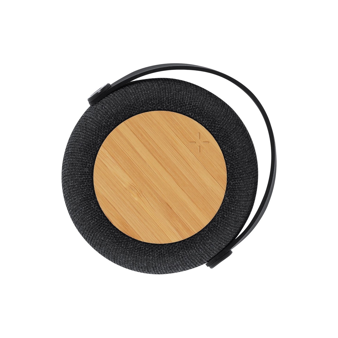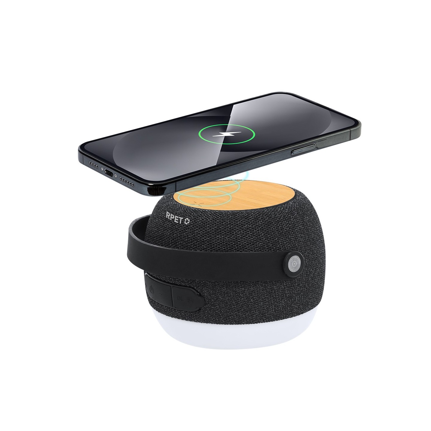 El Altavoz Cargador Sprit combina carga inalámbrica de 15W y sonido Bluetooth. Fabricado en RPET y bambú, es personalizable y perfecto para eventos sostenibles.