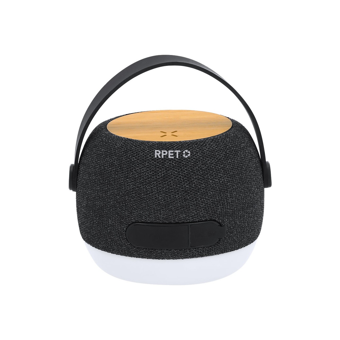 El diseño también incluye una práctica y suave asa de silicona, lo que facilita el transporte del altavoz, permitiéndote llevar la fiesta a donde quieras. Su aspecto moderno y estilizado, junto con el distintivo RPET, resalta su compromiso con la sostenibilidad y la responsabilidad ambiental.