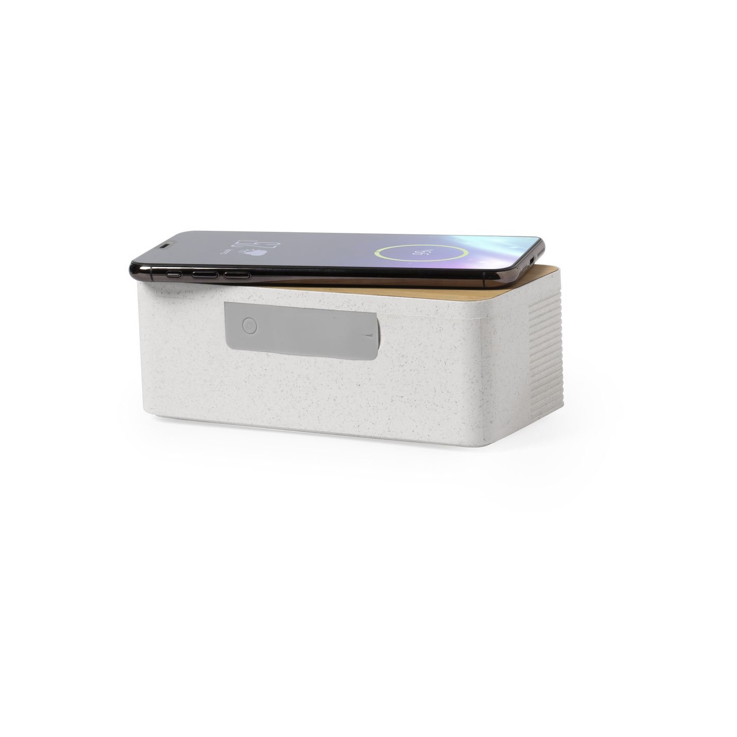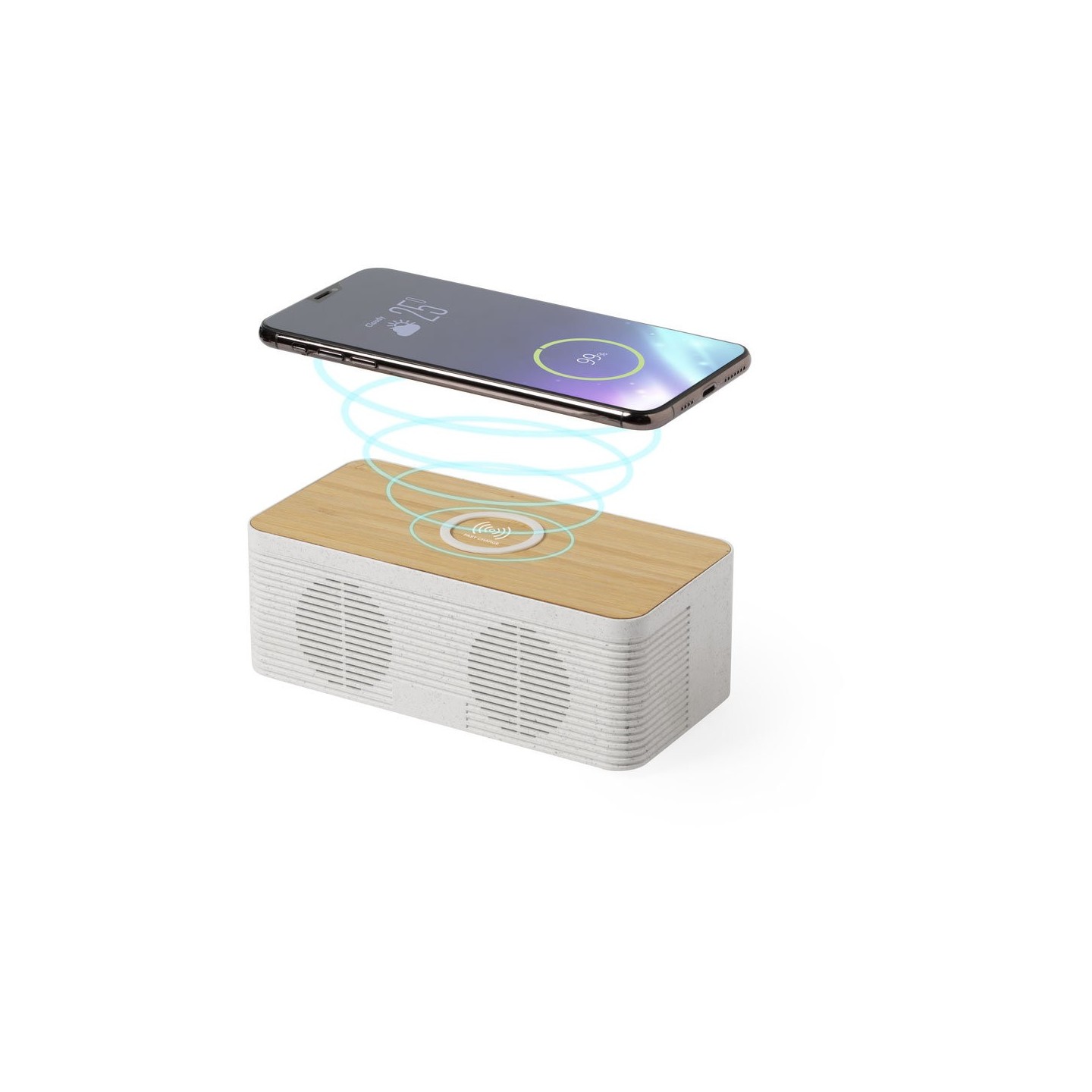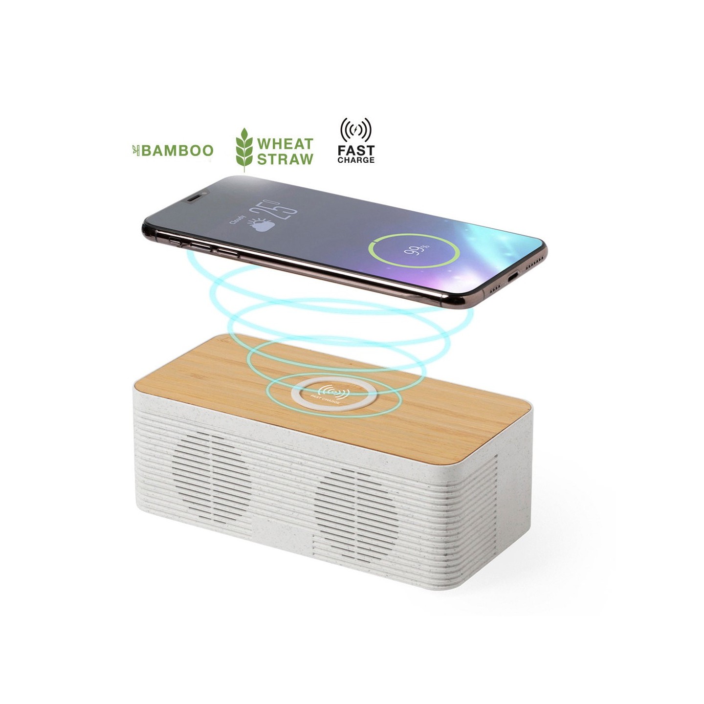 El Altavoz Cargador Trecam es de carga rápida de 10W y conexión Bluetooth® 5.0. Superficie de carga en bambú y carcasa en caña de trigo. ¡Sonido potente, carga inalámbrica y diseño sostenible!