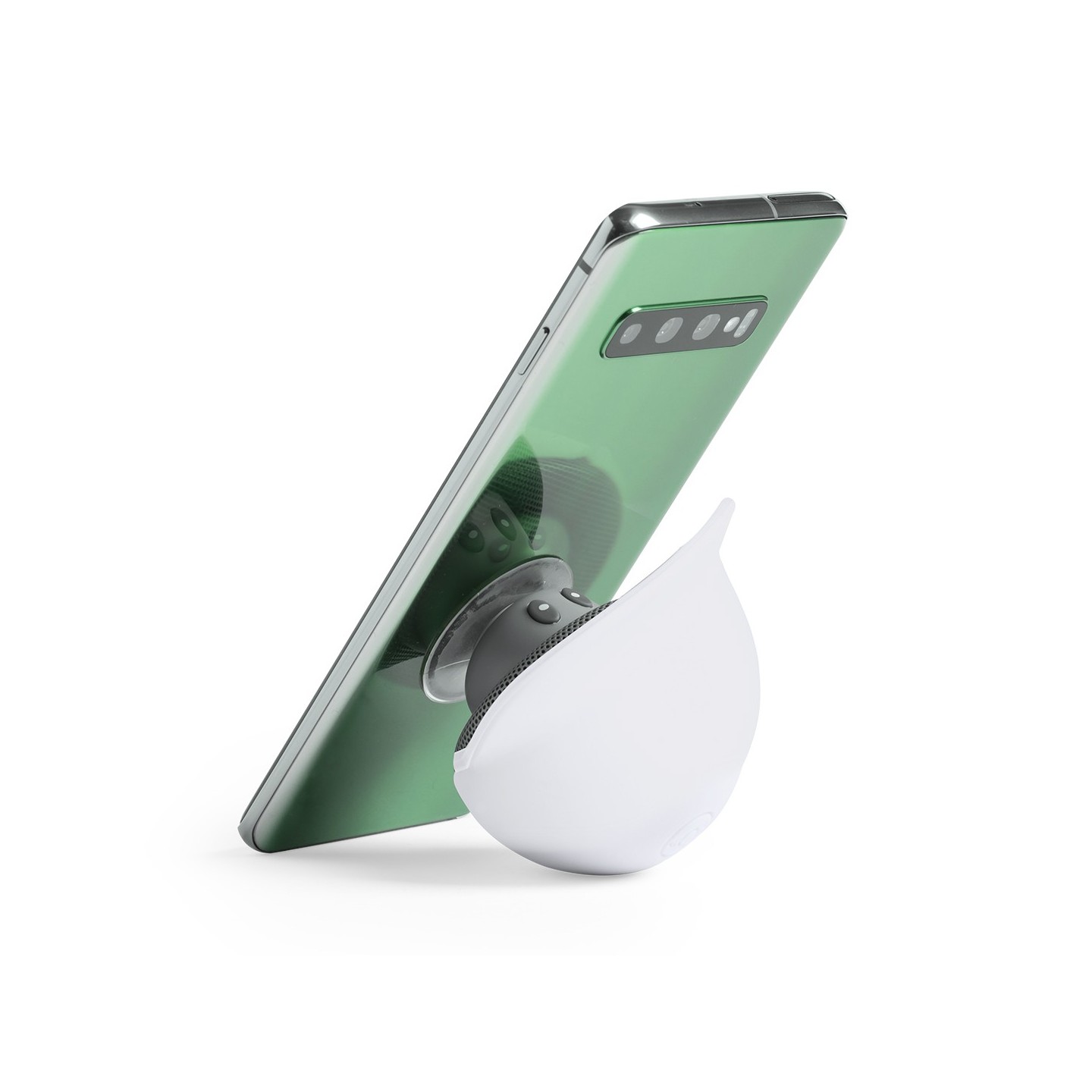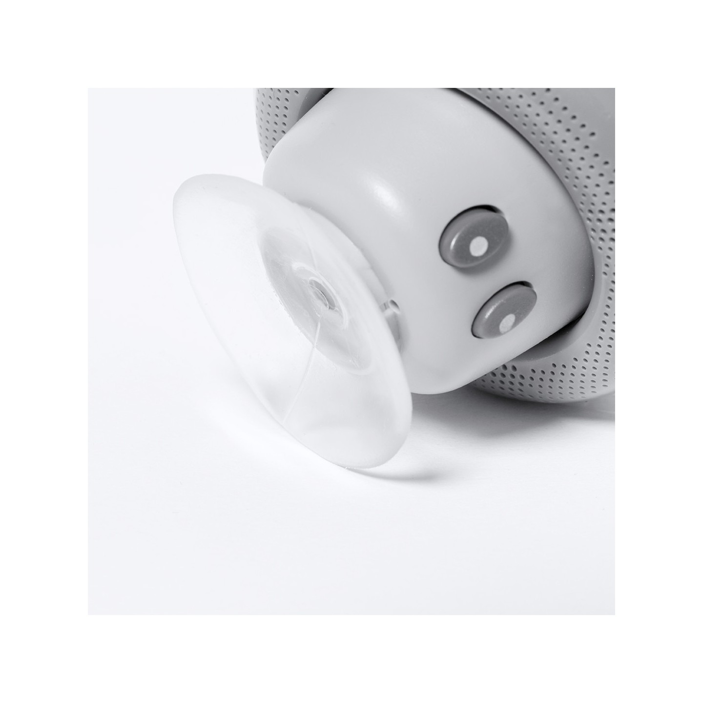 El cuerpo del altavoz presenta un suave acabado de tacto goma, que no solo mejora su apariencia estética, sino que también proporciona un agarre seguro y cómodo. Además, cuenta con una ventosa de fijación en la parte inferior para la función soporte, asegurando una sujeción firme en cualquier superficie.