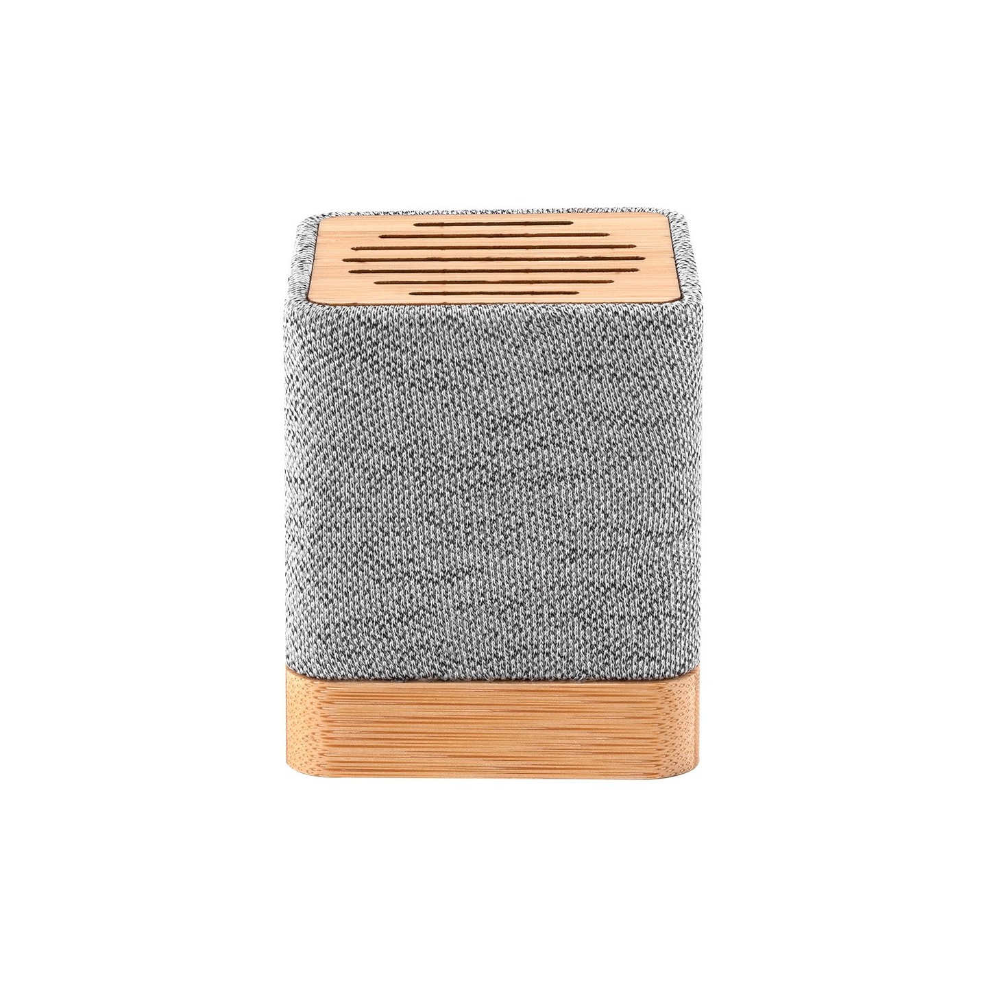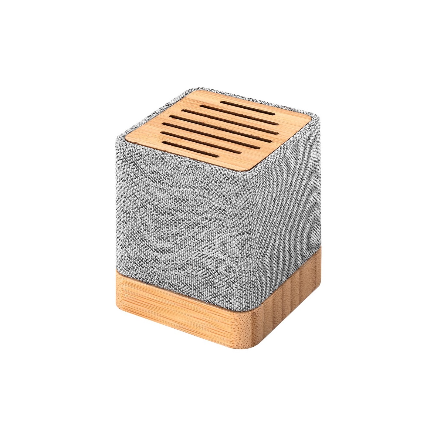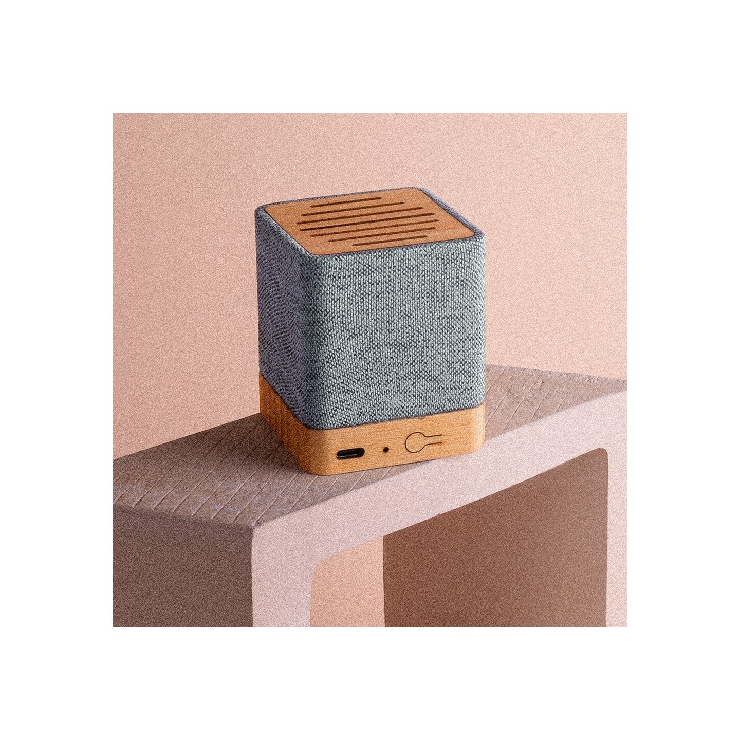 El Altavoz Ivy tiene Bluetooth 5.0, cuerpo ecoamigable en bambú y RPET, recargable USB, 3W, compacto 6,2x6,2x7,5 cm. Certificaciones RoHS y CE.