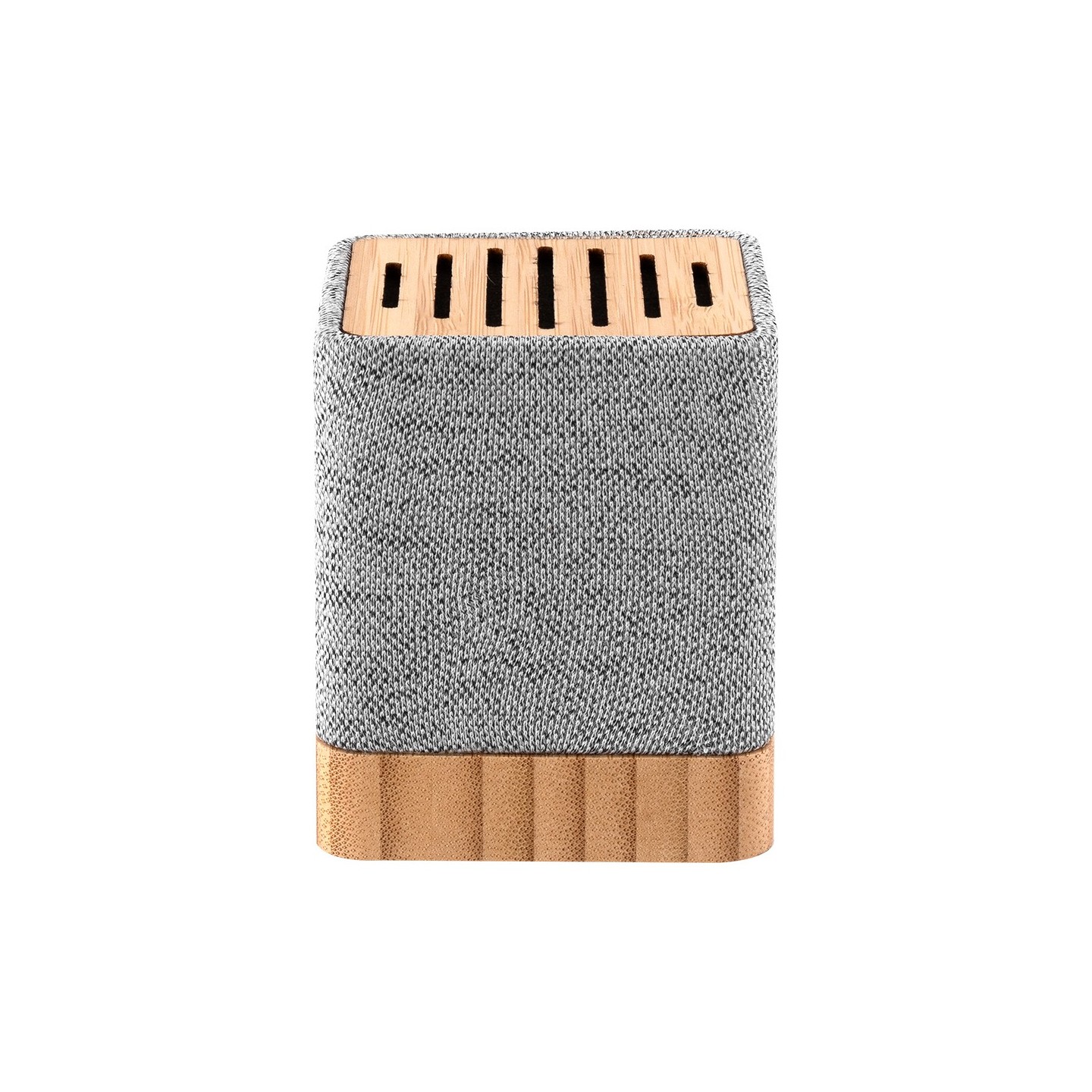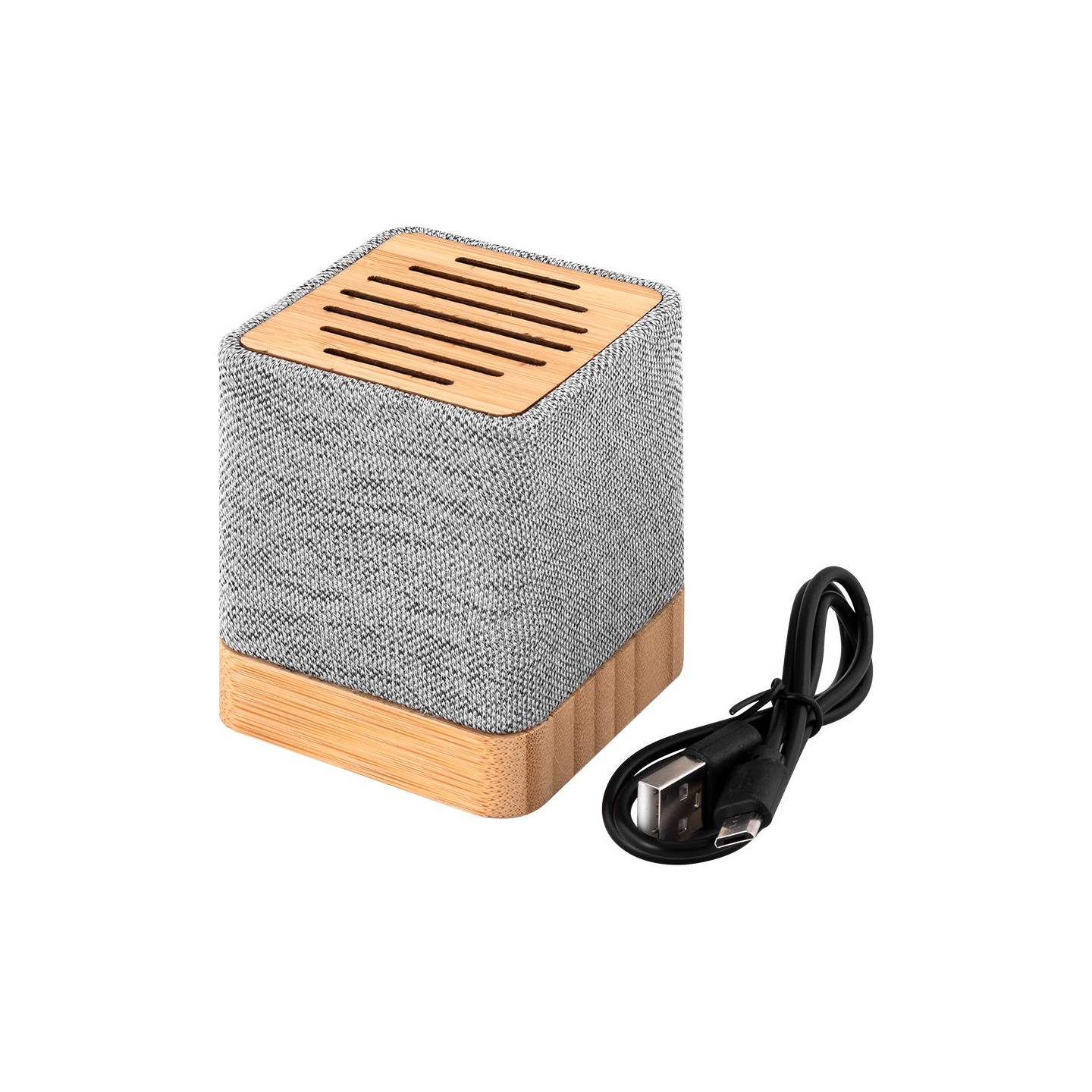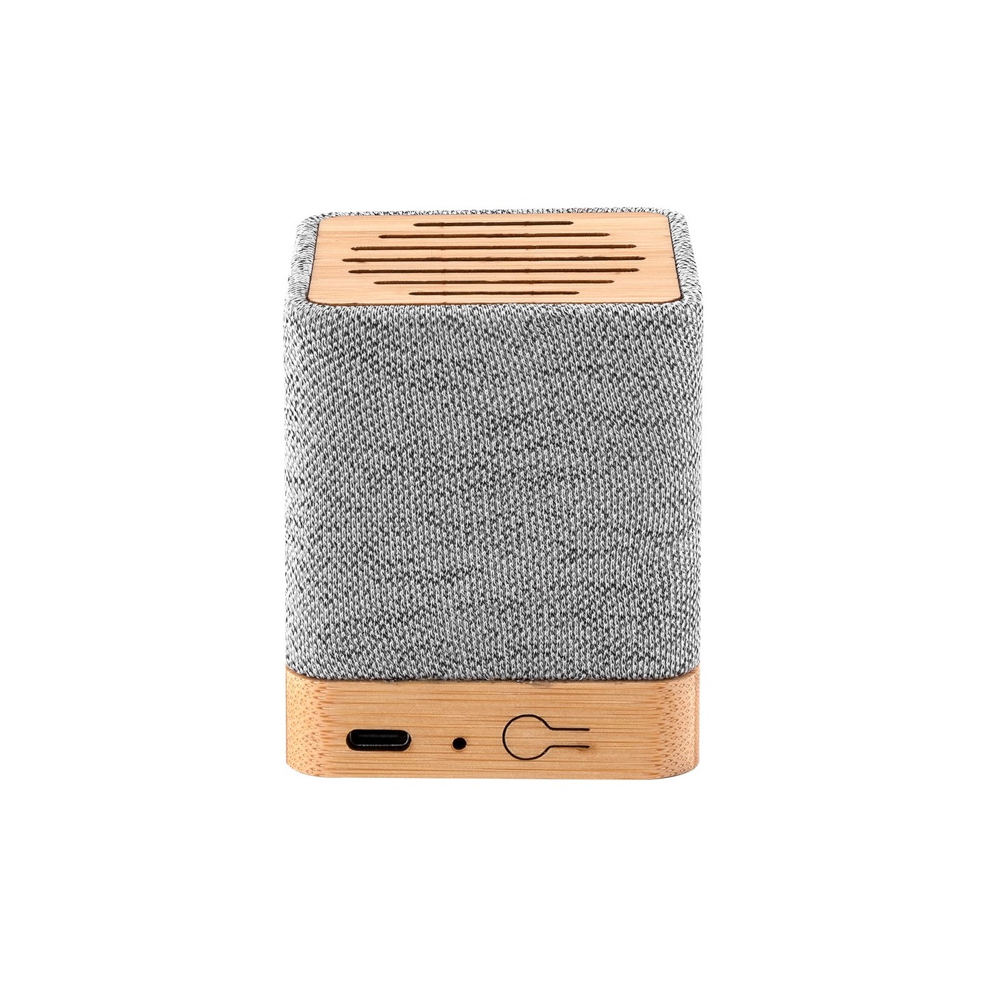 El Altavoz Ivy tiene Bluetooth 5.0, cuerpo ecoamigable en bambú y RPET, recargable USB, 3W, compacto 6,2x6,2x7,5 cm. Certificaciones RoHS y CE.