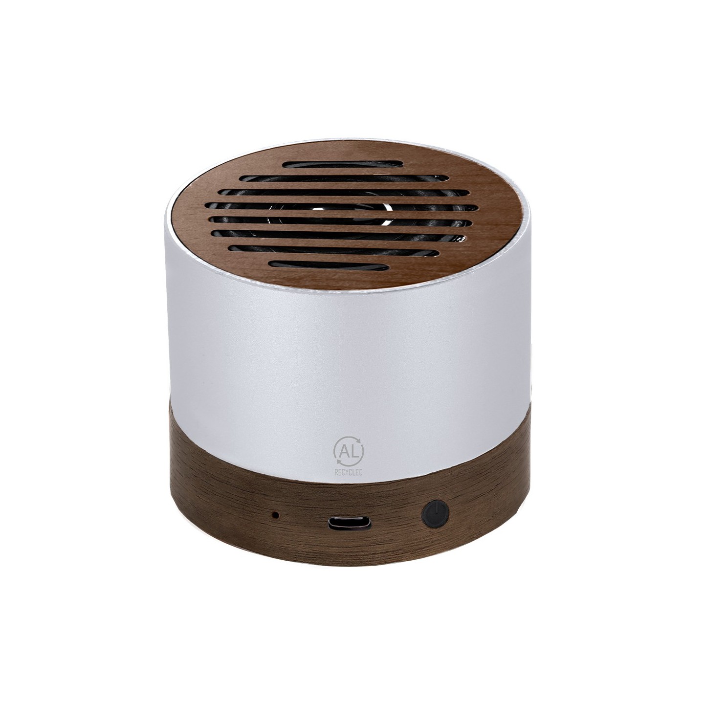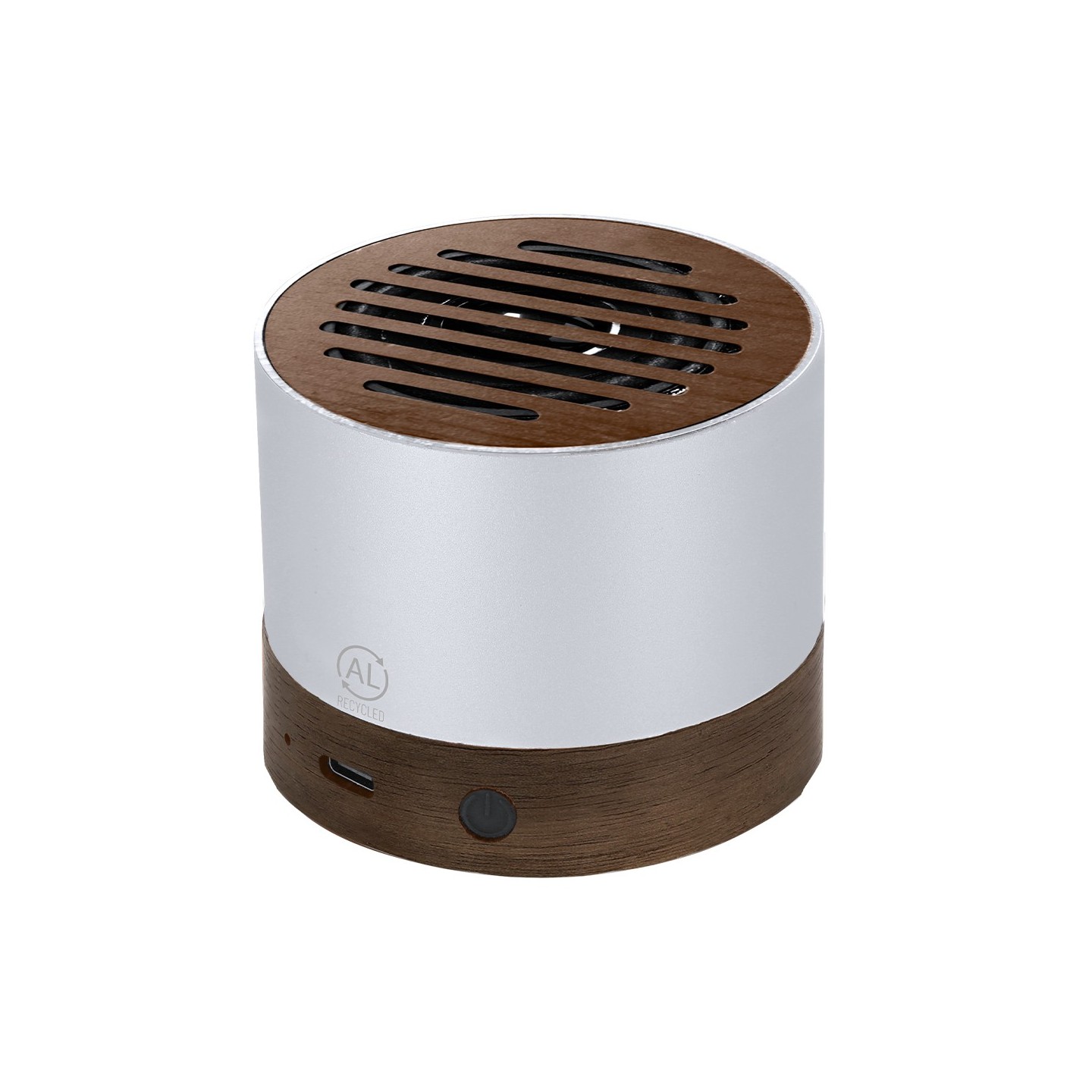 Altavoz KOLIN de aluminio reciclado y madera de nogal, Bluetooth 5.3 y sonido 3W. Certificación GRS y personalizable con tu logotipo, ideal para empresas.