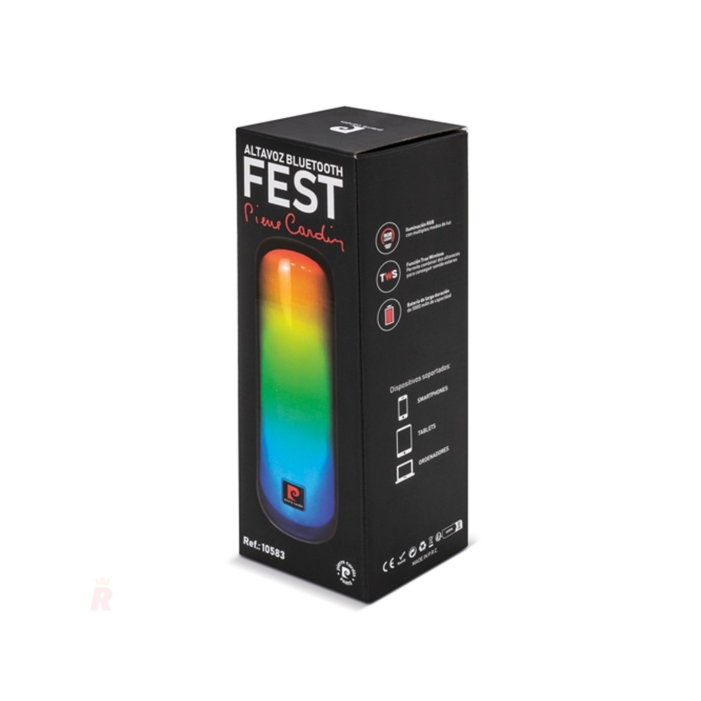 Altavoz Pierre Cardín FEST de 15W con luces LED RGB, Bluetooth 5.3, radio FM, recepción de llamadas y función TWS. Diseño moderno en ABS y silicona, con batería de 5000 mAh e incluye accesorios.