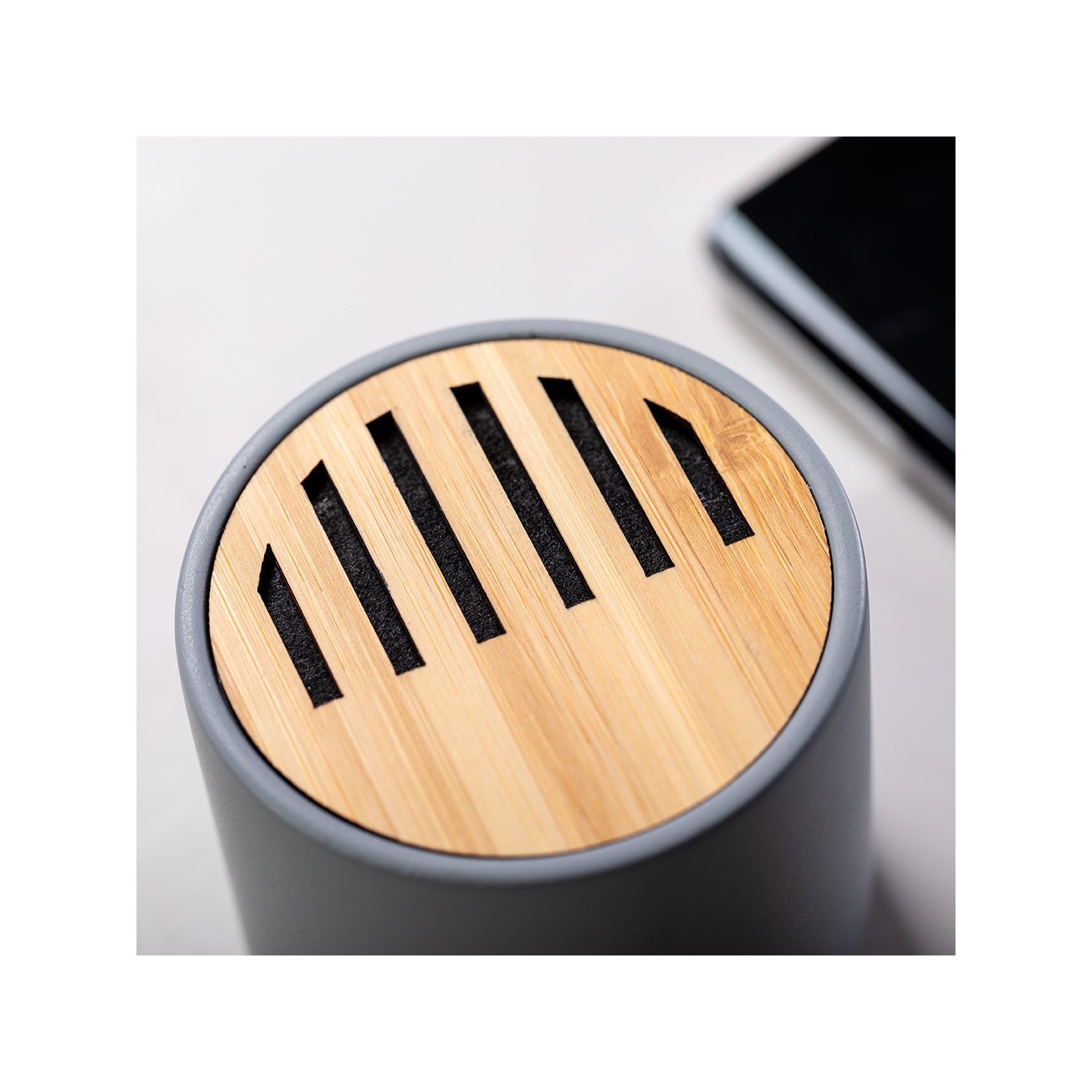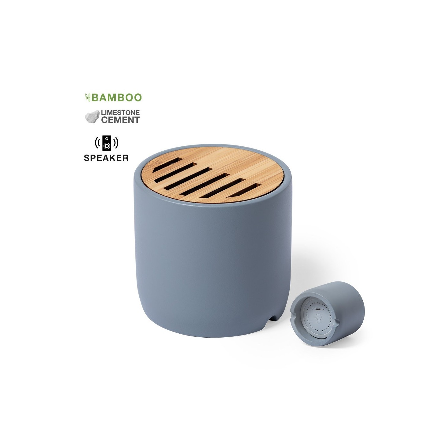 Te presentamos el innovador Altavoz Piler. Este altavoz Bluetooth combina piezas de bambú de corte natural con cemento de piedra caliza, un conglomerante resistente y duradero formado por la mezcla de materiales naturales como la piedra caliza molida y el agua.