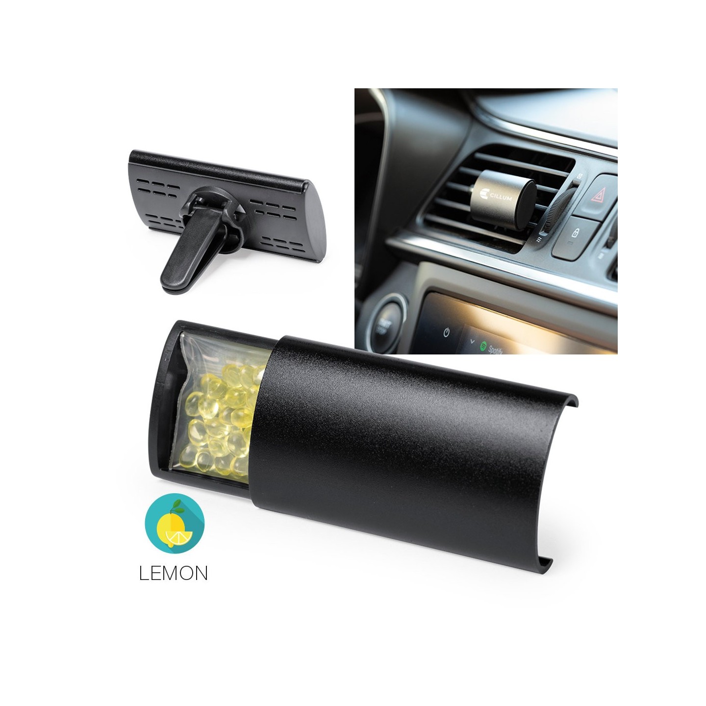 Ambientador Becrux: elegante diseño para rejilla de coche. Aroma limón, pinza resistente y acabados en plateado y negro. ¡Viaja con estilo y frescura!