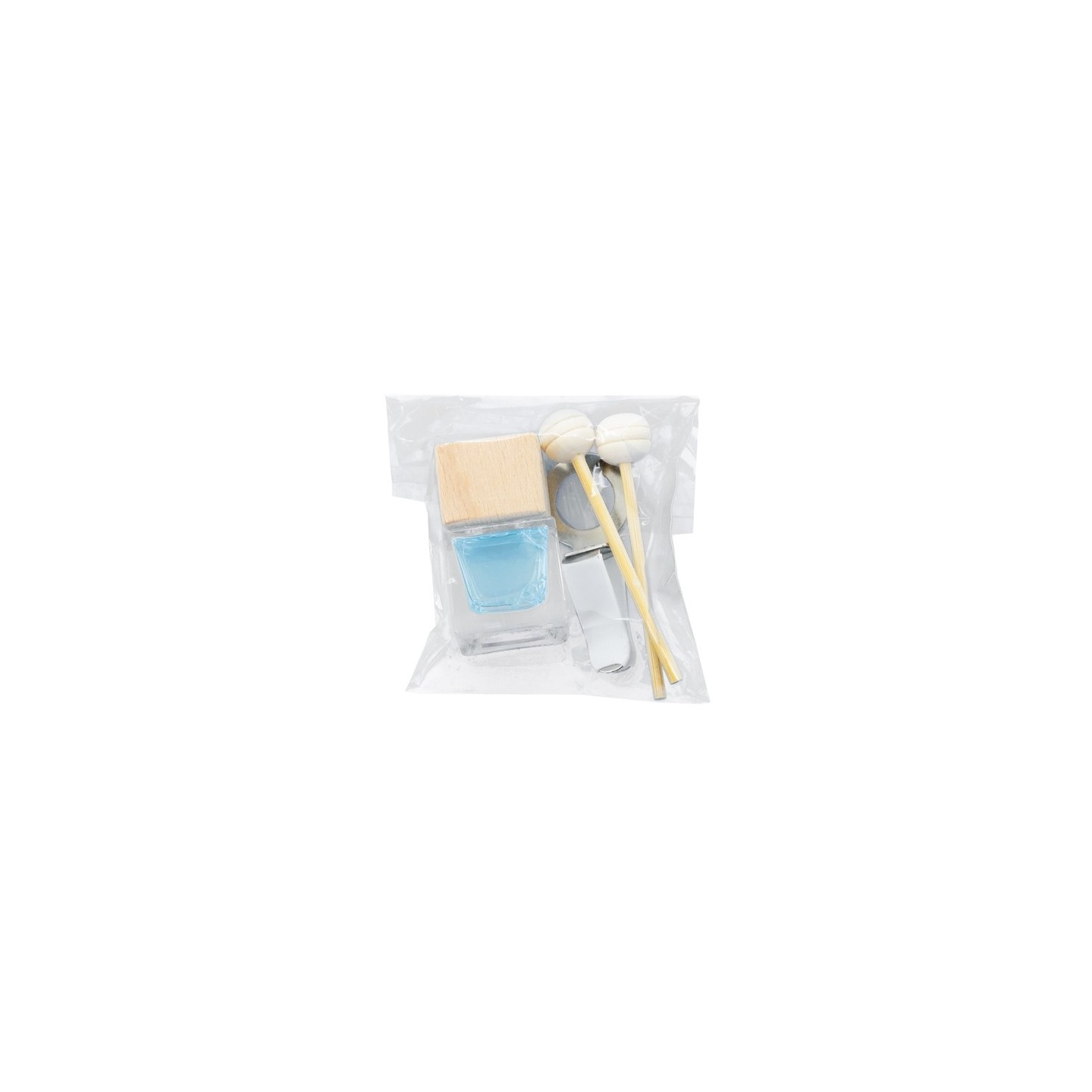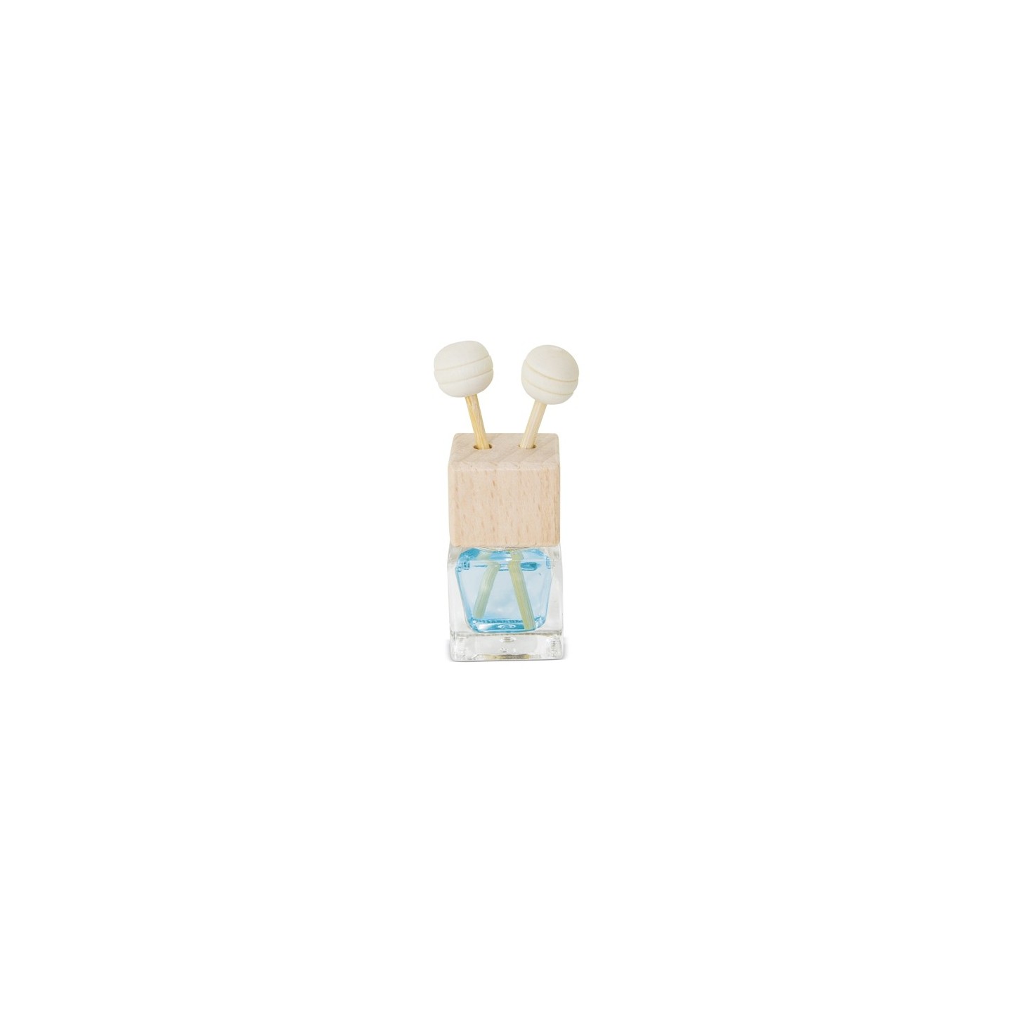 Ambientador para coche con diseño robot, fabricado en madera y vidrio, con aroma a sandía. Incluye pinza sujeción y es personalizable con logotipo. Se entrega desmontado en bolsa individual.