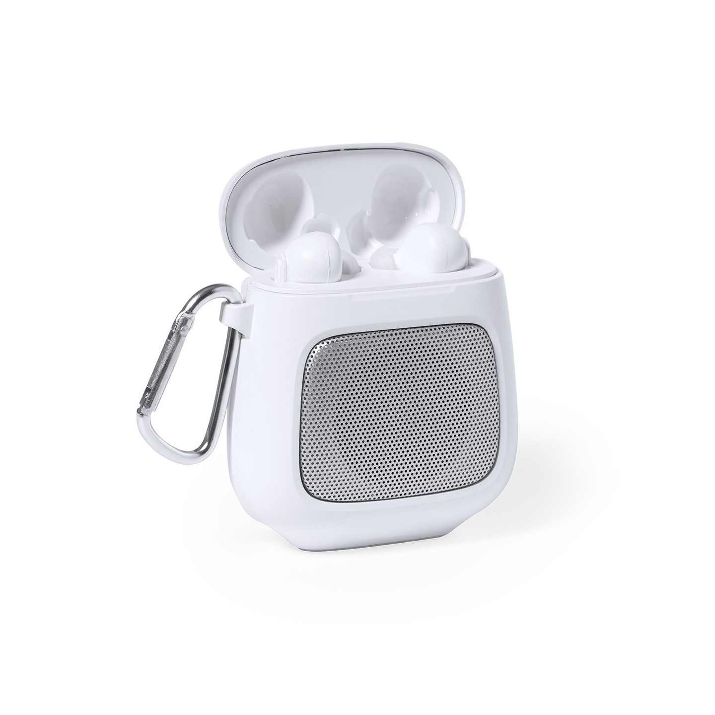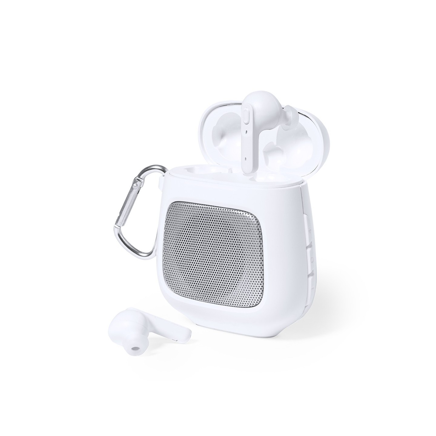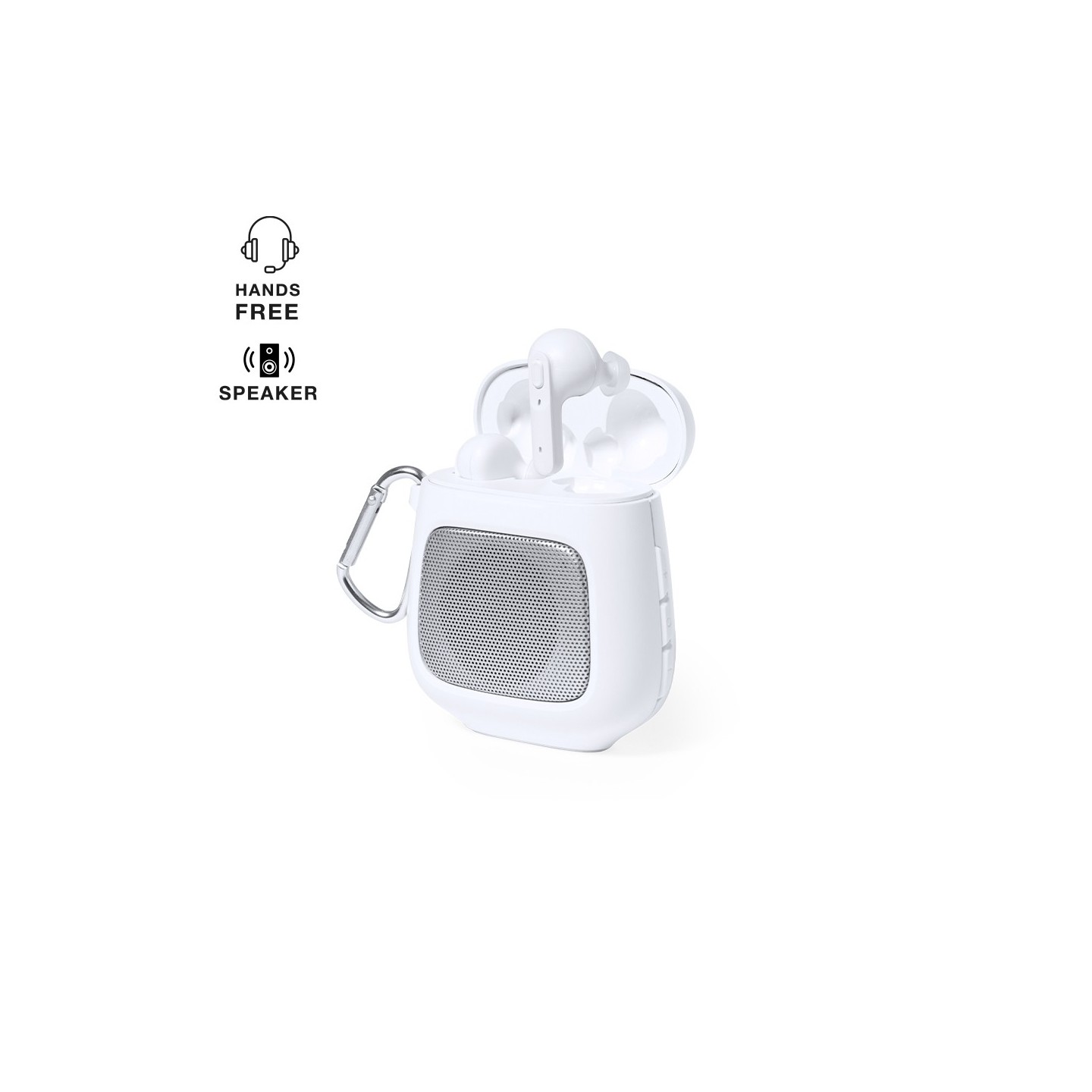 Fabricados en resistente ABS de color blanco, estos auriculares son duraderos y elegantes. El set incluye un altavoz Bluetooth® de 3W de potencia, equipado con función manos libres para llamadas y un práctico mosquetón de transporte. Además, una pareja de auriculares intraurales, con botón de control integrado y batería de 30 mAh cada uno, proporciona una experiencia auditiva inmersiva y cómoda.