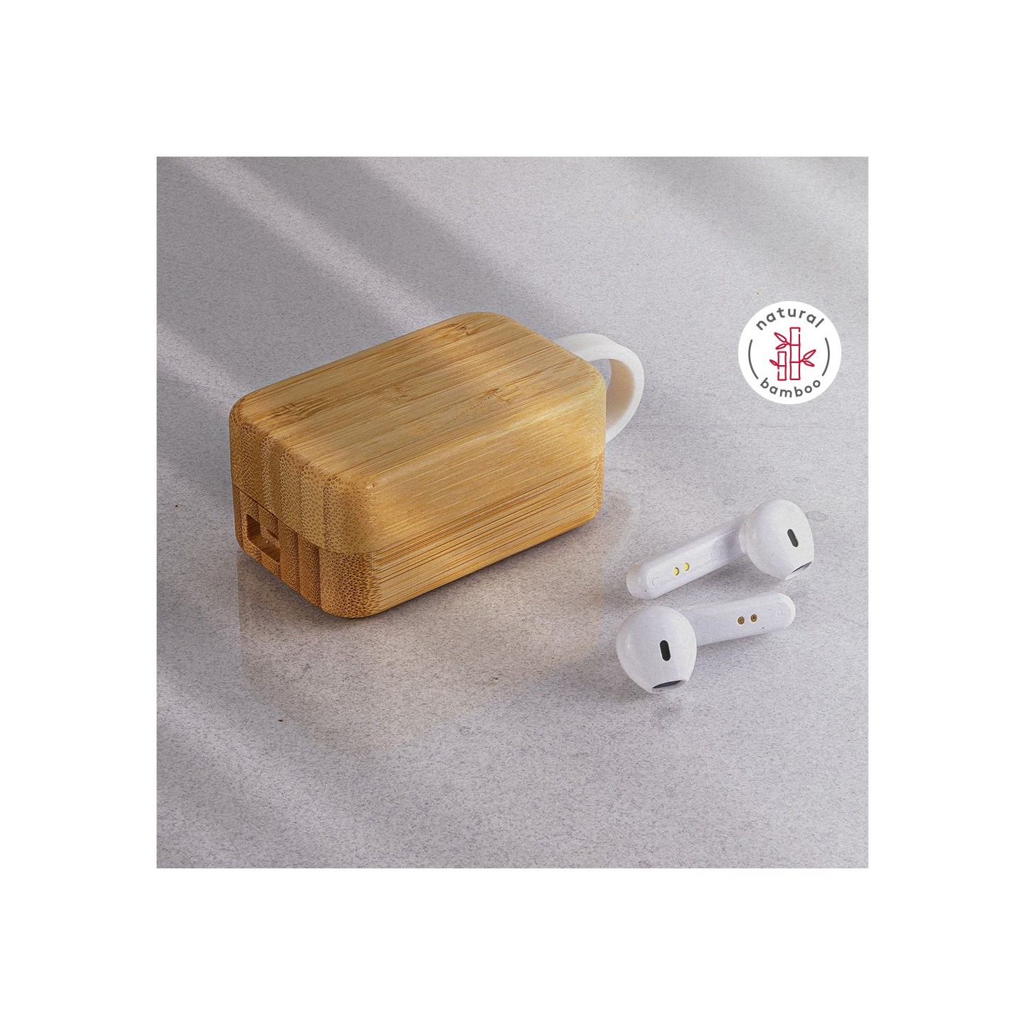 Los Auriculares Inalámbricos Play tienen Bluetooth 5.0, autonomía de 2 horas, presentados en caja de bambú compacta de 7,5 x 4,5 x 3 cm. Libertad sonora con estilo.
