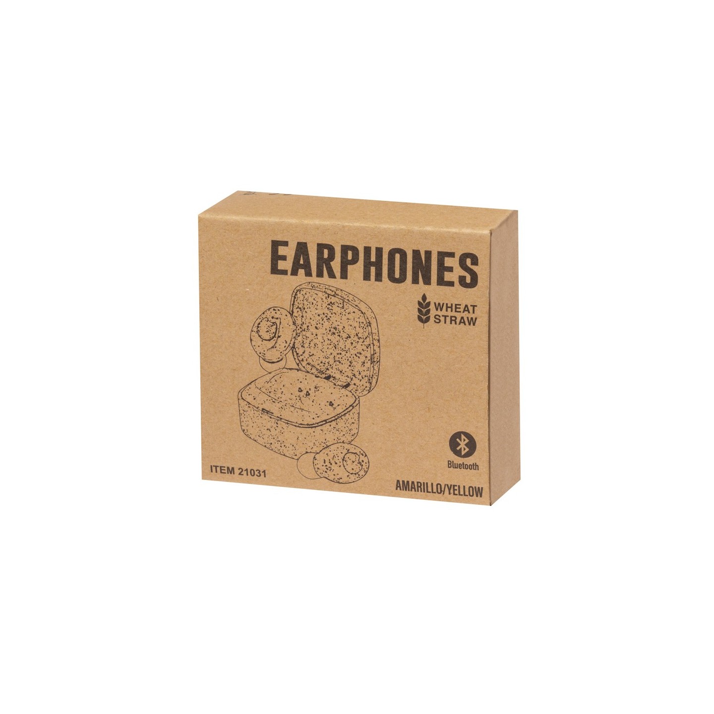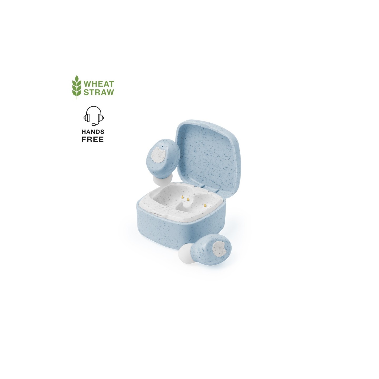Auriculares intraurales fabricados en caña de trigo, con conexión Bluetooth® 5.0. De diseño ergonómico, incluyen botón de control táctil integrado en el auricular, cada uno con una batería de 30 mAh. Base de carga a juego con batería de 200mAh y luz LED de estado de carga. Función manos libres y recargables, con cable Tipo C incluido. Presentados en estuche individual de lujo con tapa de bisagra y en caja de diseño kraft. Disponibles en variada gama de colores, combinando la caña de trigo en color natural con originales tonos. Incluido manual de instrucciones en español e inglés.