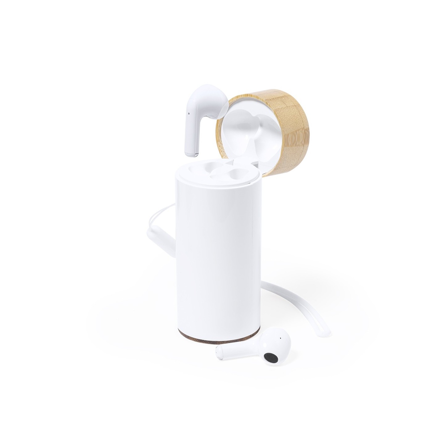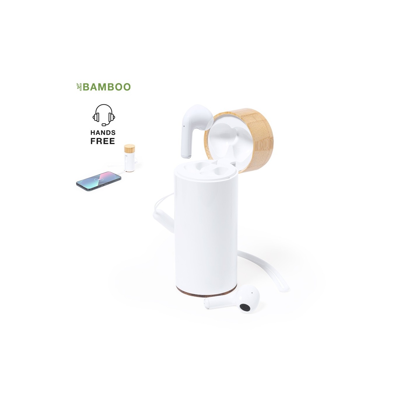 Los Auriculares intraurales Bluetooth® 5.0 con power bank en base de bambú. ¡Prácticos y personalizables! ¡Disfruta de la música donde quieras!