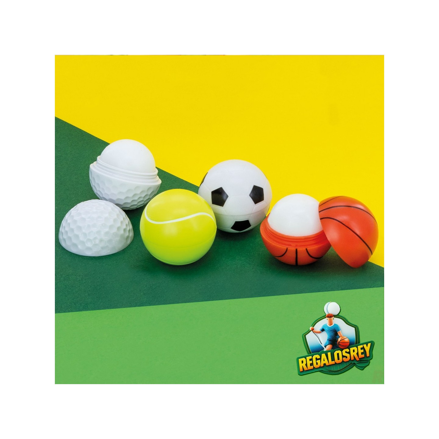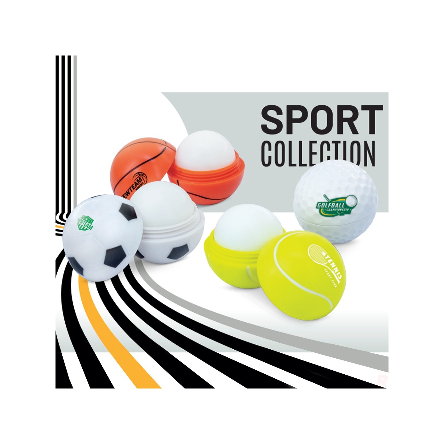 Bálsamo labial SPORTS en ABS con diseños de golf, tenis y baloncesto. Perfecto para personalizar con tu logo. Ideal para promociones deportivas.