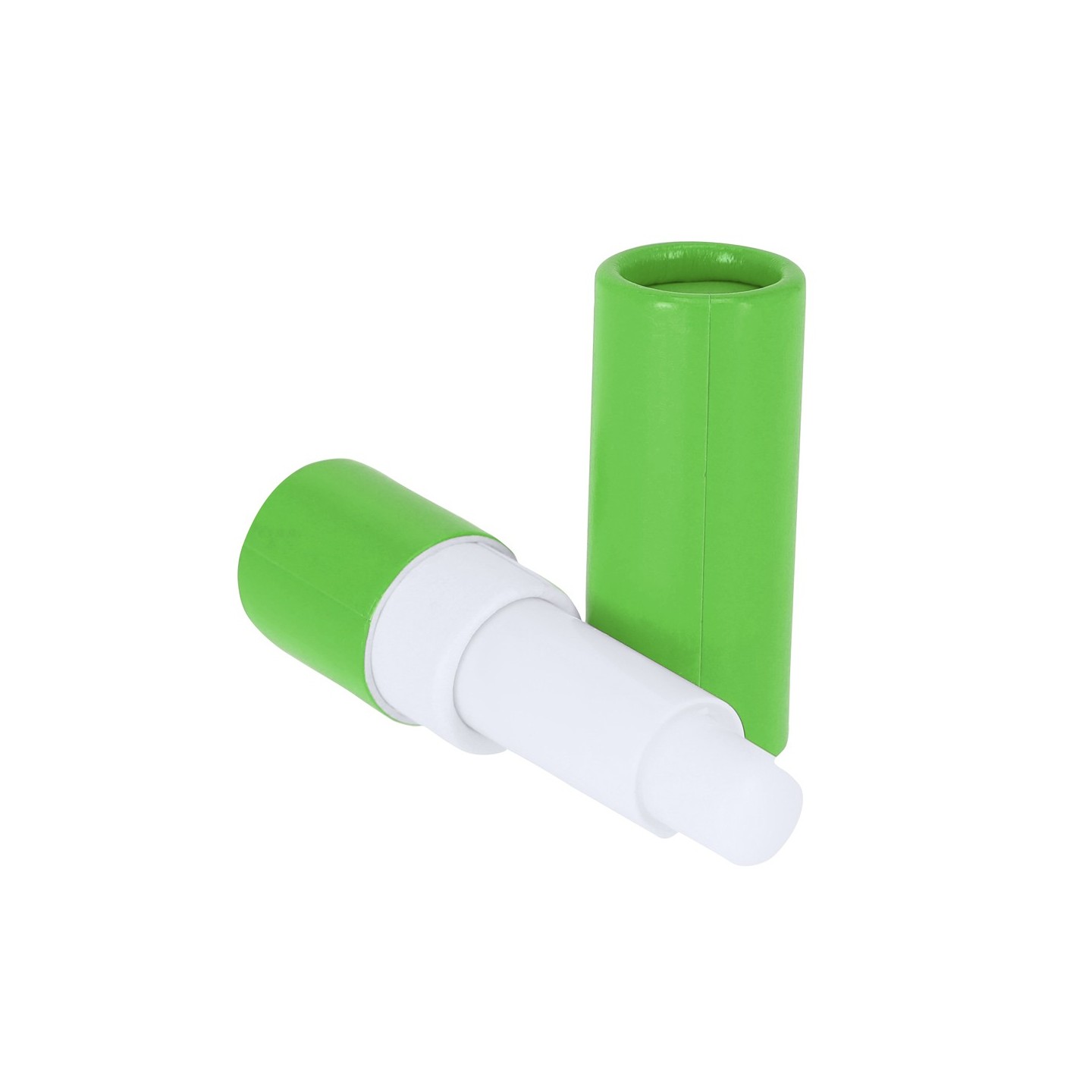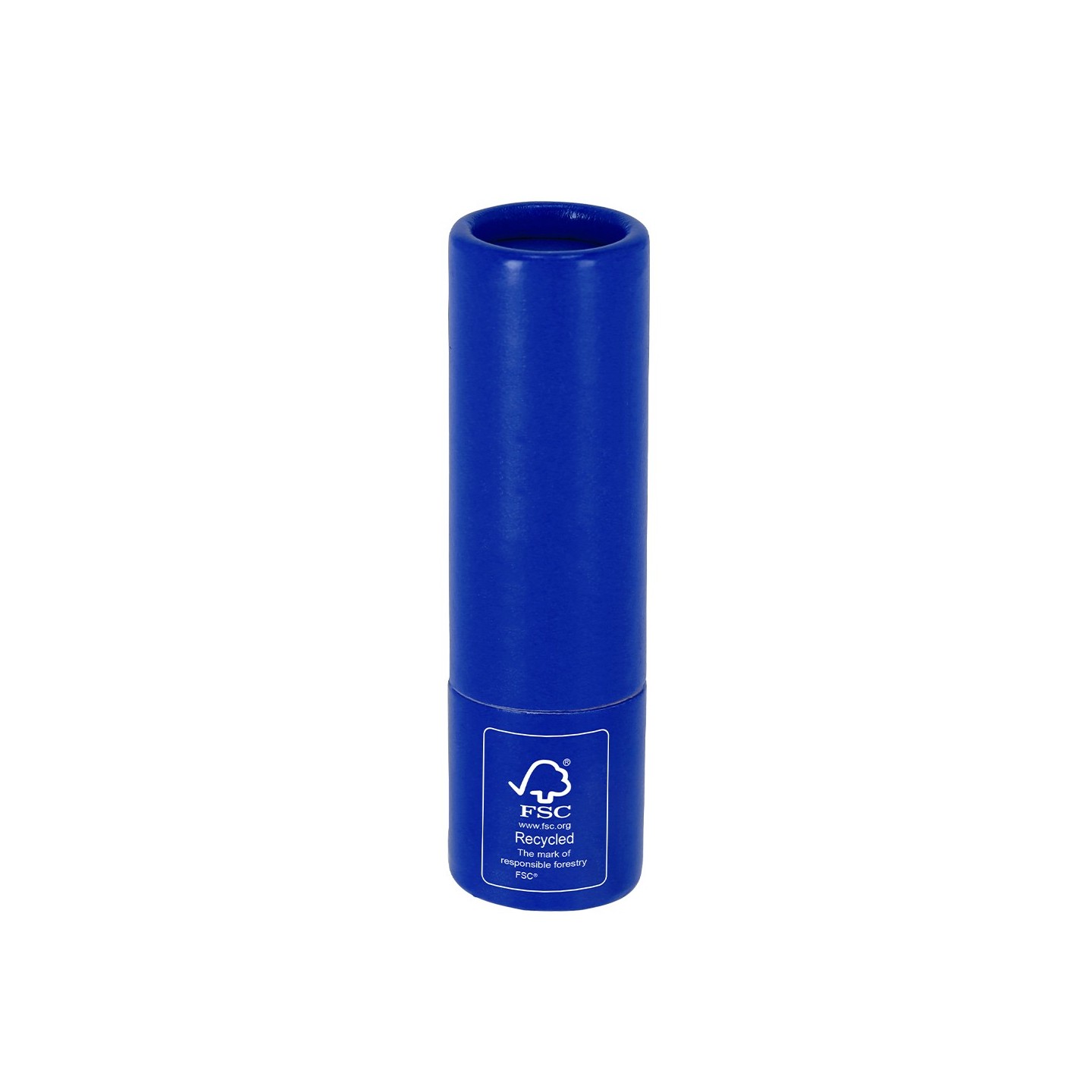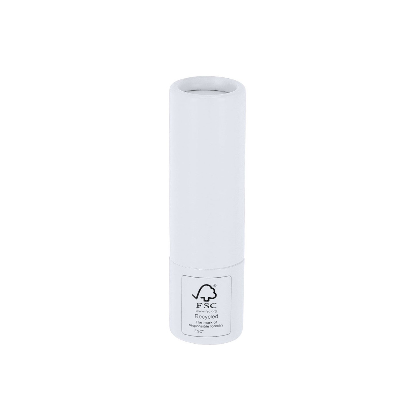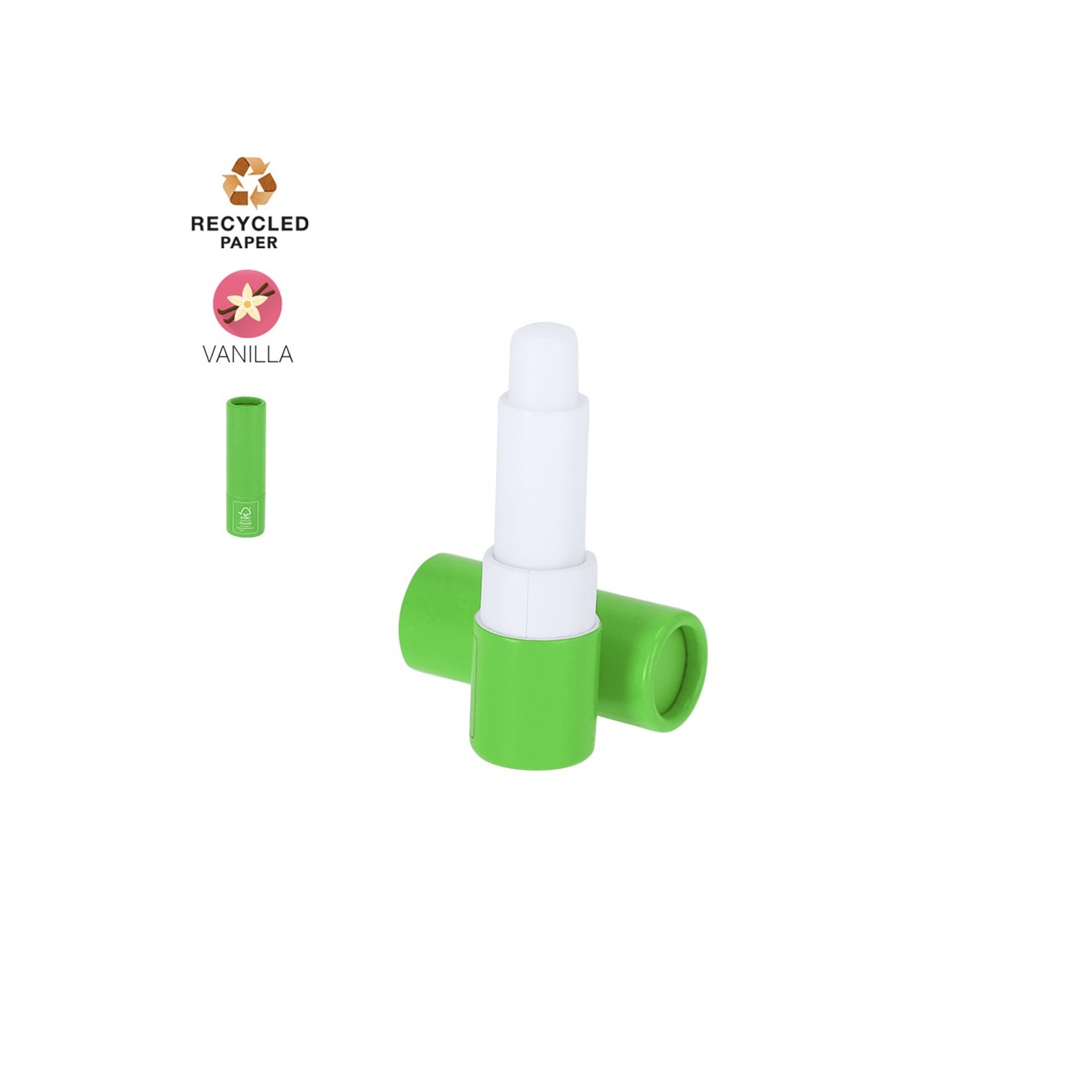 Bálsamo labial en cartón reciclado con certificado FSC, aroma vainilla y protección SPF15. Dermatológicamente testado. Personalizable y eco-amigable, ideal como regalo promocional.