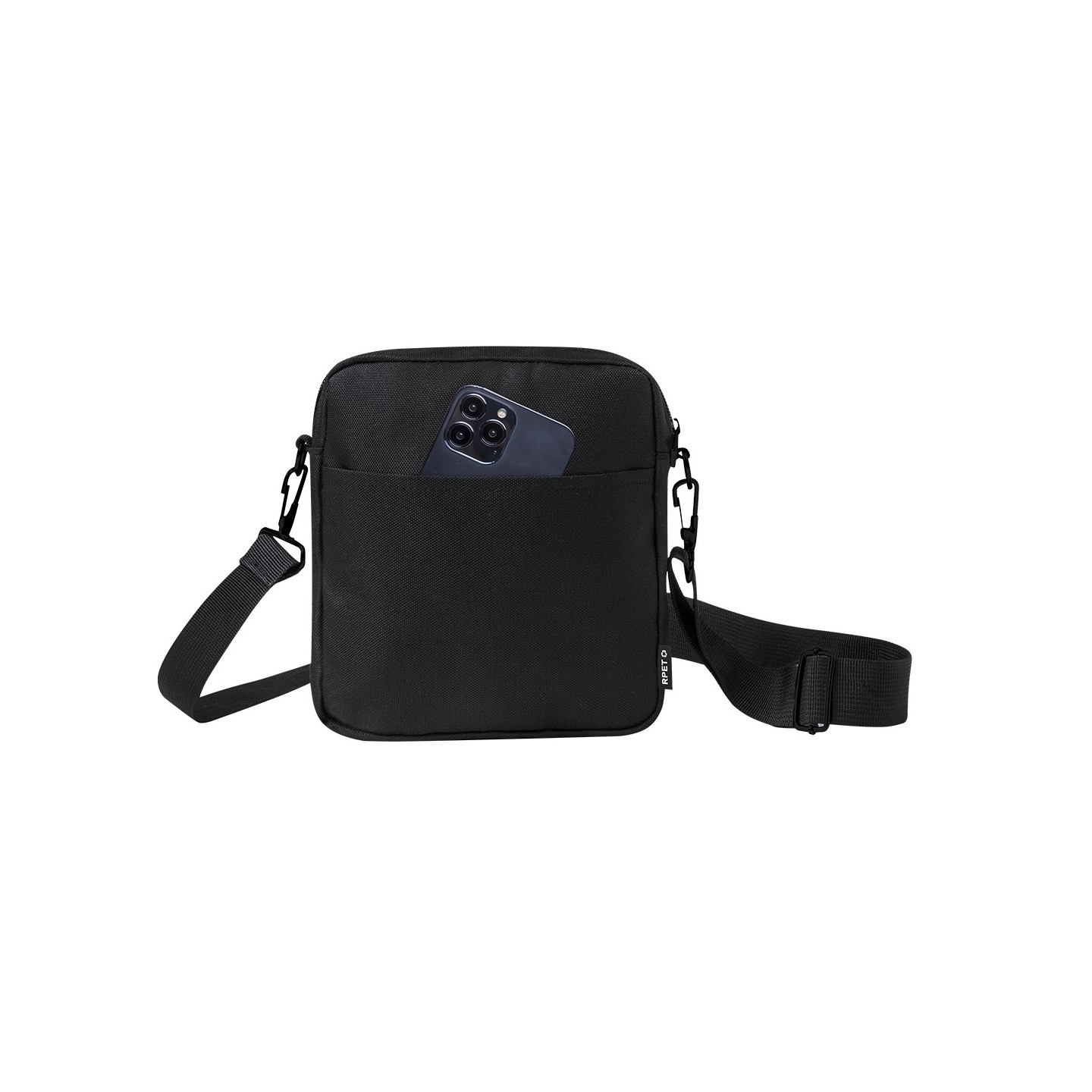 La Bandolera Simun es de poliéster RPET 600D, bolsillo central con cremallera, compartimento frontal accesible. Personalizable y eco-friendly.