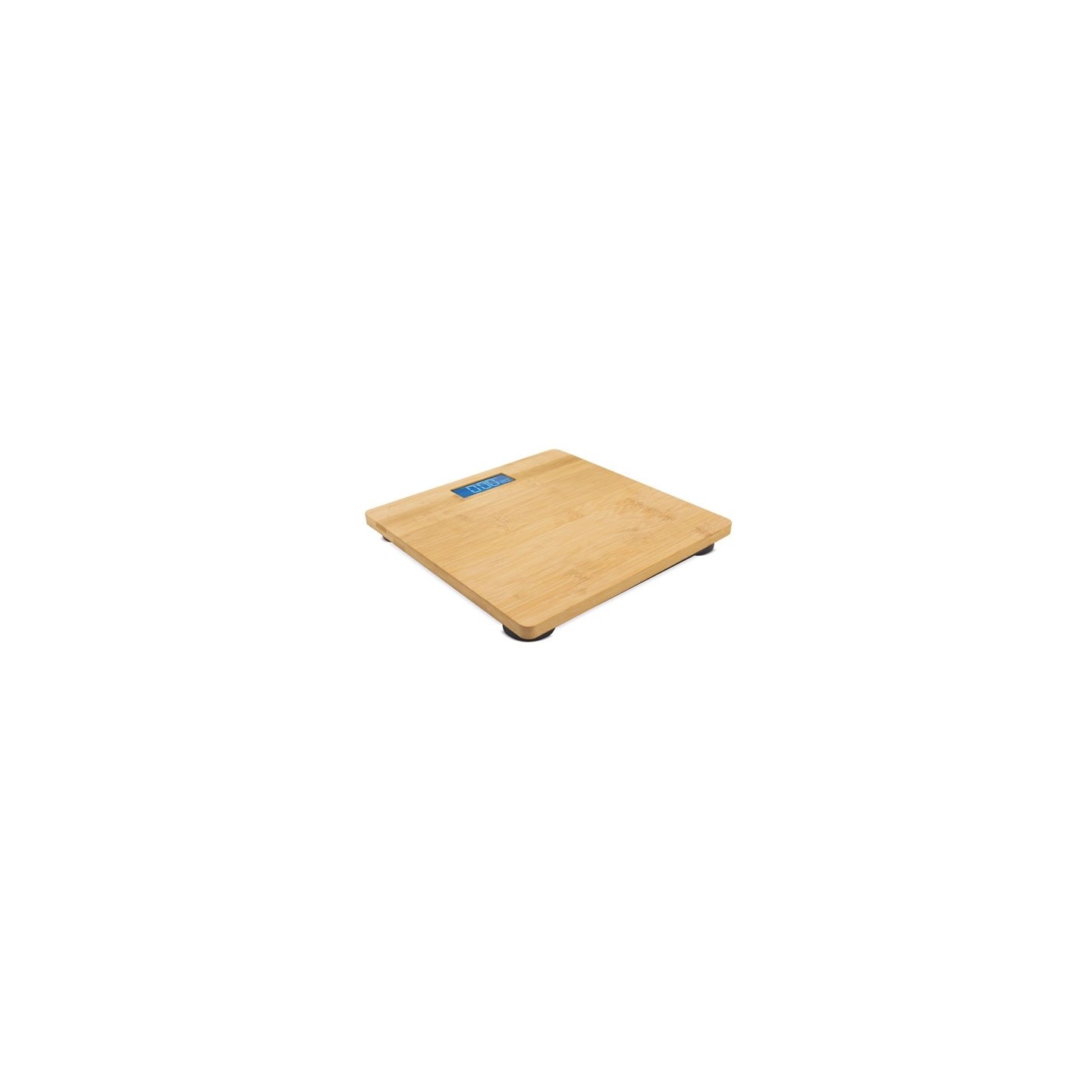Báscula baño ecológica bambú medición temperatura, pantalla LCD azul y base antideslizante. Personalizable logotipo. Medidas: 28 x 3 x 28 cm.
