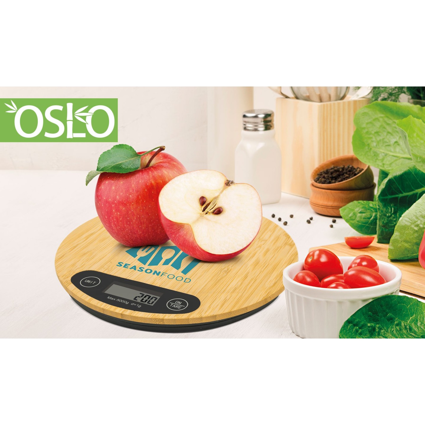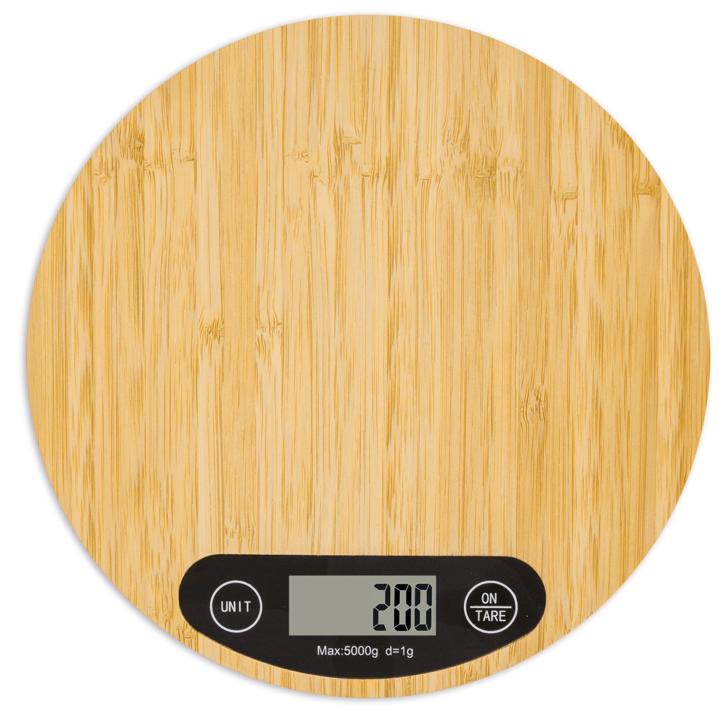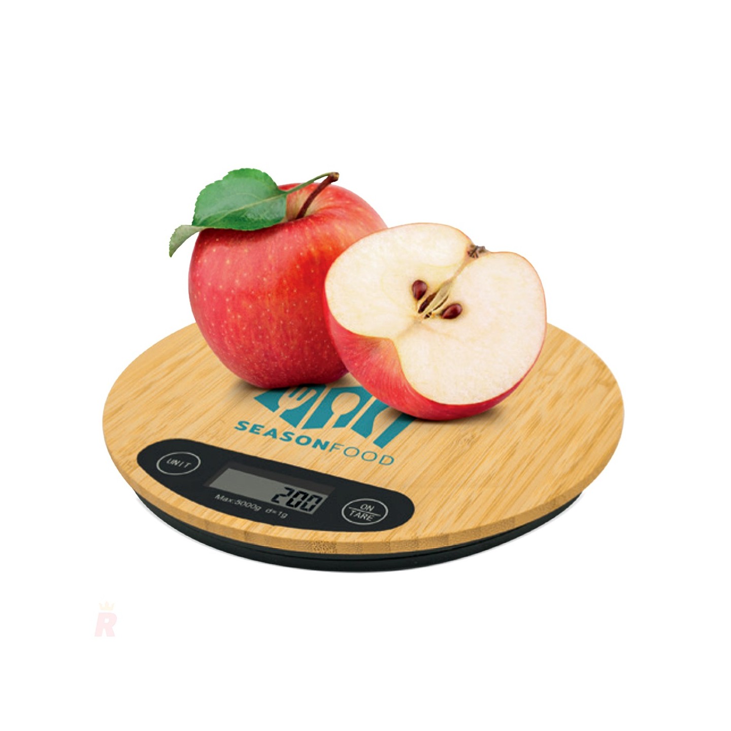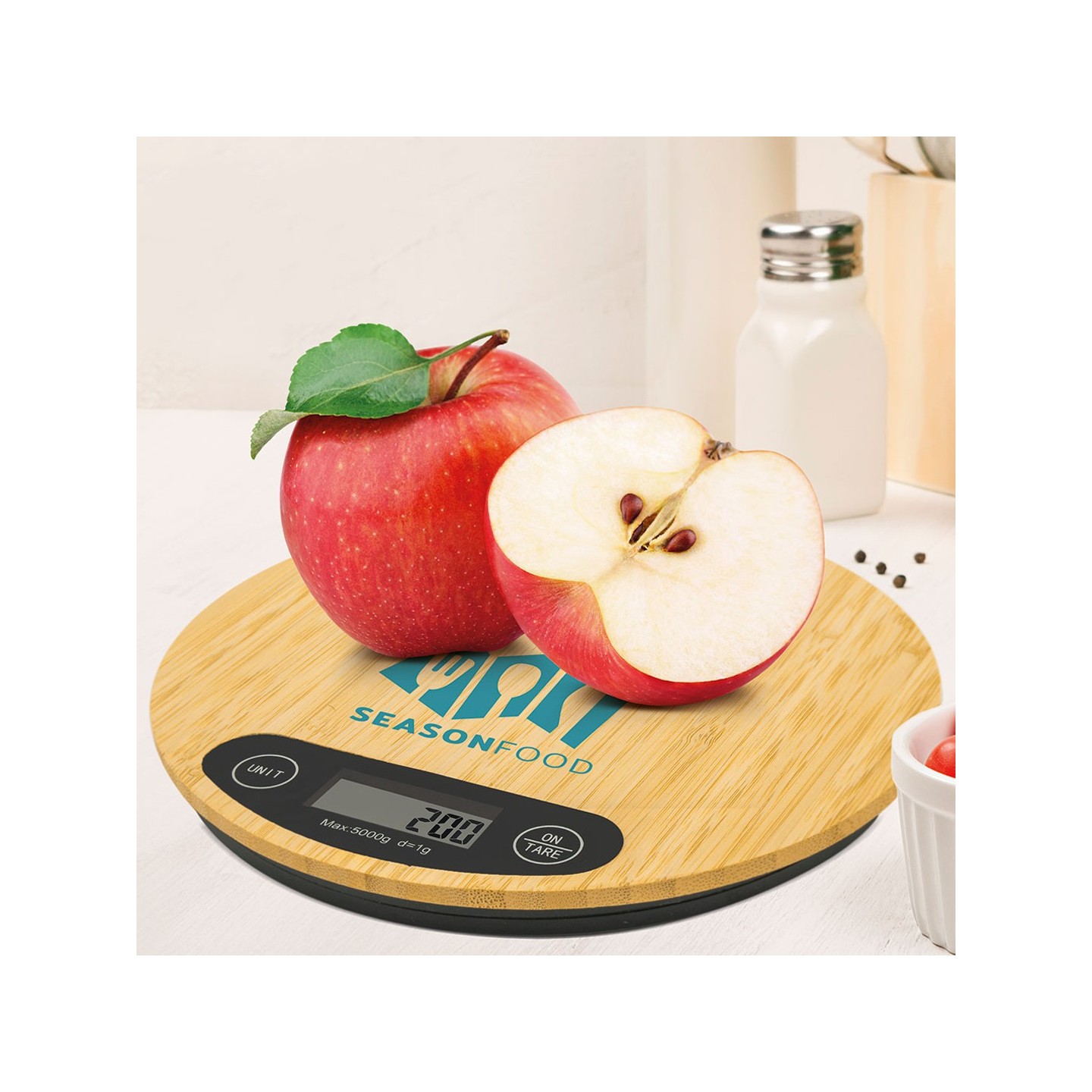 Báscula cocina circular bambú con sensor alta precisión, capacidad máxima 5 kg y sensibilidad 1 g. Pantalla LCD, función tara y apagado automático. Personalizable con tu logotipo.