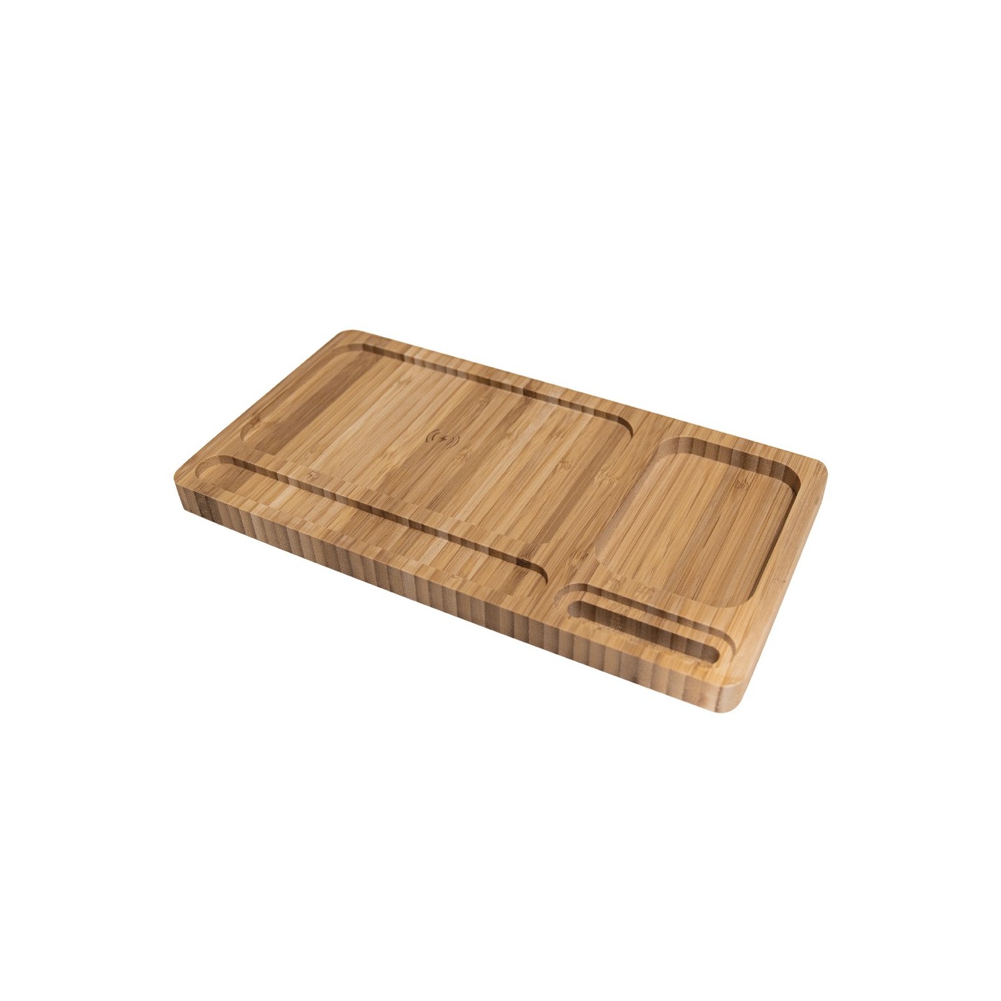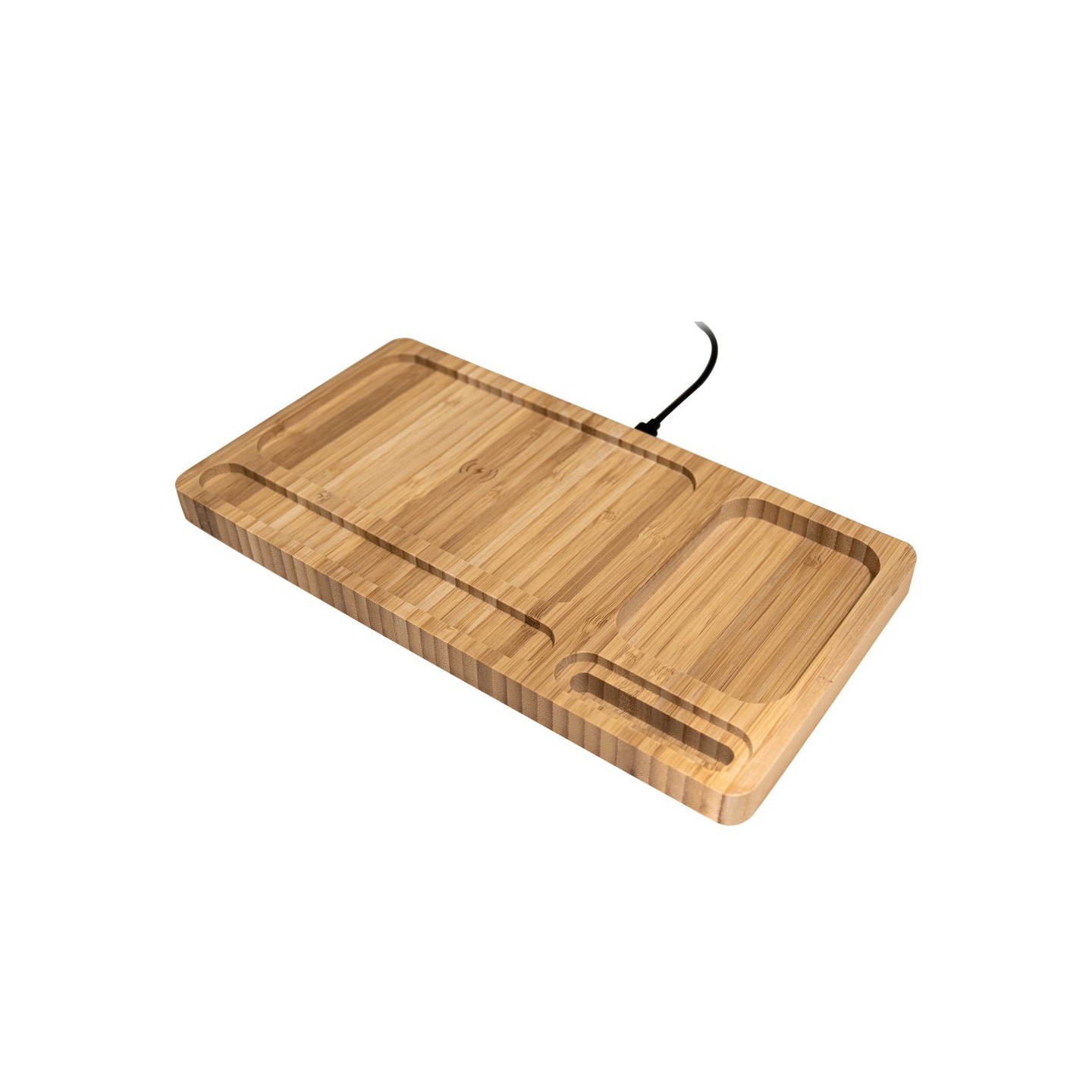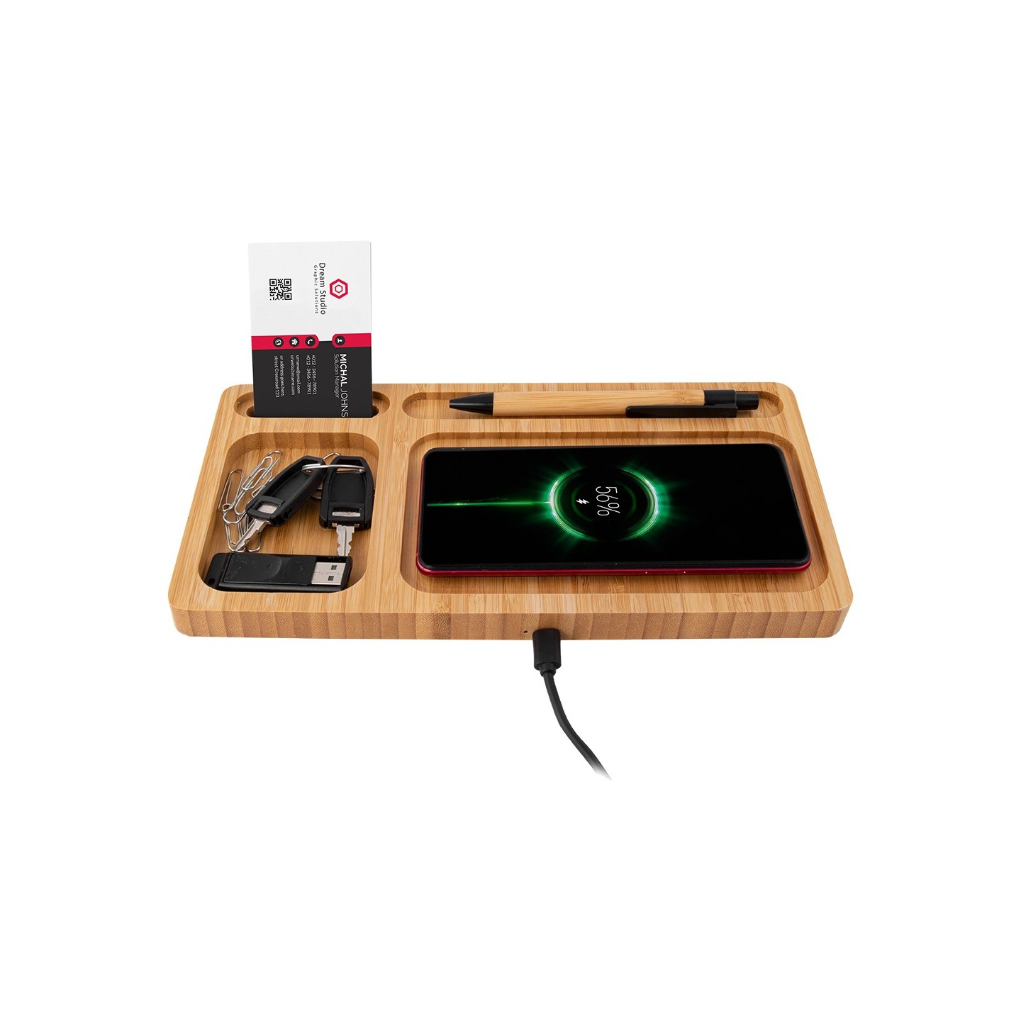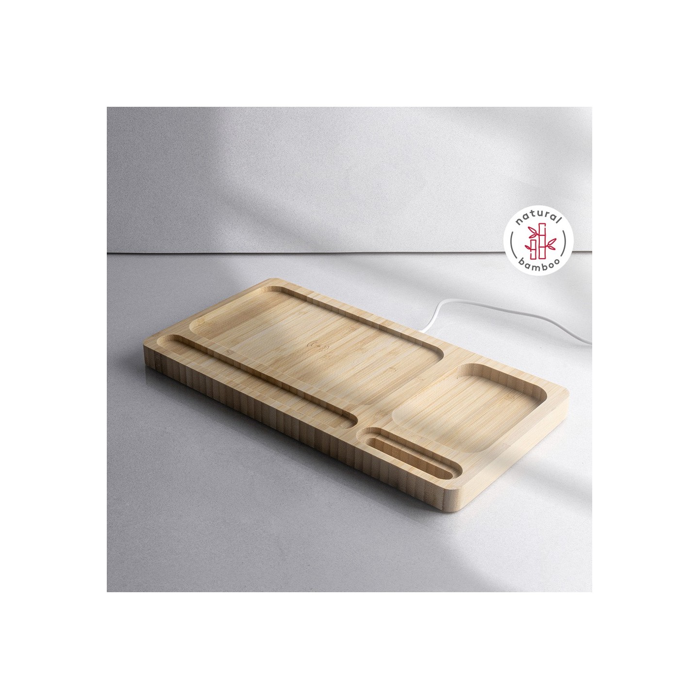 La Base de Carga Shen es inalámbrica 10W y organizador en bambú. Carga y ordena con estilo. Cable USB-C incluido. Certificada CE, RoHS, EMC