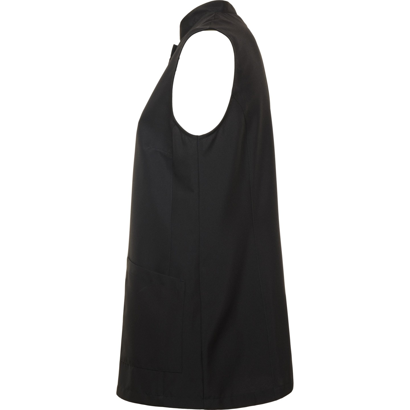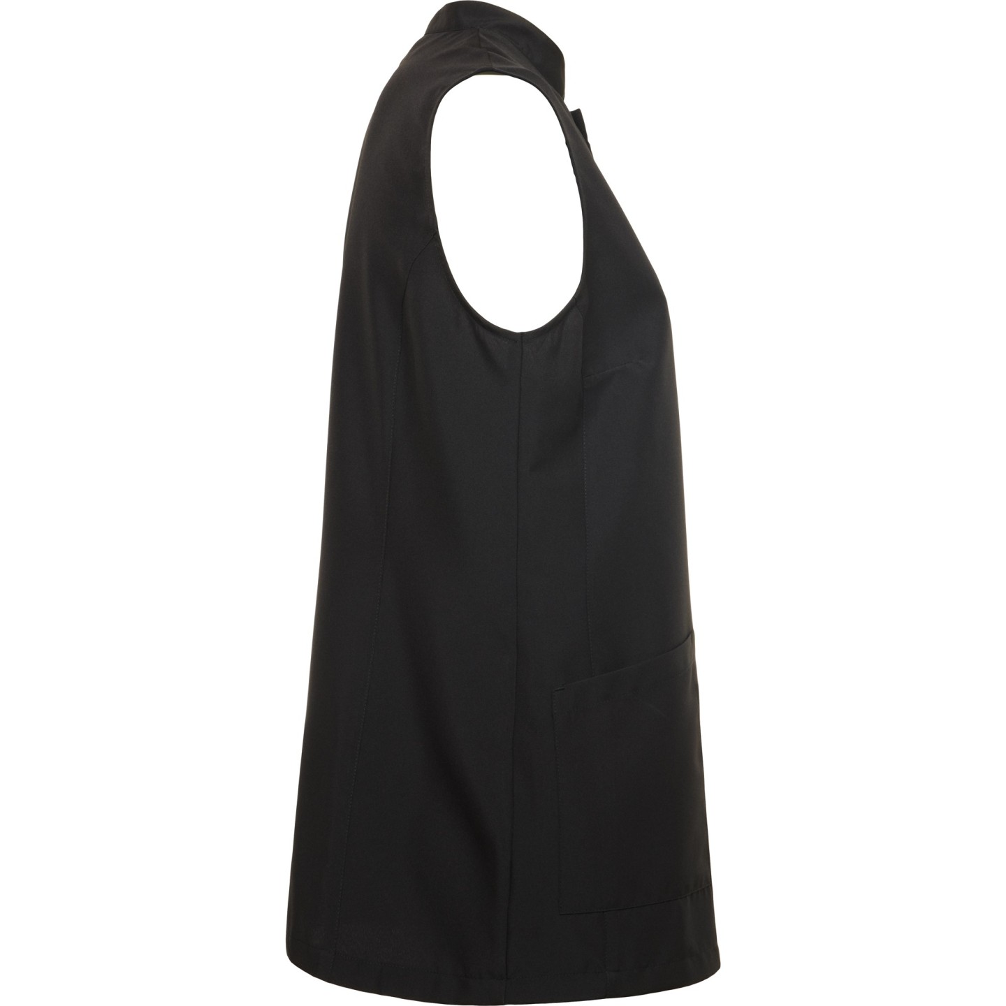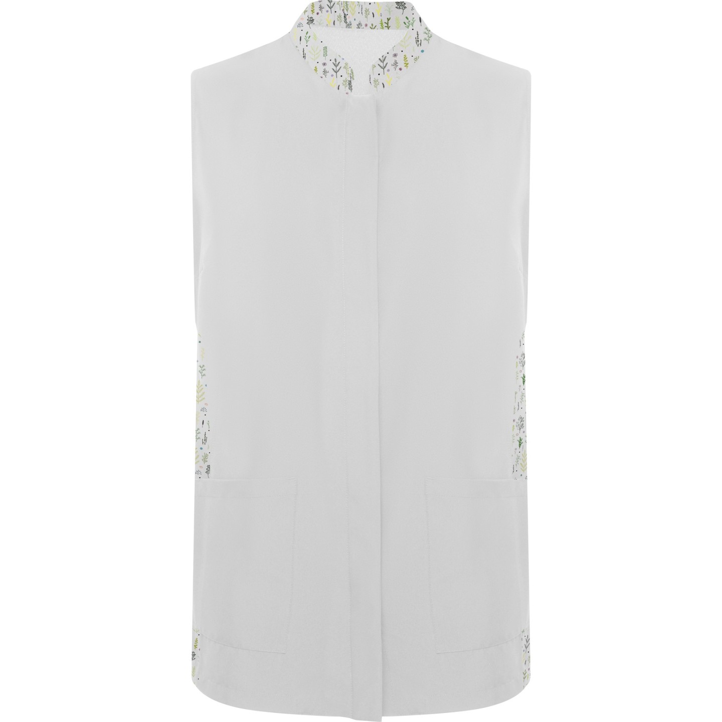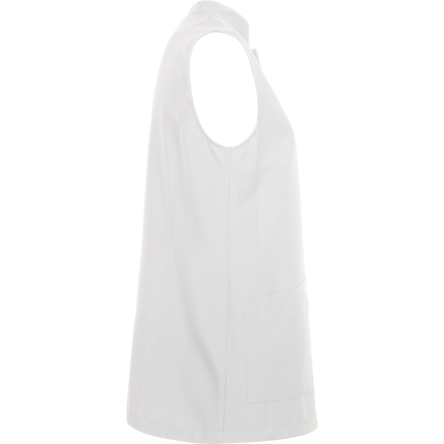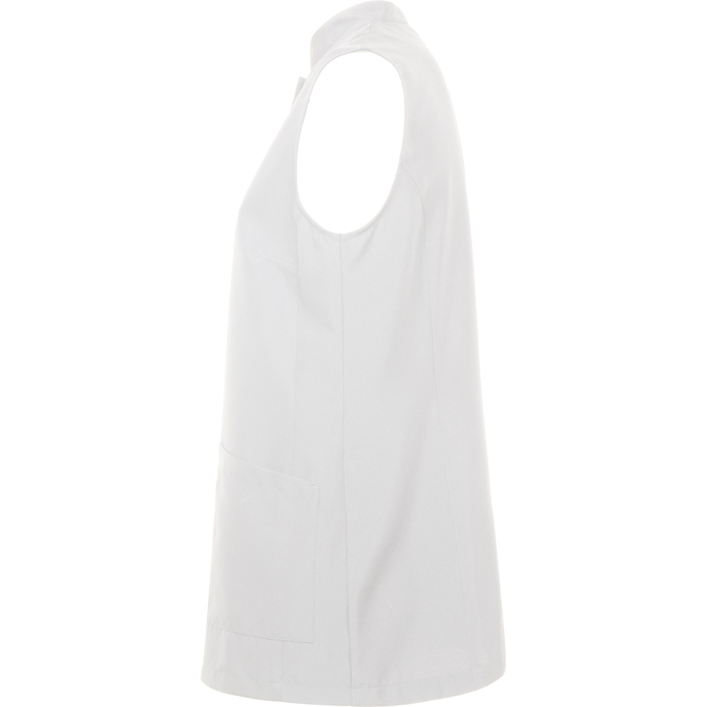 Bata sin mangas para mujer con cuello mao, bolsillos frontales y cierre automático oculto. Ideal para estética, peluquería y alimentación. Personalizable con logotipo