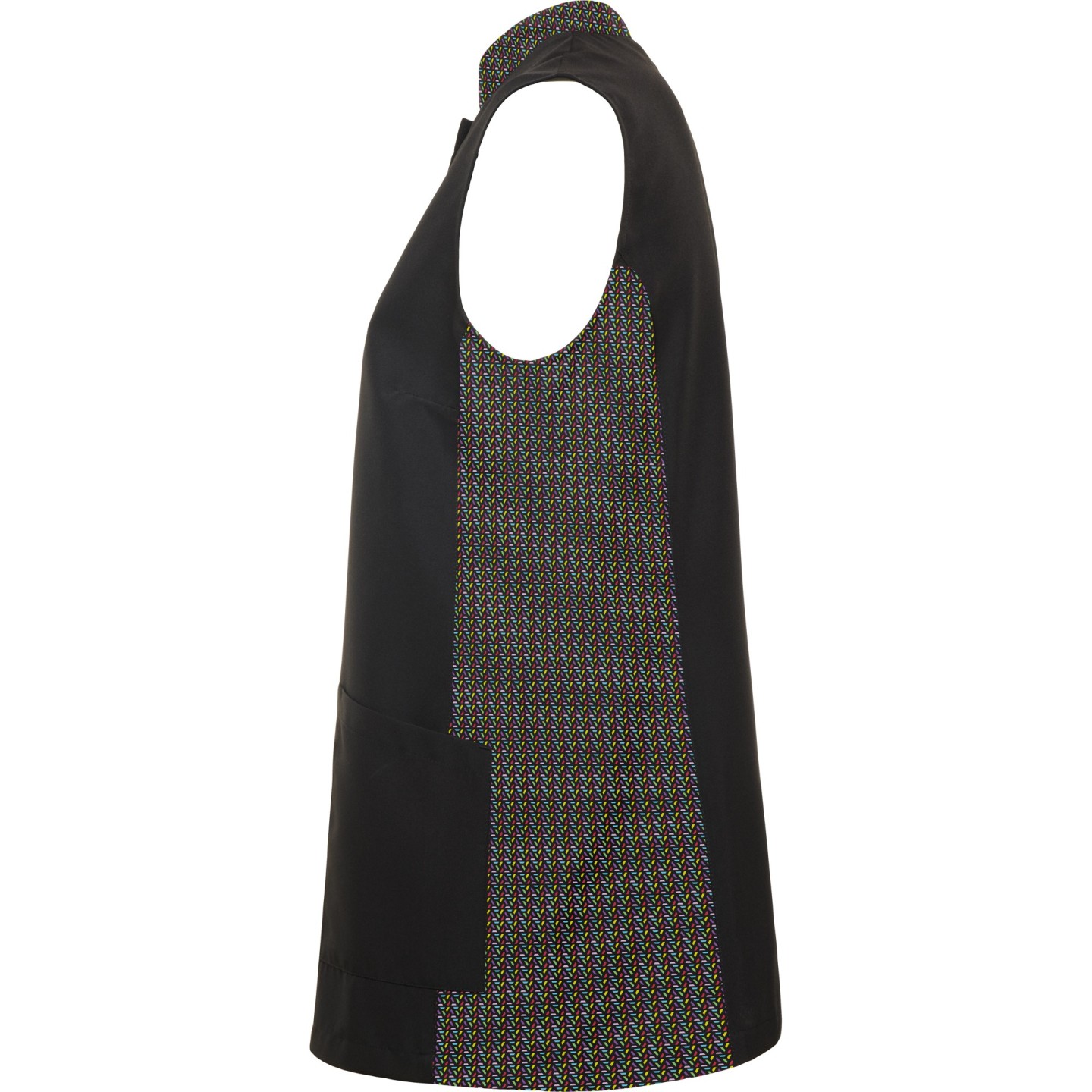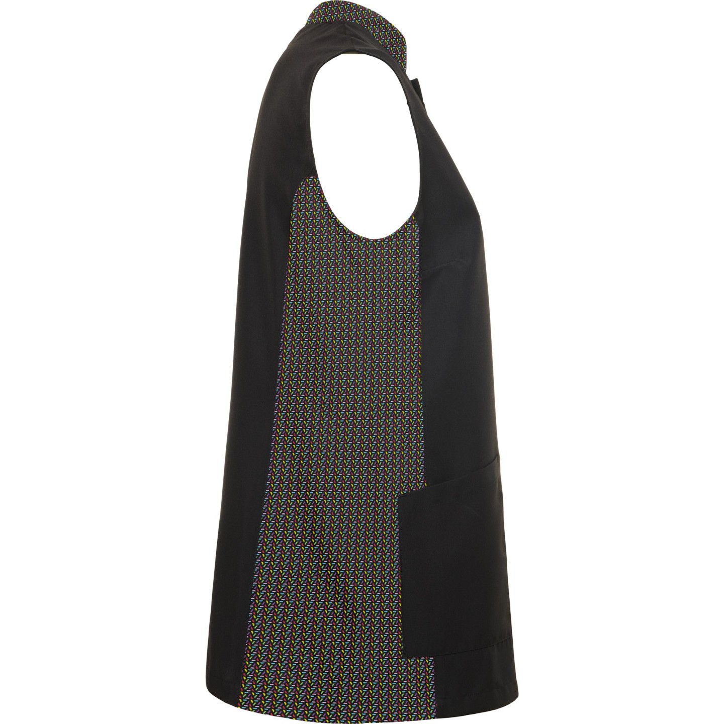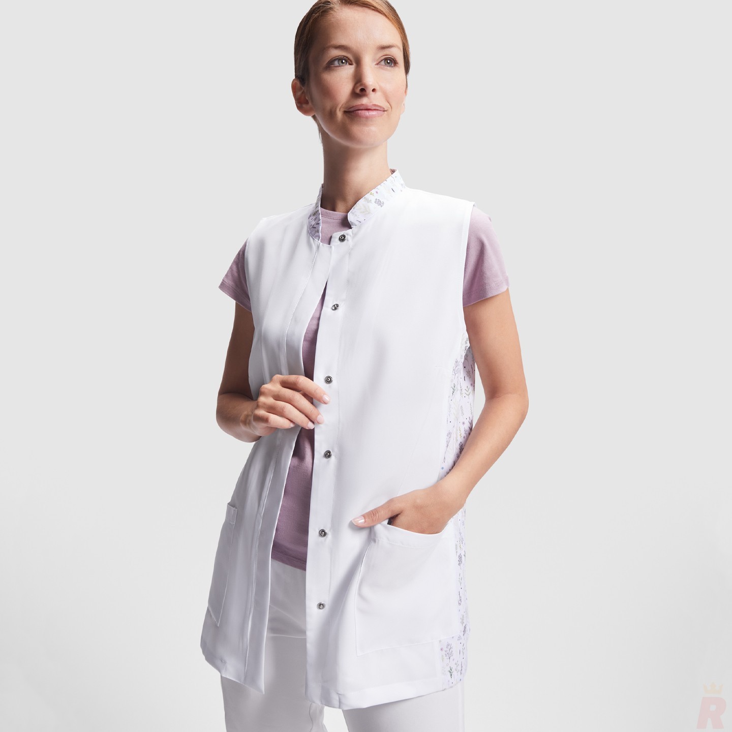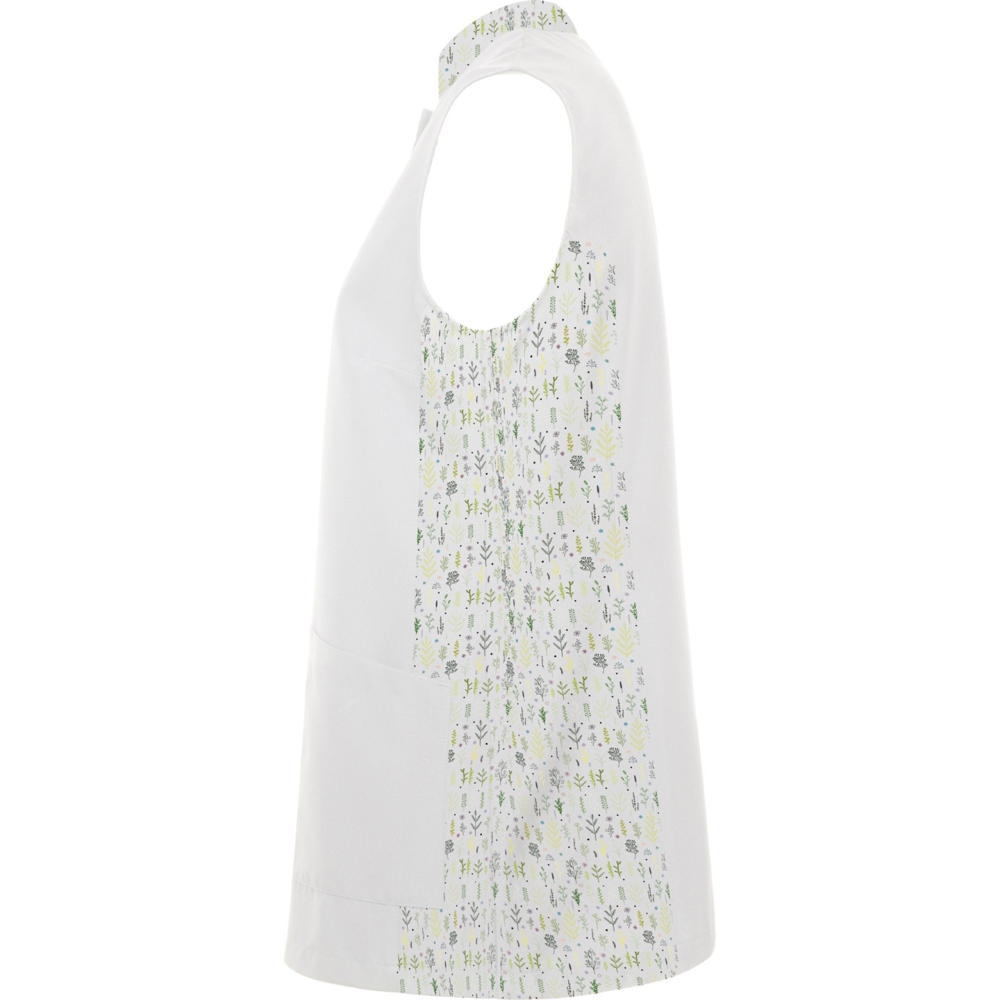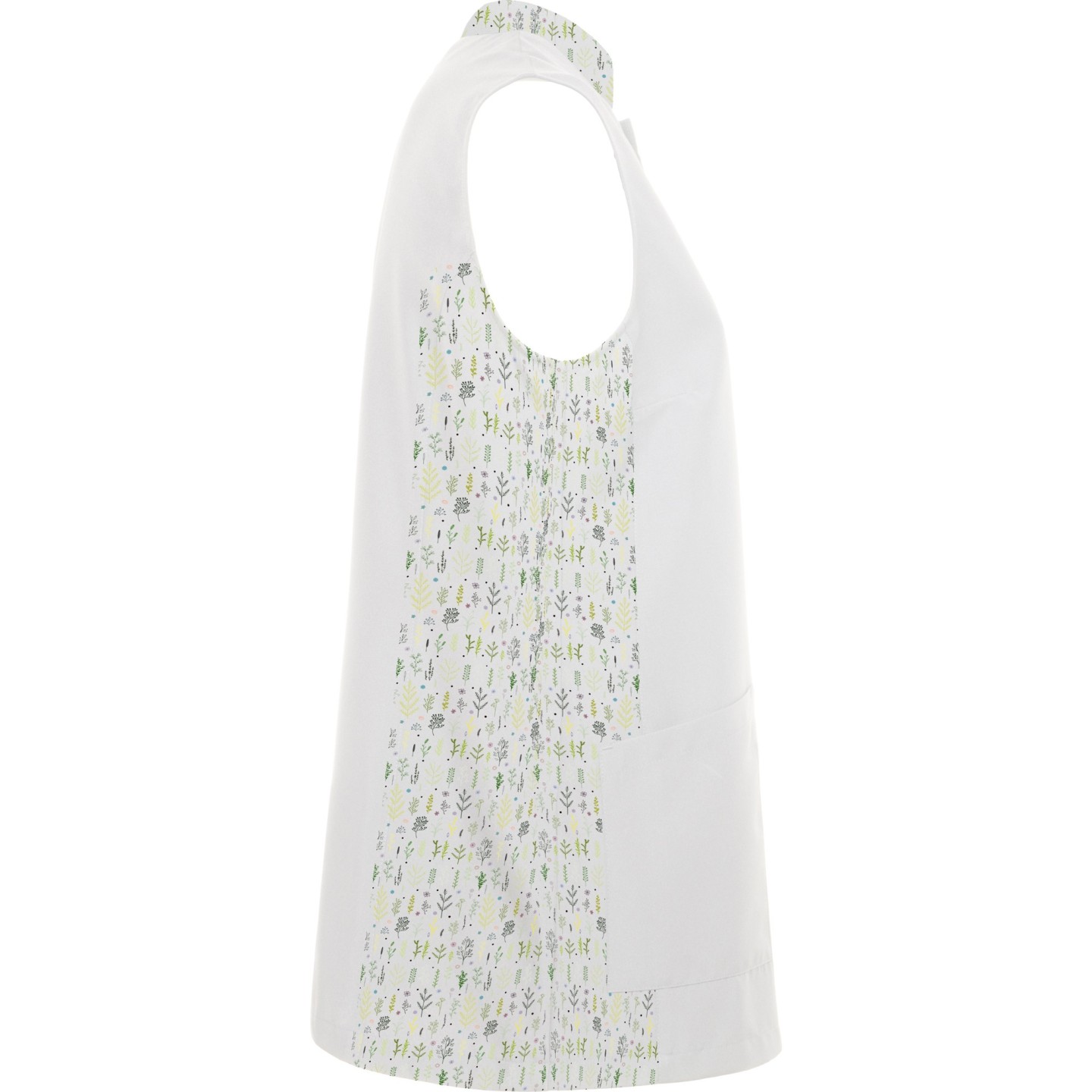 Bata sin mangas para mujer con cuello mao, bolsillos frontales y cierre automático oculto. Ideal para estética, peluquería y alimentación. Personalizable con logotipo