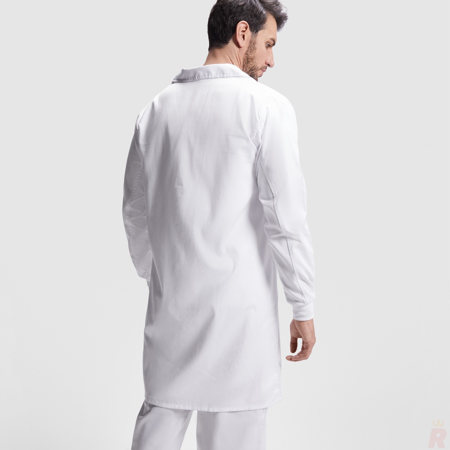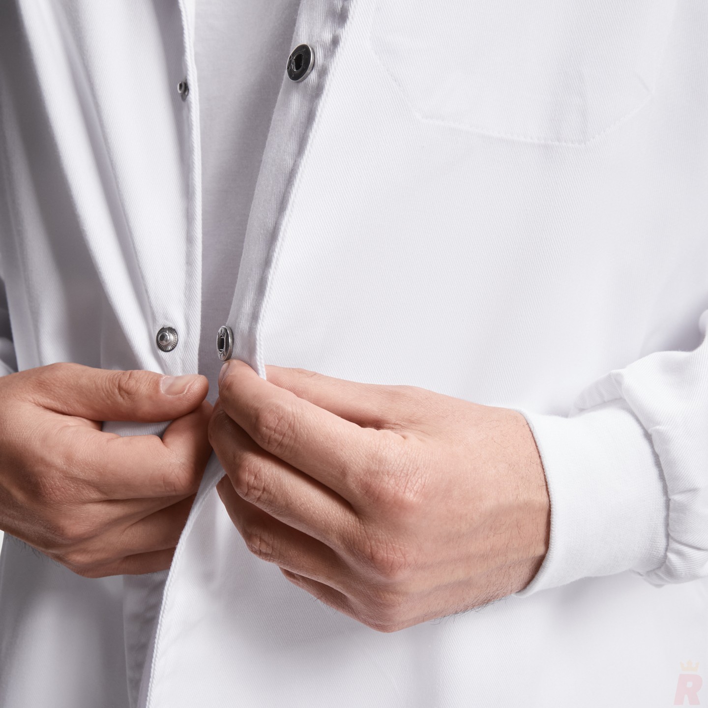 Bata laboral unisex para alimentación, sanidad y laboratorios. Cómoda, resistente, con cierre automático, puños de canalé y bolsillo interior