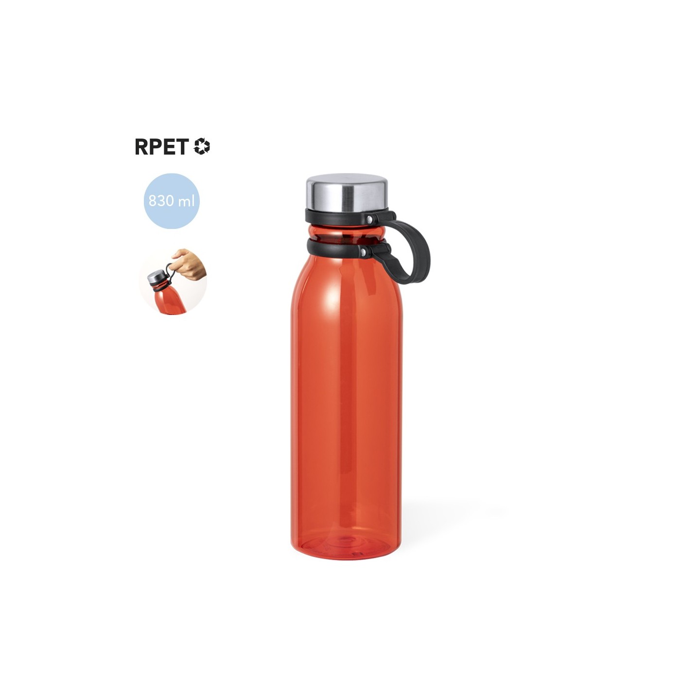 Con una capacidad de 830 ml, este bidón fabricado en RPET es una excelente opción para mantenerte hidratado mientras cuidas el medio ambiente. El RPET, elaborado a partir de plástico reciclado, promueve la reutilización de residuos plásticos y contribuye a la sostenibilidad del planeta.