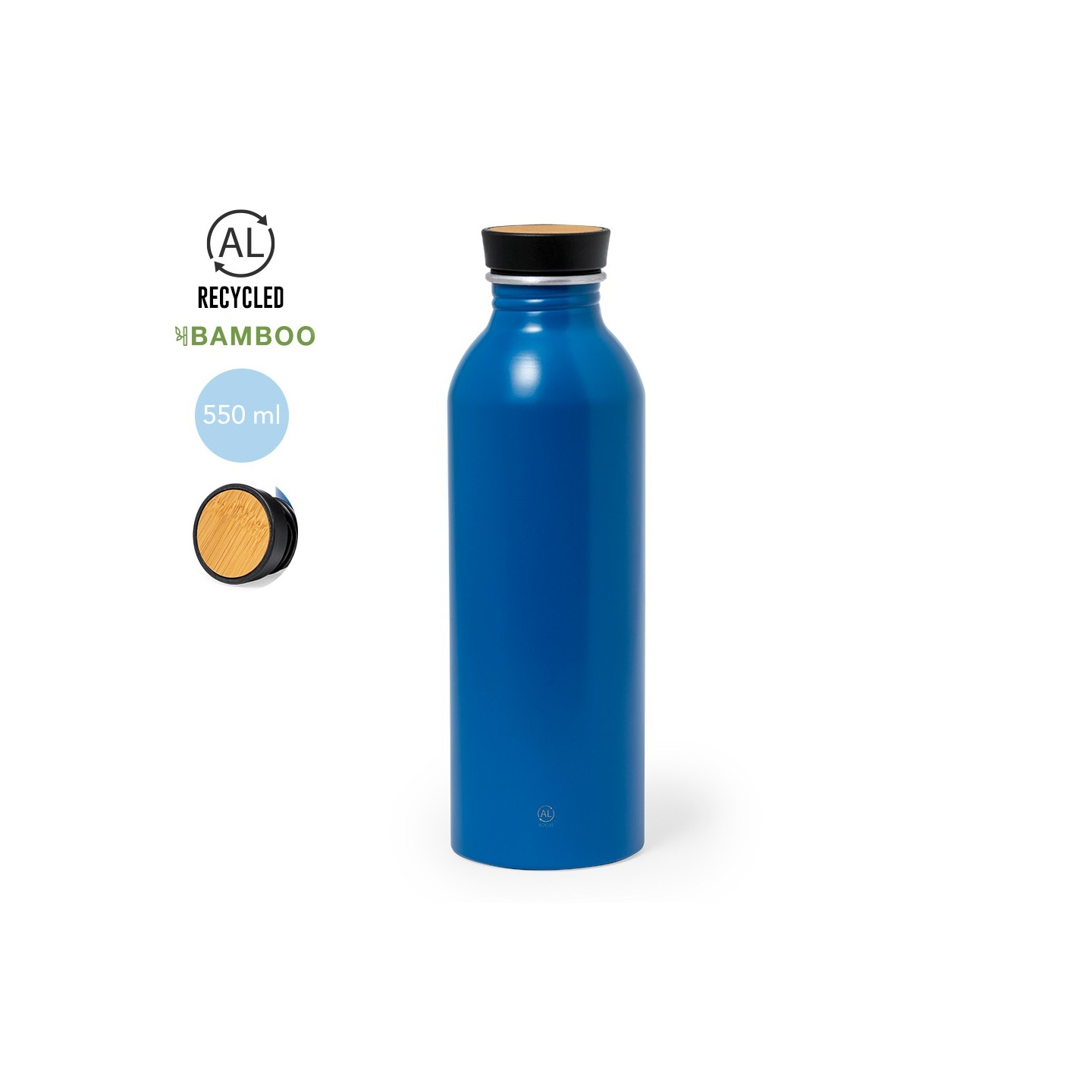 El Bidón Claud es de 550 ml, elegante aluminio reciclado, tapón bambú. Libre de BPA, presentado en embalaje eco-friendly.