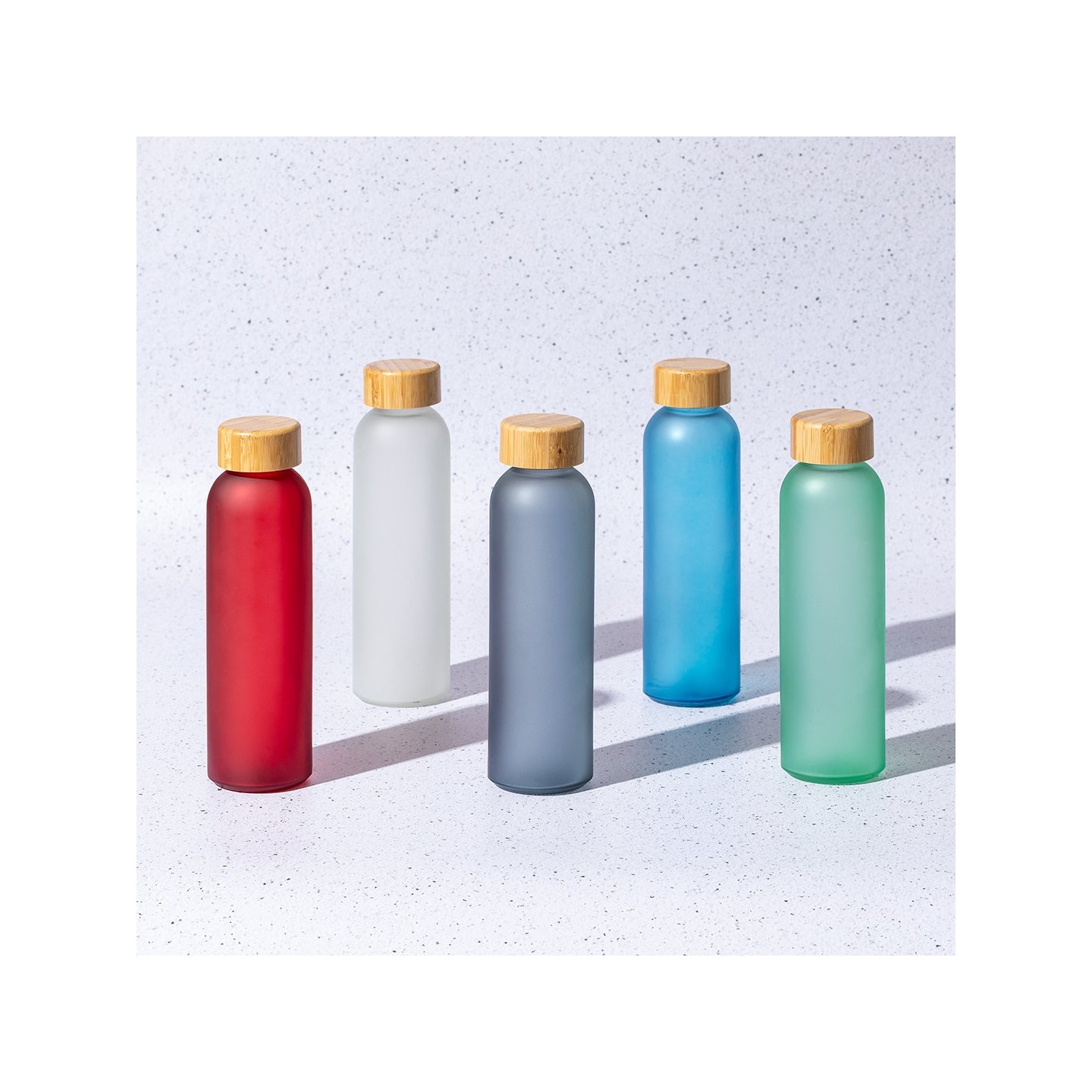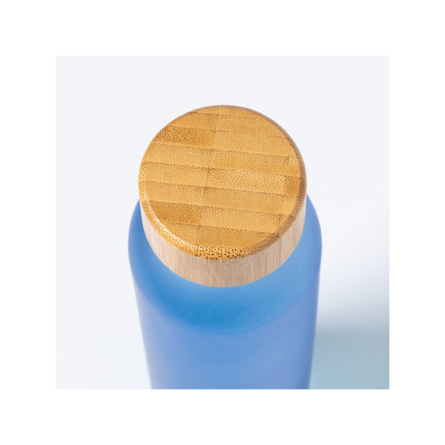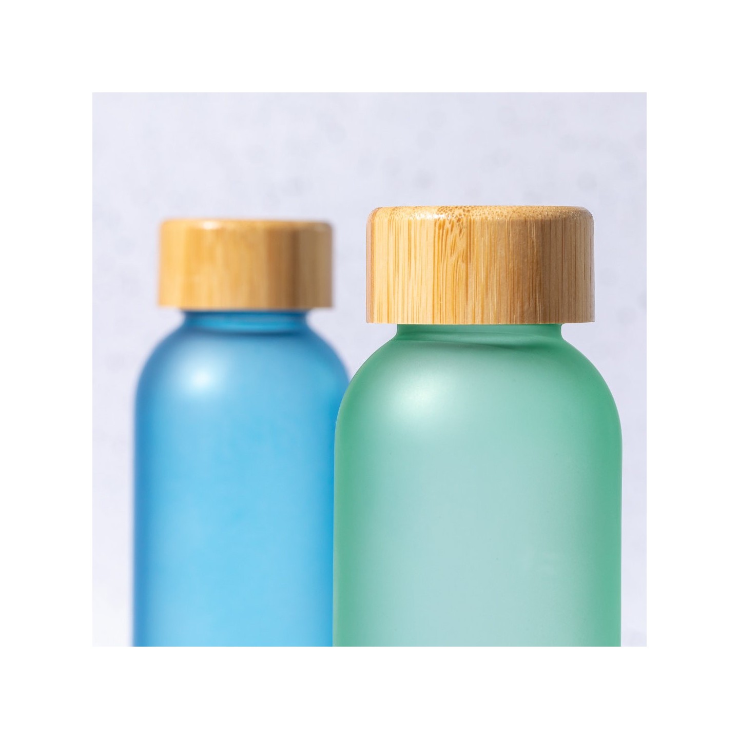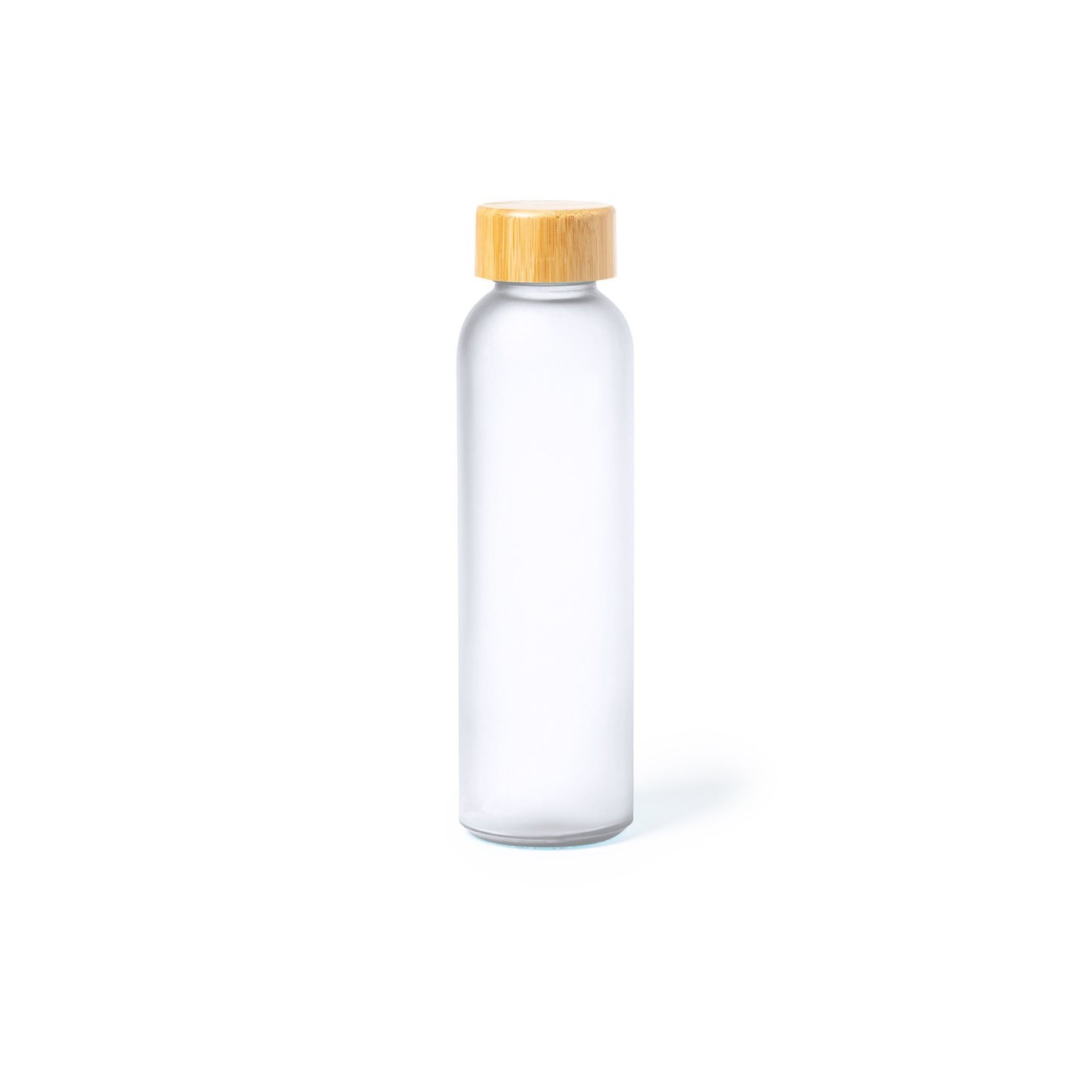 Bidón Eskay de 500 ml, cuerpo de cristal, tapón de bambú a rosca y libre de BPA. Disponible en varios colores. Ideal para regalos corporativos.