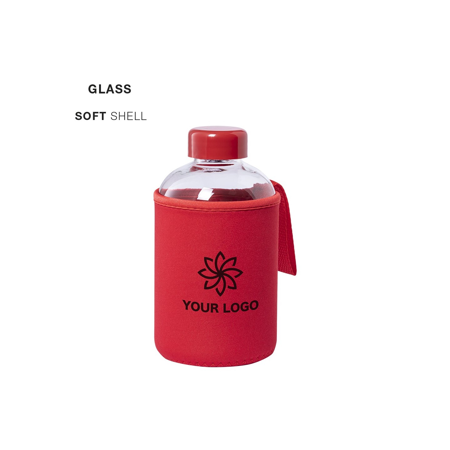 El Bidón Flaber tiene 600ml de capacidad, cuerpo de cristal, tapón a rosca y funda de soft shell. Personalizable. Perfecto para regalos corporativos.
