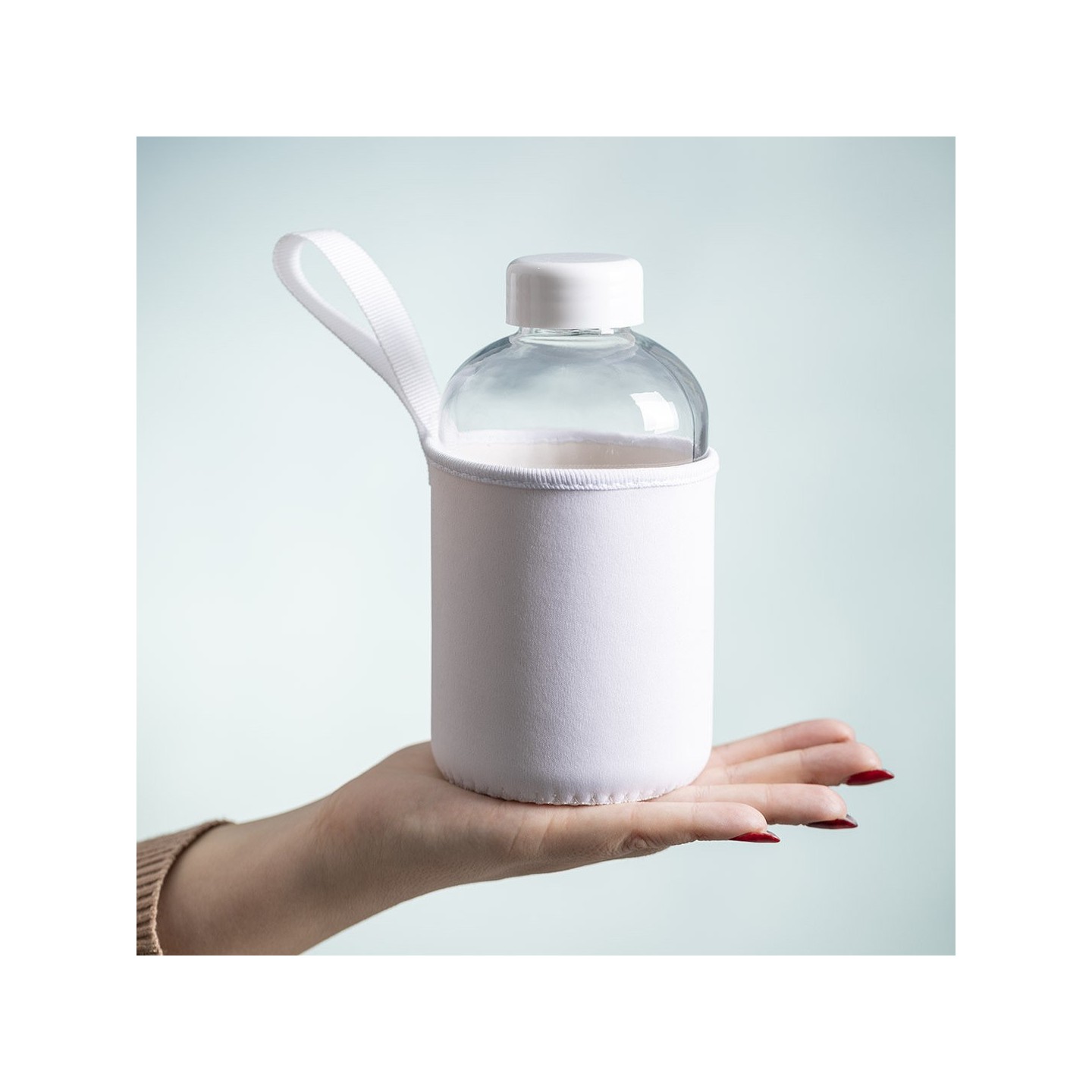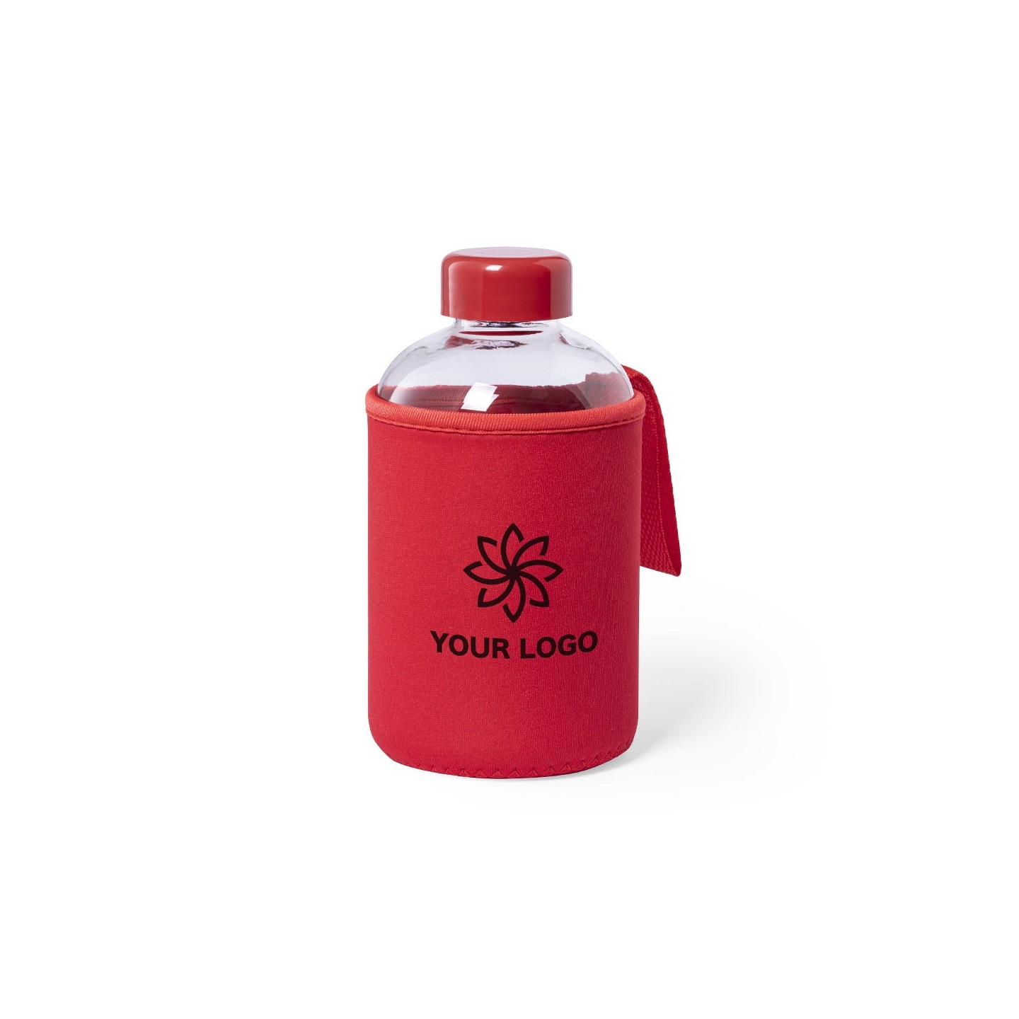 El Bidón Flaber es ideal para regalos corporativos. Con 600ml de capacidad, cuerpo de cristal y tapón a rosca, es personalizable y viene con una funda de soft shell.