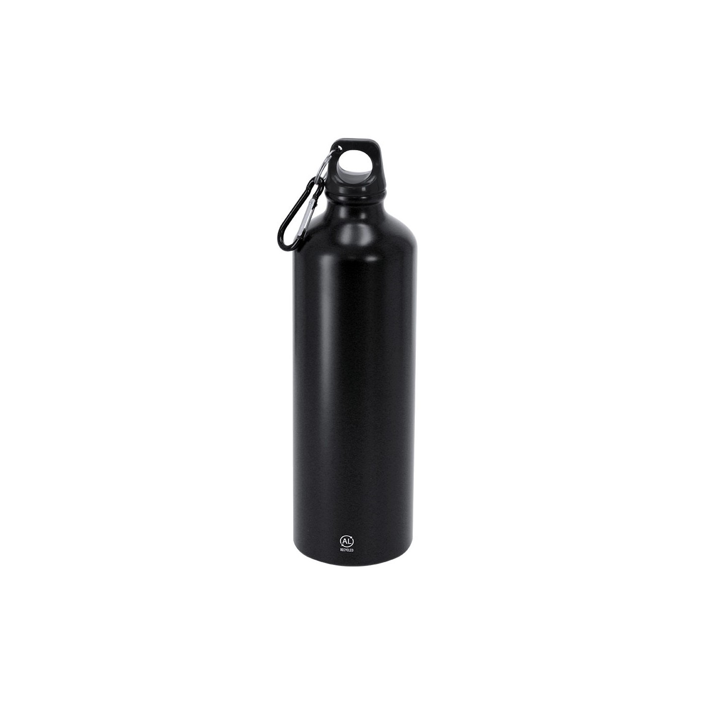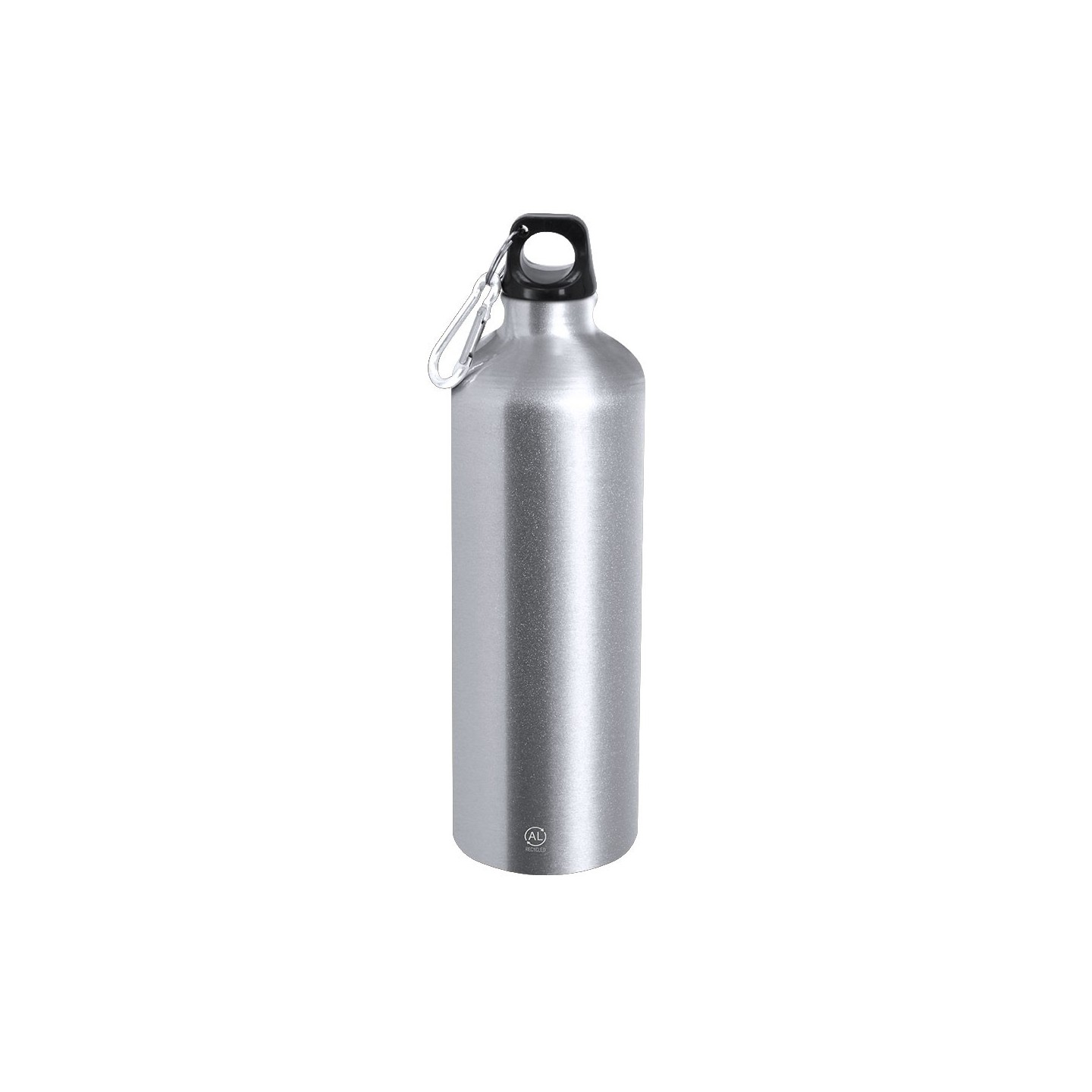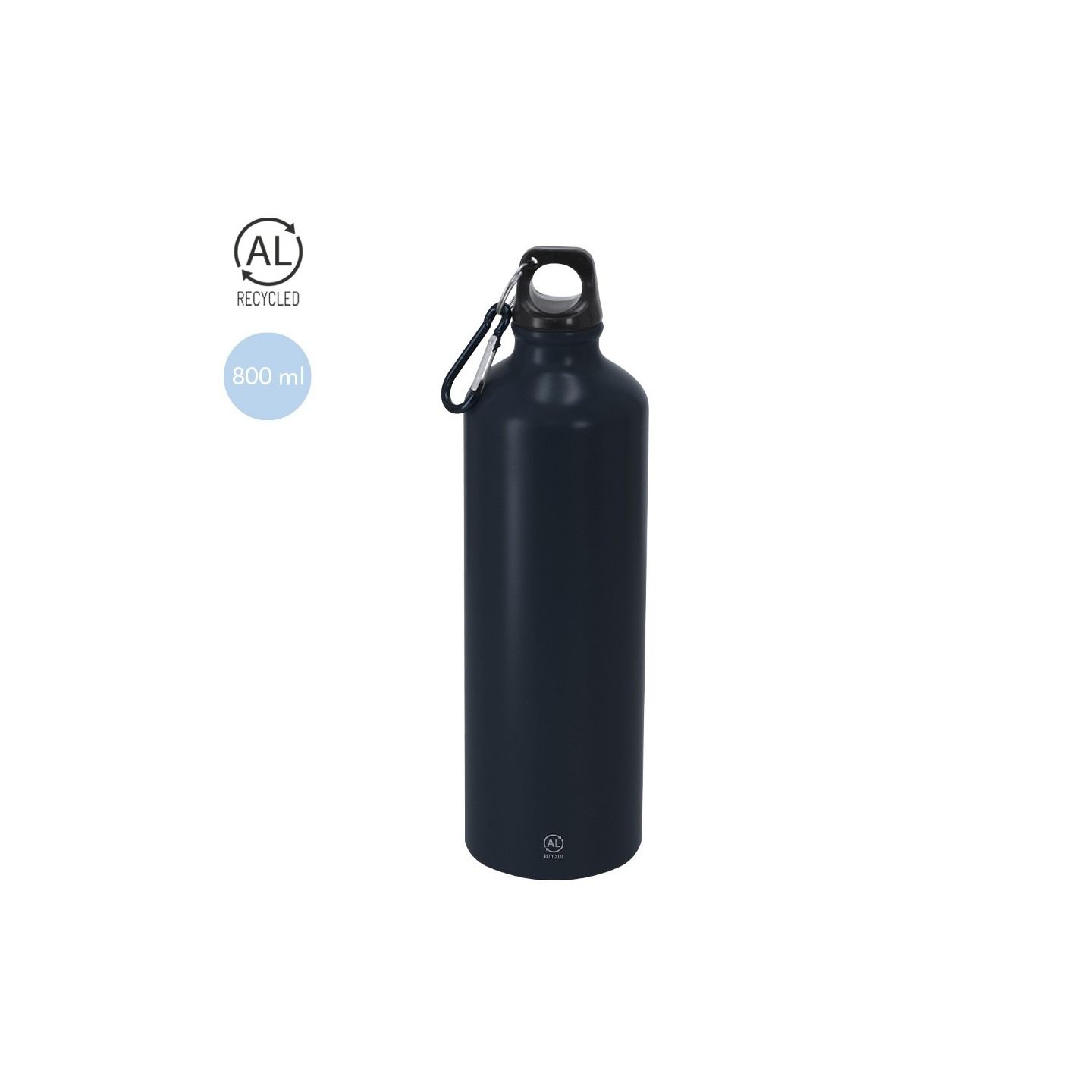 Bidón de 800 ml en aluminio reciclado con tapón a rosca y mosquetón. Personalizable con tu logotipo. Ecológico, resistente y fácil de transportar.