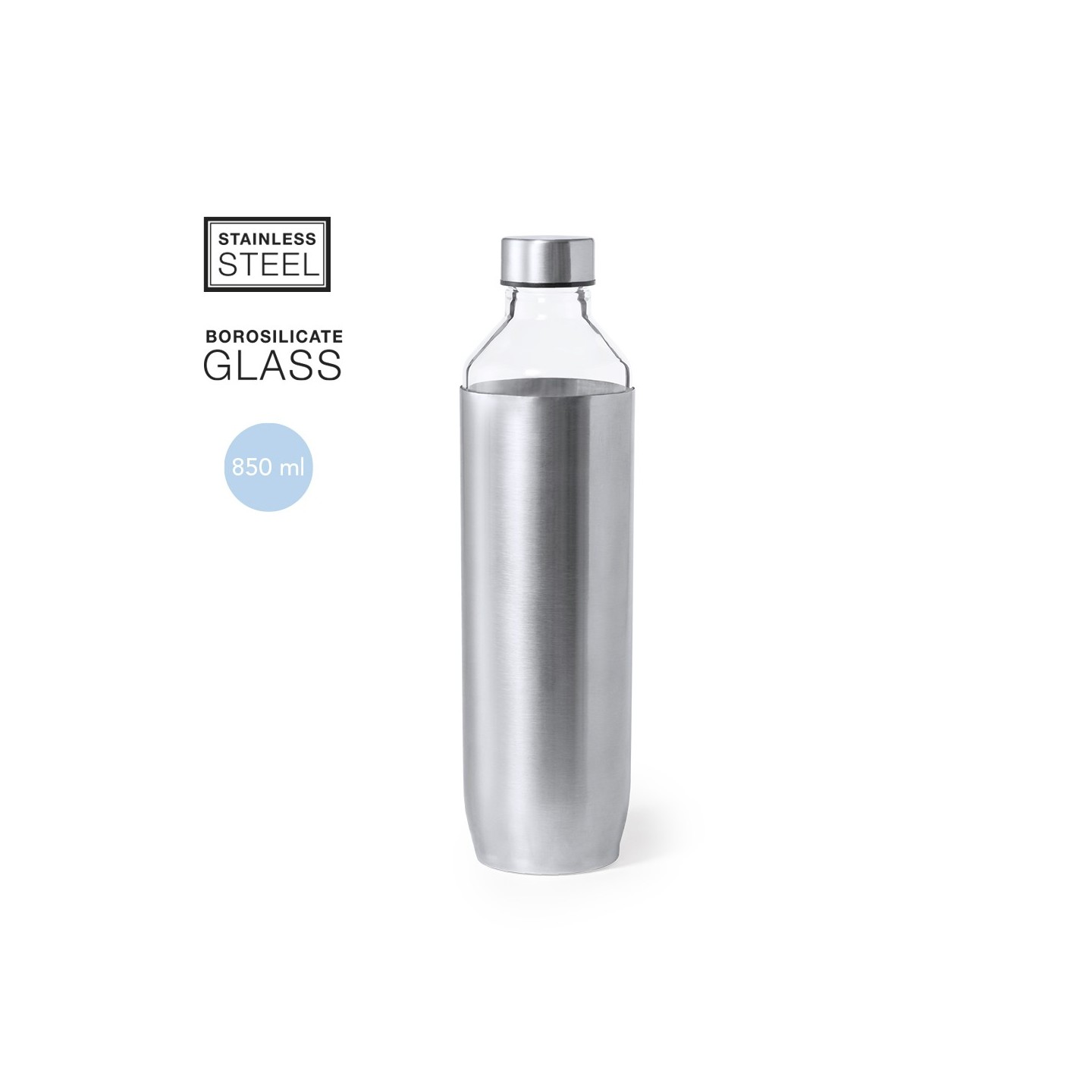 Bidón Ivisur de alta calidad, 850 ml de capacidad. Fabricado en cristal de borosilicato con tapón y funda de acero inoxidable. Elegante y duradero para llevar tus bebidas favoritas.