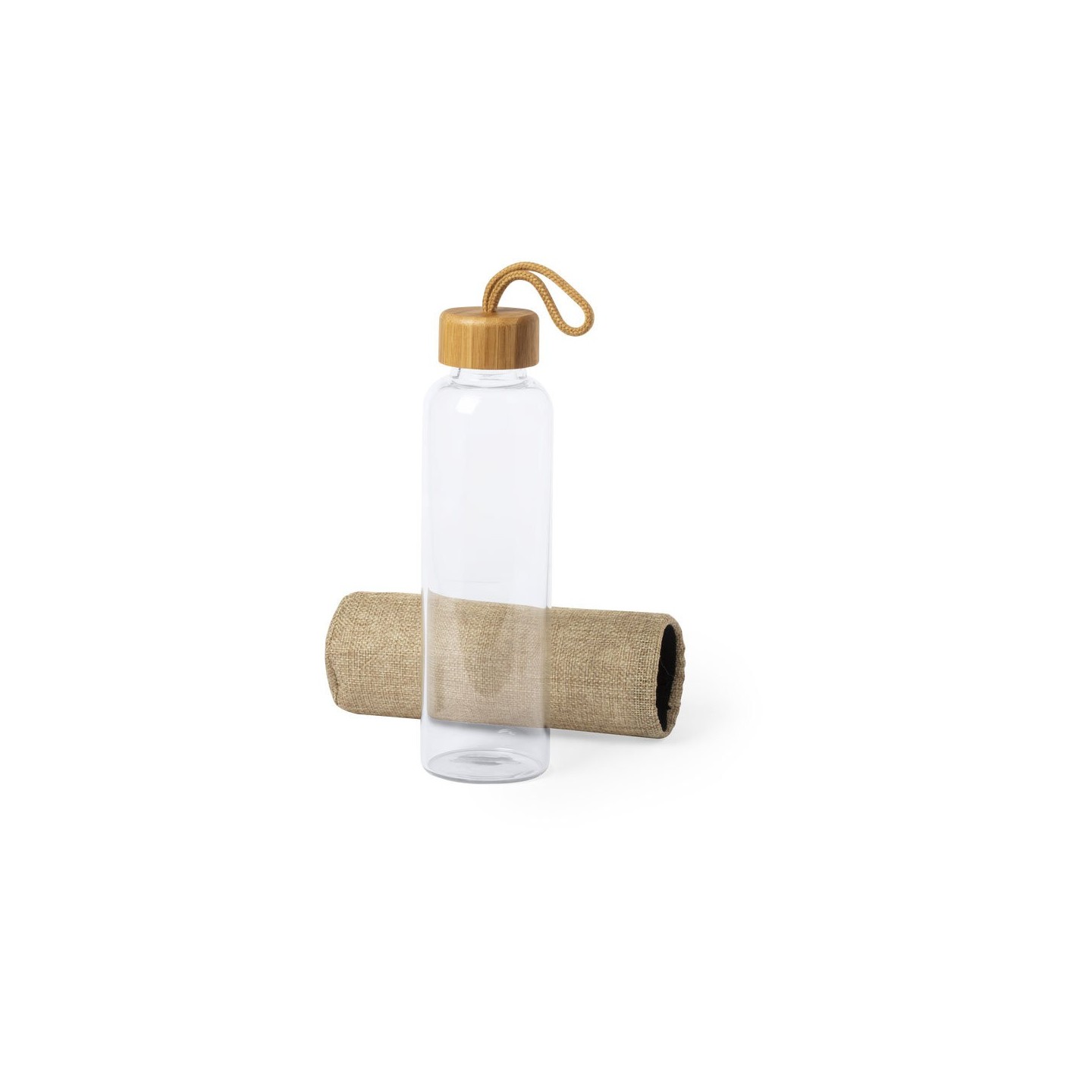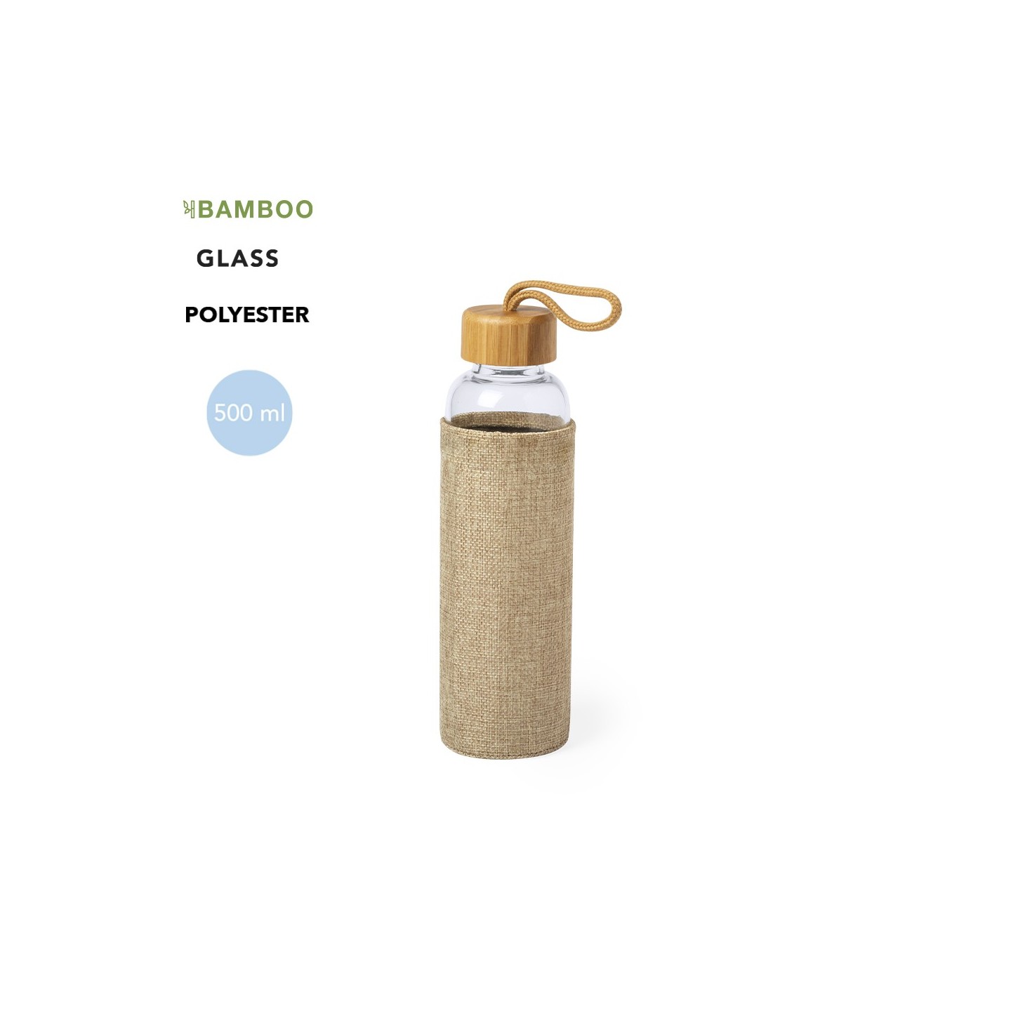 El Bidón Kasfol tiene una capacidad de 500ml en combinación de bambú y cristal. Tapón a rosca de bambú, funda eco y asa de transporte. Personalizable. Estilo natural y sostenible.