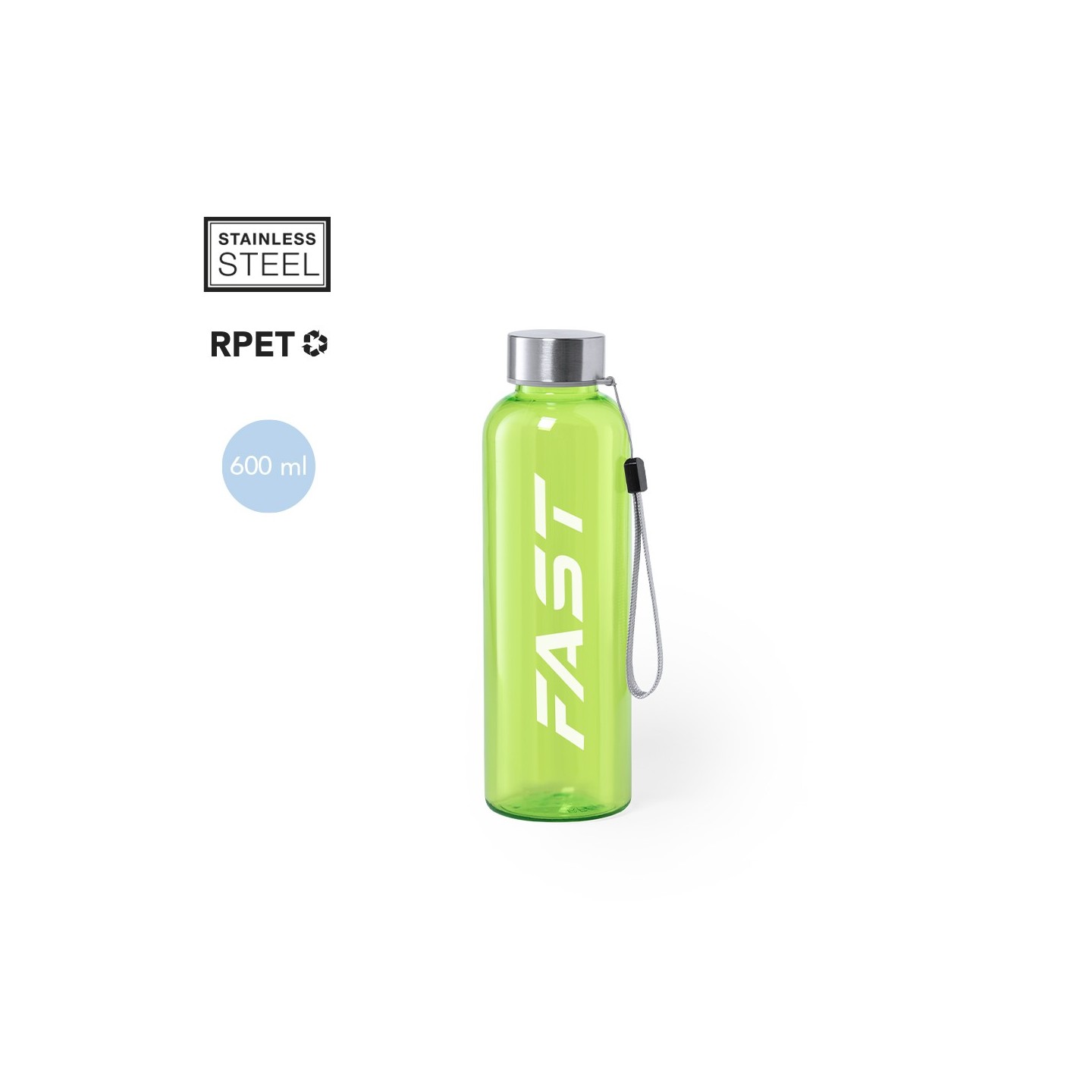 El Bidón Lecit tiene 600ml de capacidad. Libre de BPA, fabricado en RPET reciclado para una hidratación sostenible. Tapón a rosca en acero inoxidable. Personalizable.